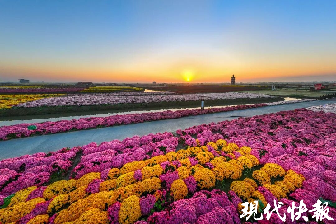 此时的兴化千垛景区,宛如打翻的调色盘,近千亩菊花田在垛田间绽放,金黄、淡粉、紫红,层层叠叠,与碧水蓝天相映成趣,步入这样的画卷,很是惬意。这儿的垛田犹如足球场上的战术板,一块块被碧水环绕,游客可以乘一叶扁舟,像球员带球突破般在花田中灵活穿行。