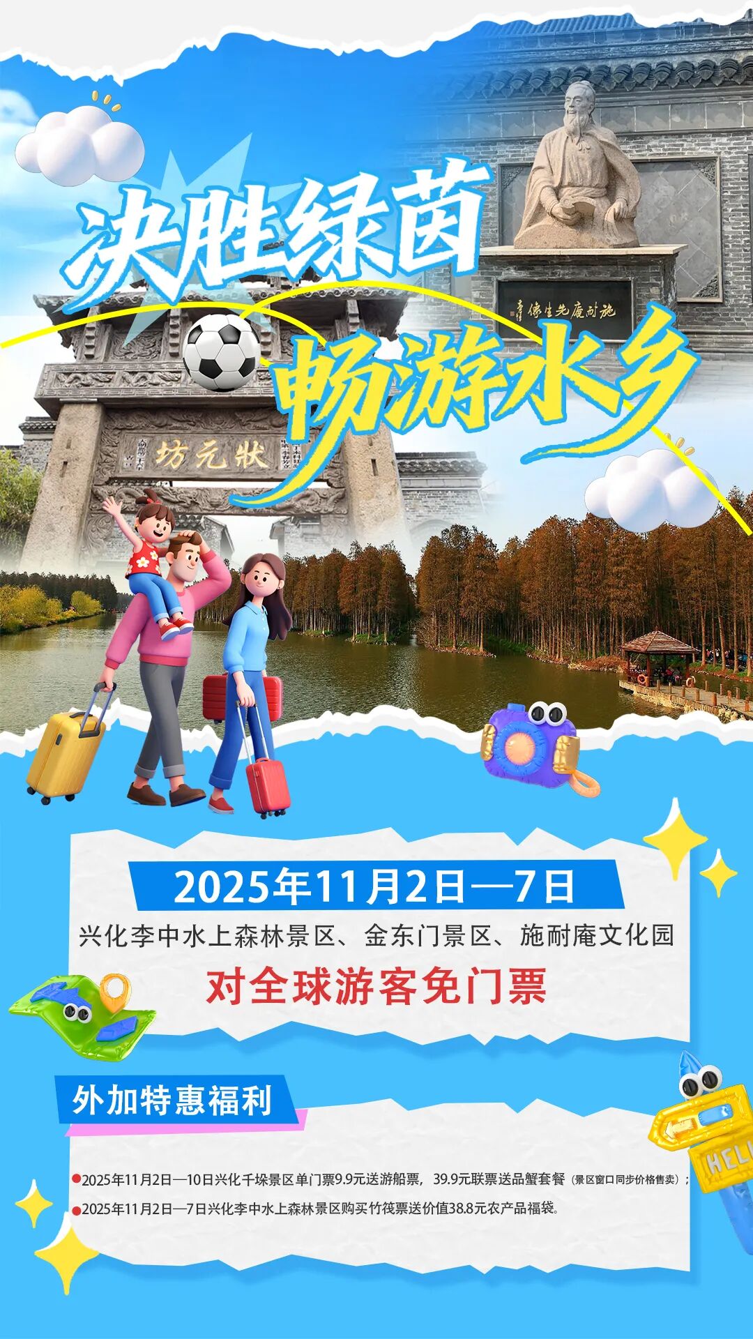 11月1日,苏超总决赛战鼓擂响,泰州队与南通队将上演巅峰对决。江苏兴化文旅放大招,向全球游客推出免门票+特惠福利的“足球+文旅”超值大礼包,点燃全城热情。