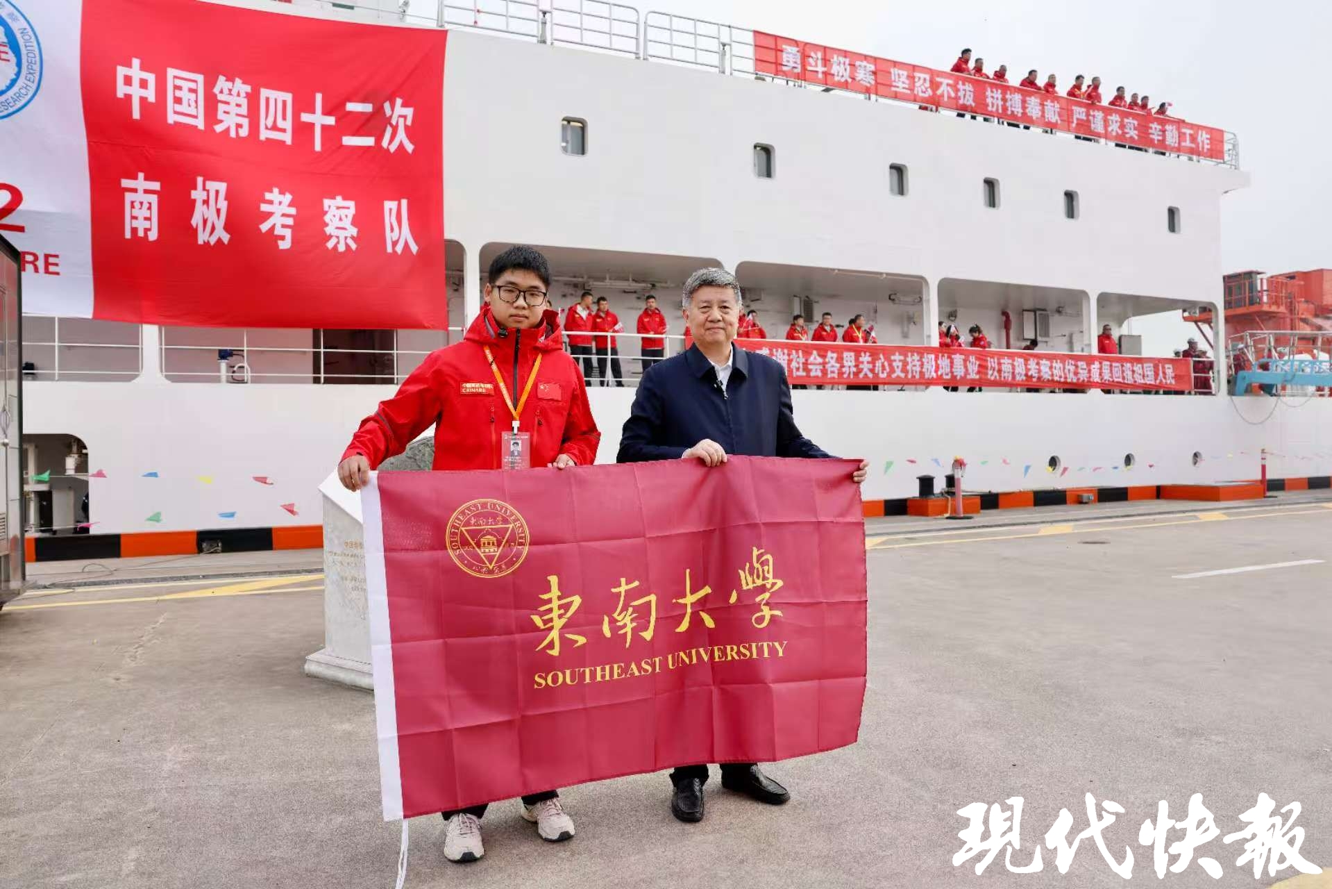现代快报讯(通讯员 吴涵玉 记者 李楠)11月1日上午,上海极地考察国内基地码头,“雪龙”号和“雪龙2”号科考船的汽笛声划破长空。东南大学自动化学院2025级博士生许银辉与送行的师长告别后,稳步踏上舷梯,登上“雪龙2”号。随着船身缓缓驶离码头,许银辉正式开启中国第42次南极科考征程。