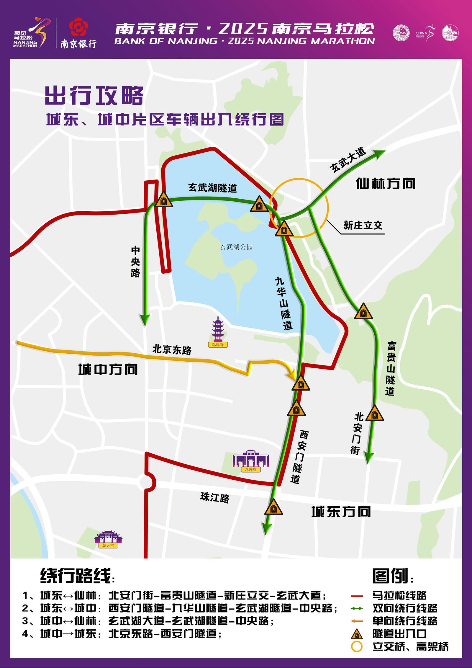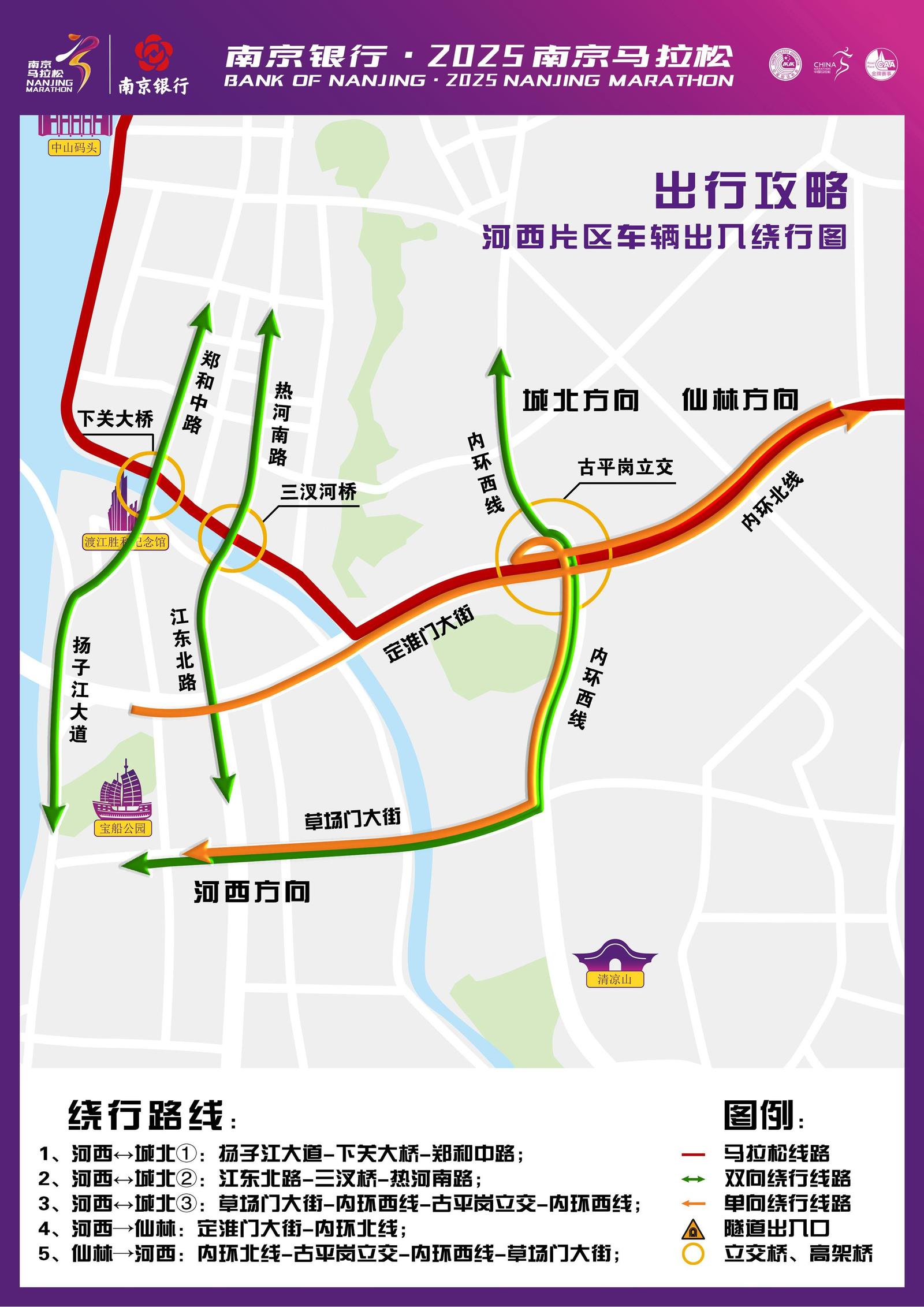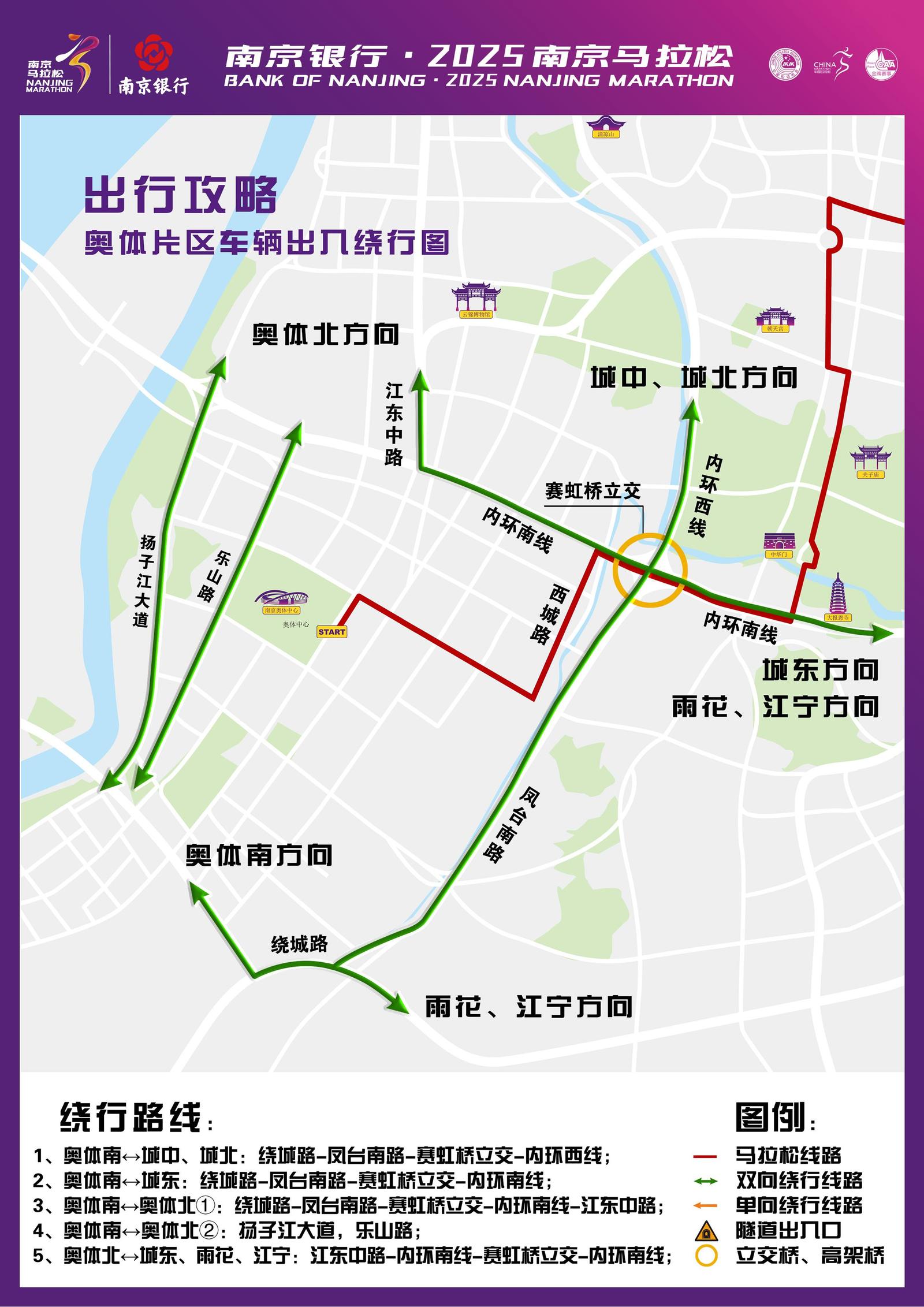 同时,受赛事交通管控影响,建议比赛当日上午,自驾过江车友尽量选择八卦洲长江大桥、大胜关长江大桥通行,主城区井字快速内环交通压力较大,请车友关注实时导航,尽量选择市内公共交通出行,尤其江北市民过江尽量选择地铁3号线、10号线出行。