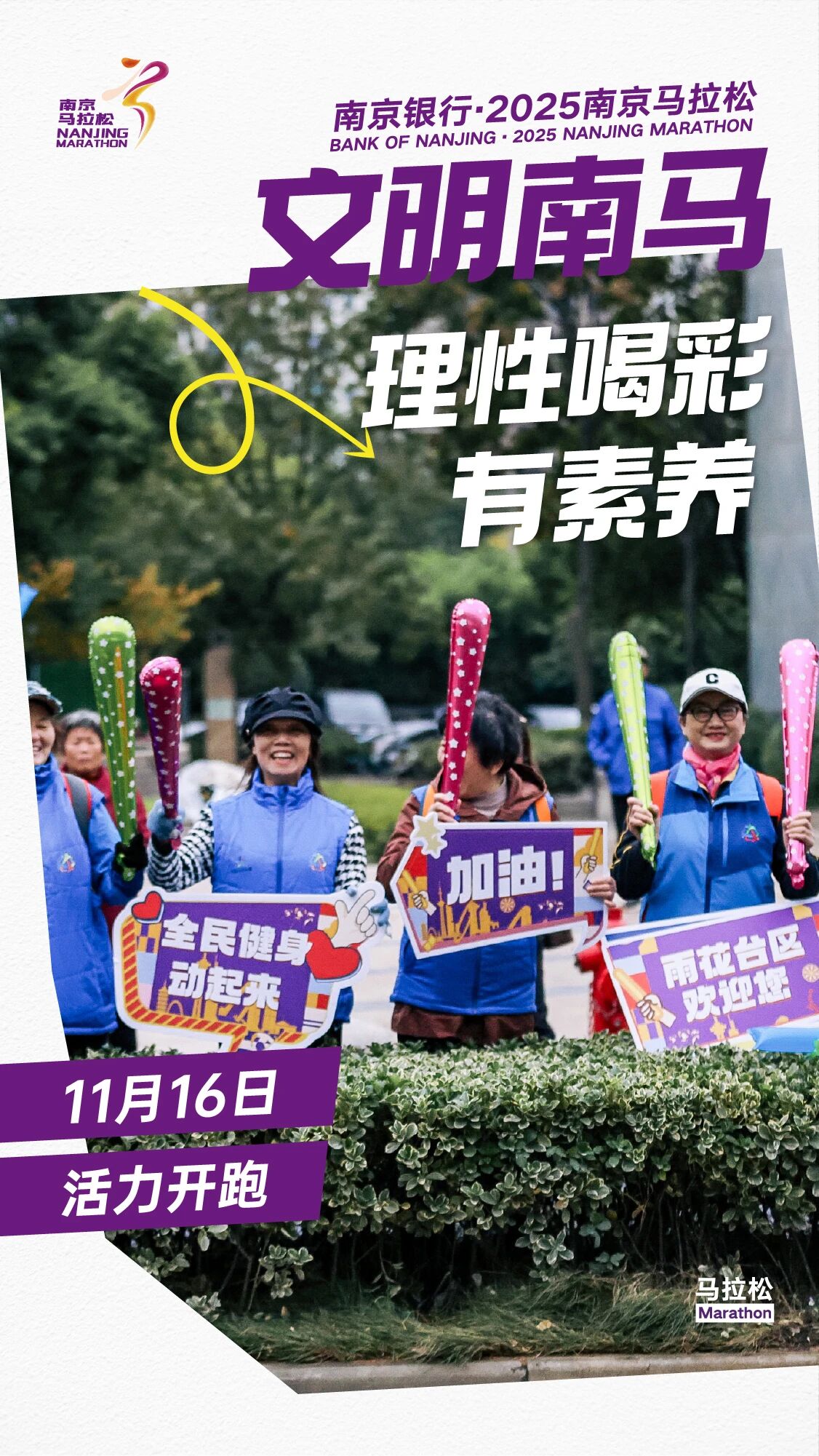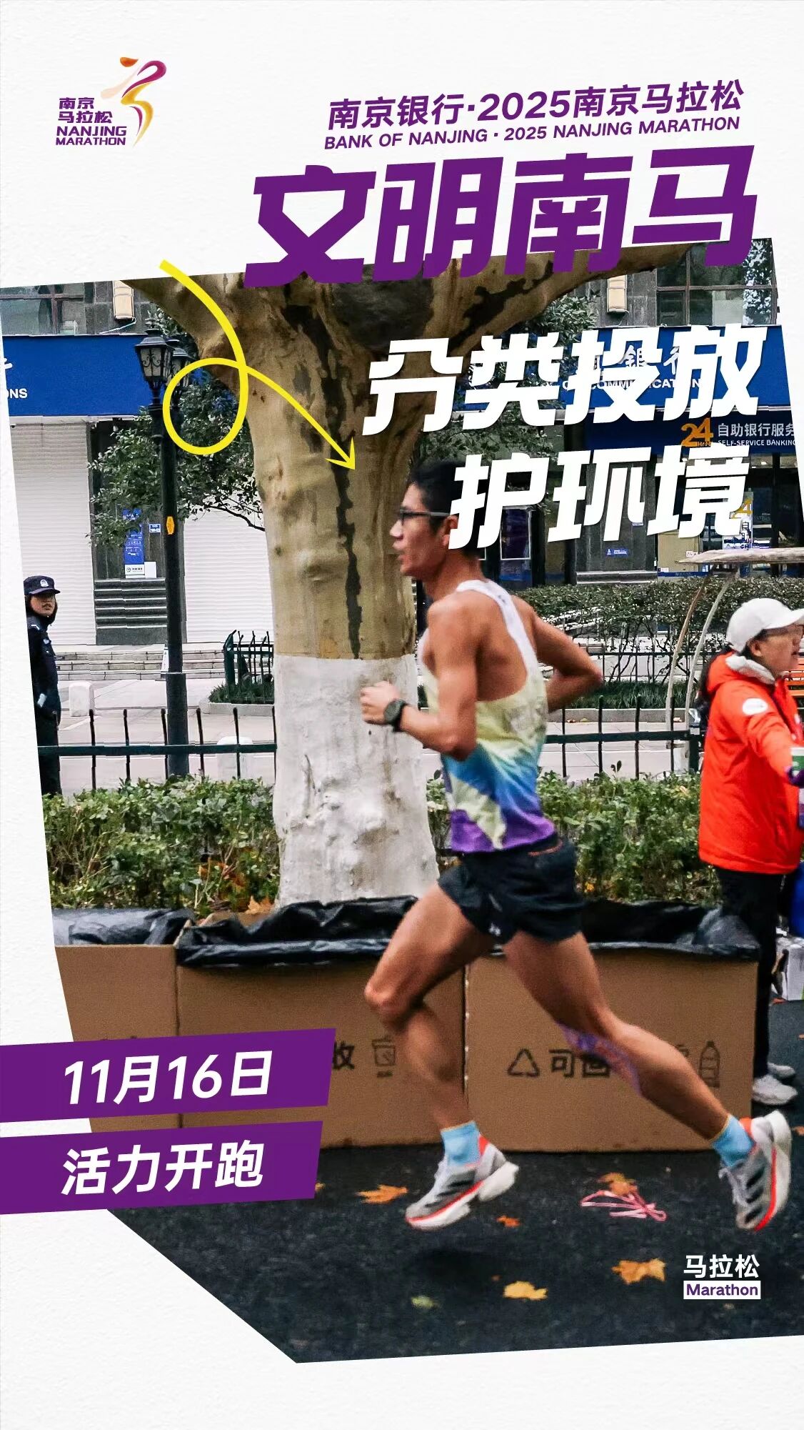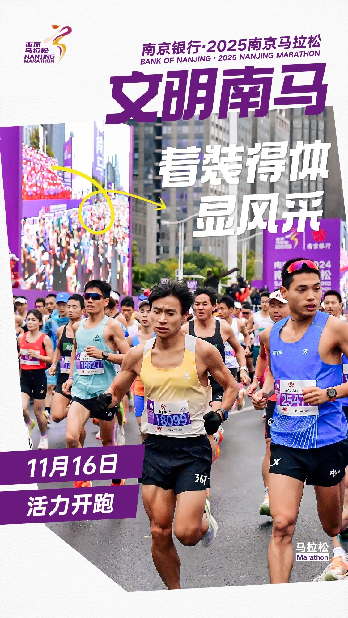 为确保赛事安全、有序、和谐举办,让这场体育盛会成为展现南京城市风貌与市民素养的窗口,组委会向全体参赛者与市民朋友们发出倡议:着装得体显风采、如厕有序守礼仪、分类投放护环境、合规参赛更安心、循标前行不迷路、轻装参赛畅奔跑、依规观赛保安全、理性喝彩有素质、协助引导显担当。