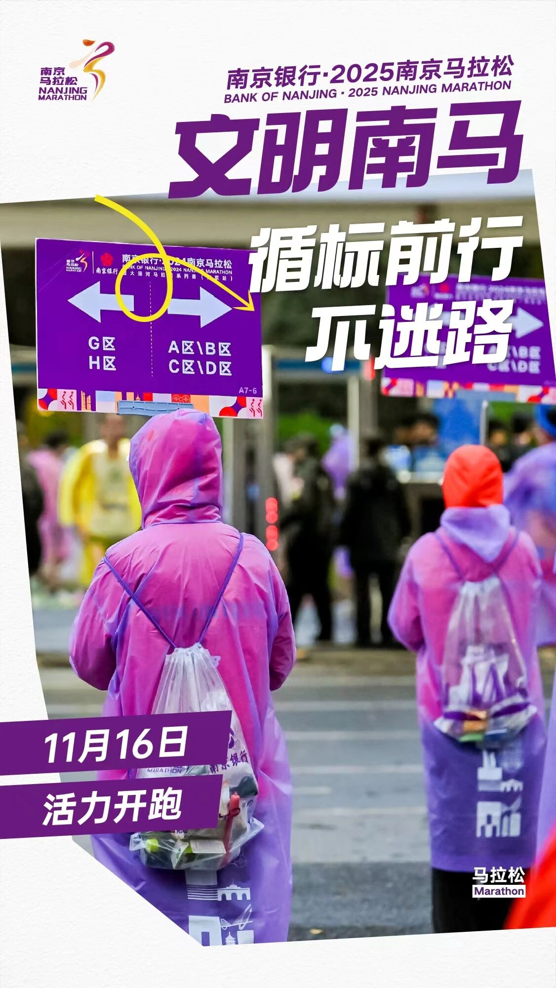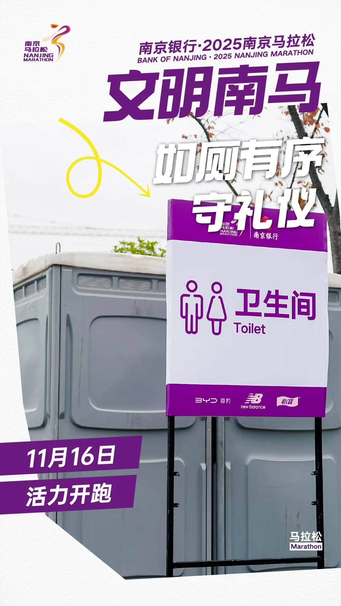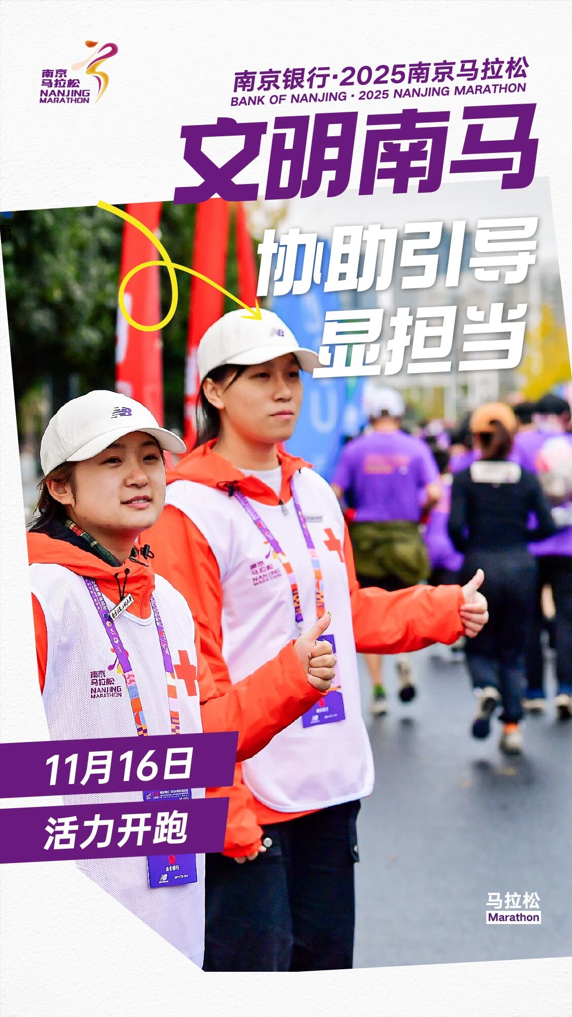 为确保赛事安全、有序、和谐举办,让这场体育盛会成为展现南京城市风貌与市民素养的窗口,组委会向全体参赛者与市民朋友们发出倡议:着装得体显风采、如厕有序守礼仪、分类投放护环境、合规参赛更安心、循标前行不迷路、轻装参赛畅奔跑、依规观赛保安全、理性喝彩有素质、协助引导显担当。