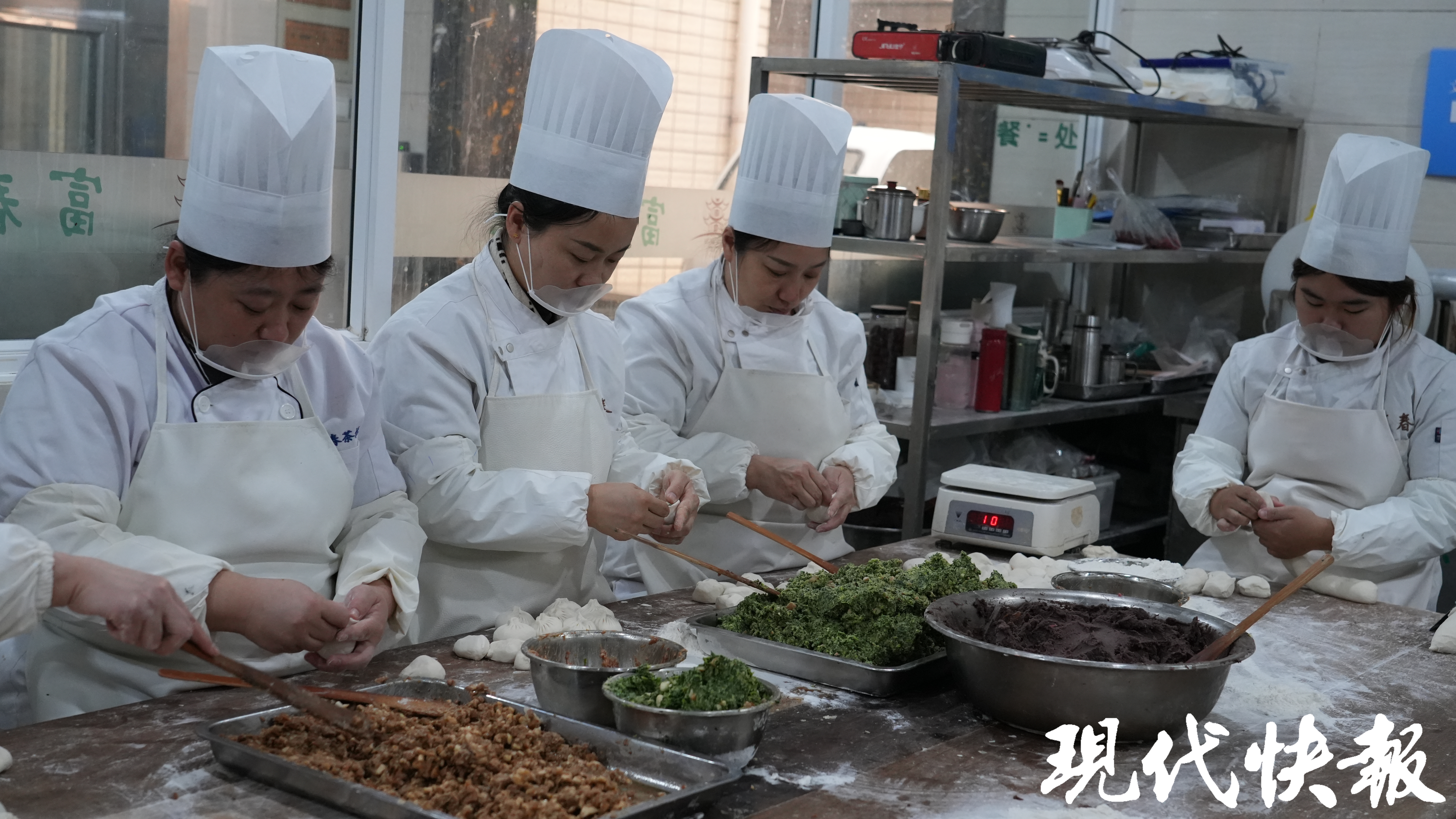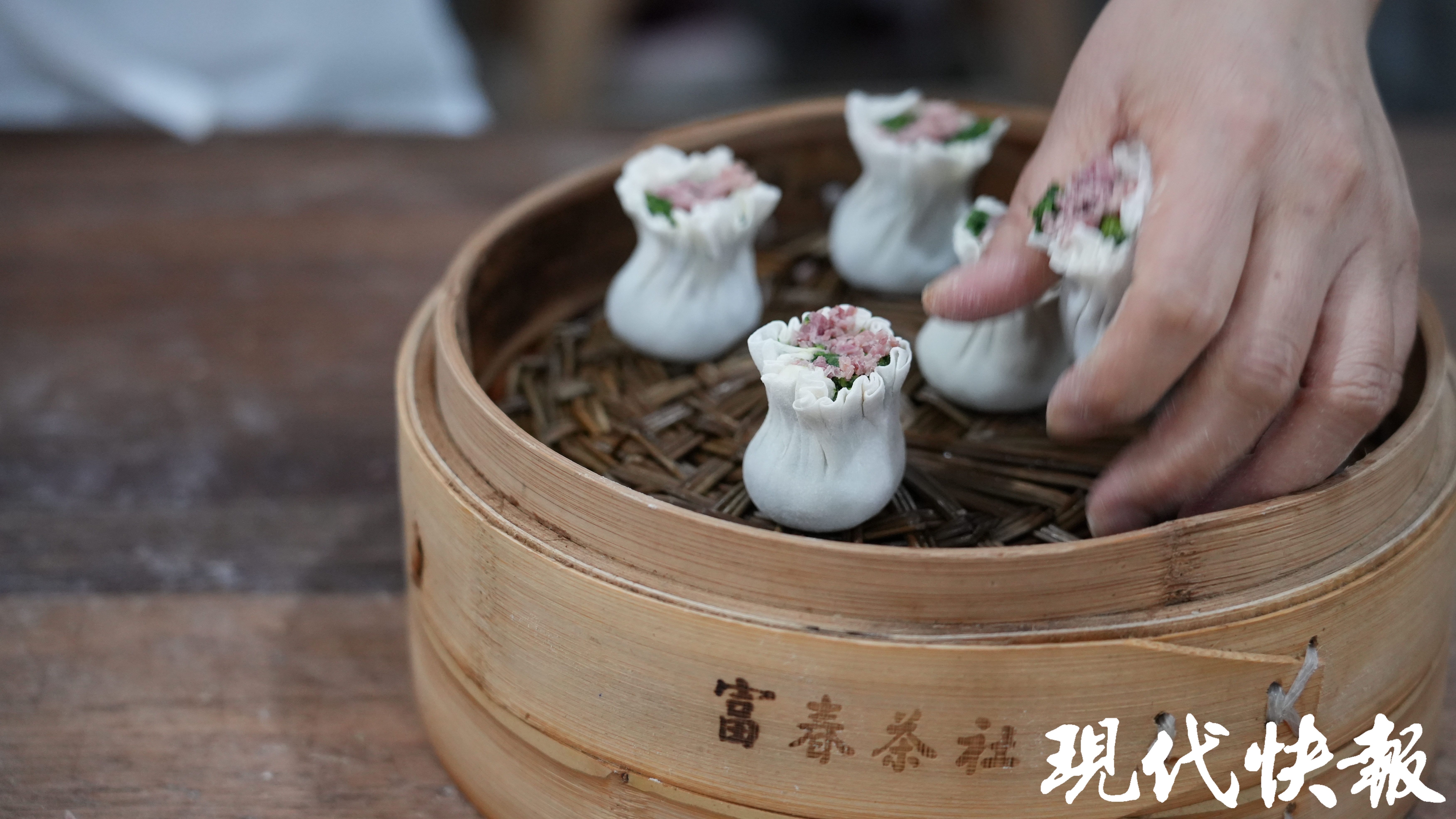 面对现代快报记者的镜头,中国烹饪大师、富春茶点制作技艺代表性传承人叶千金展示了翡翠烧卖的制作技艺。