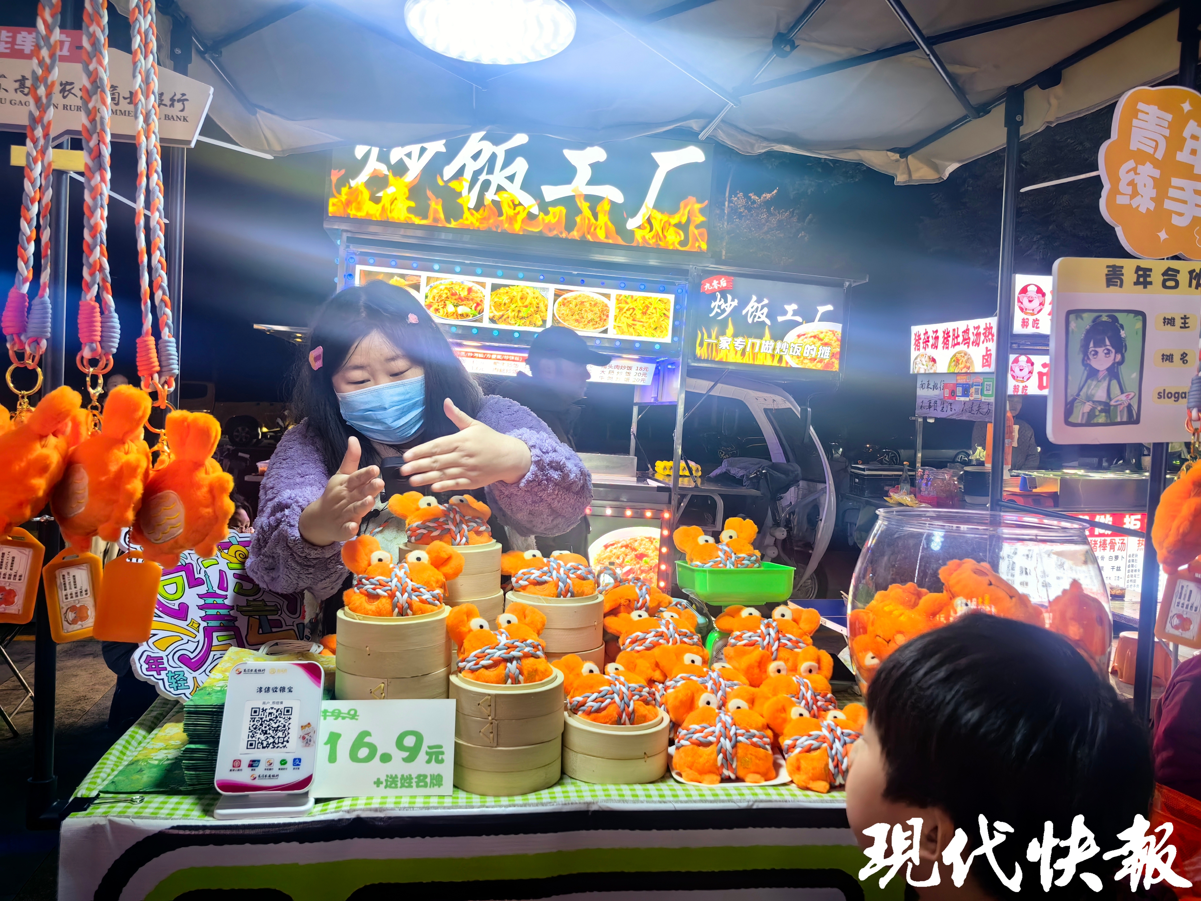 “新鲜螃蟹现捞现捆现蒸哦,您挑选的是‘我有钳’螃蟹,祝您前程似锦。”摊主三月一边说道,一边将文创螃蟹上“锅”蒸煮,情绪价值拉满。三月告诉现代快报记者,她是上班族,最近爱上了“练摊儿”,每天下班后便前来摆摊。不仅获得固定摊位,摊位推车还可在营业结束后享受免费仓库存放。“以前想练摊儿也没处可去,现在有了固定摊位可以来卖文创螃蟹。”