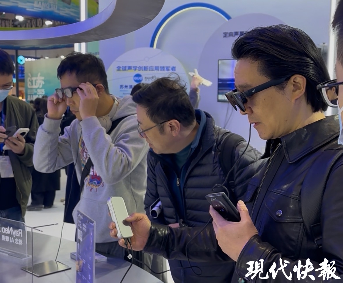 “戴上感觉就像进入影院一样”“好沉浸的体验”,围绕着“数智引擎”板块的中心,摆放着几副别致的眼镜,但凡戴上体验的观众都惊叹连连。雷鸟创新市场部张经理介绍,这副“雷鸟Air 4系列”AR眼镜就像一个随时随地为你打开的影院,戴上它,眼睛就会进入一个沉浸式的视听世界,刷剧、玩游戏都可以。“现在我们也在江苏落地了一些产线,正是凭借着长三角产业链的优势,我们才能更快地乘风起航。”