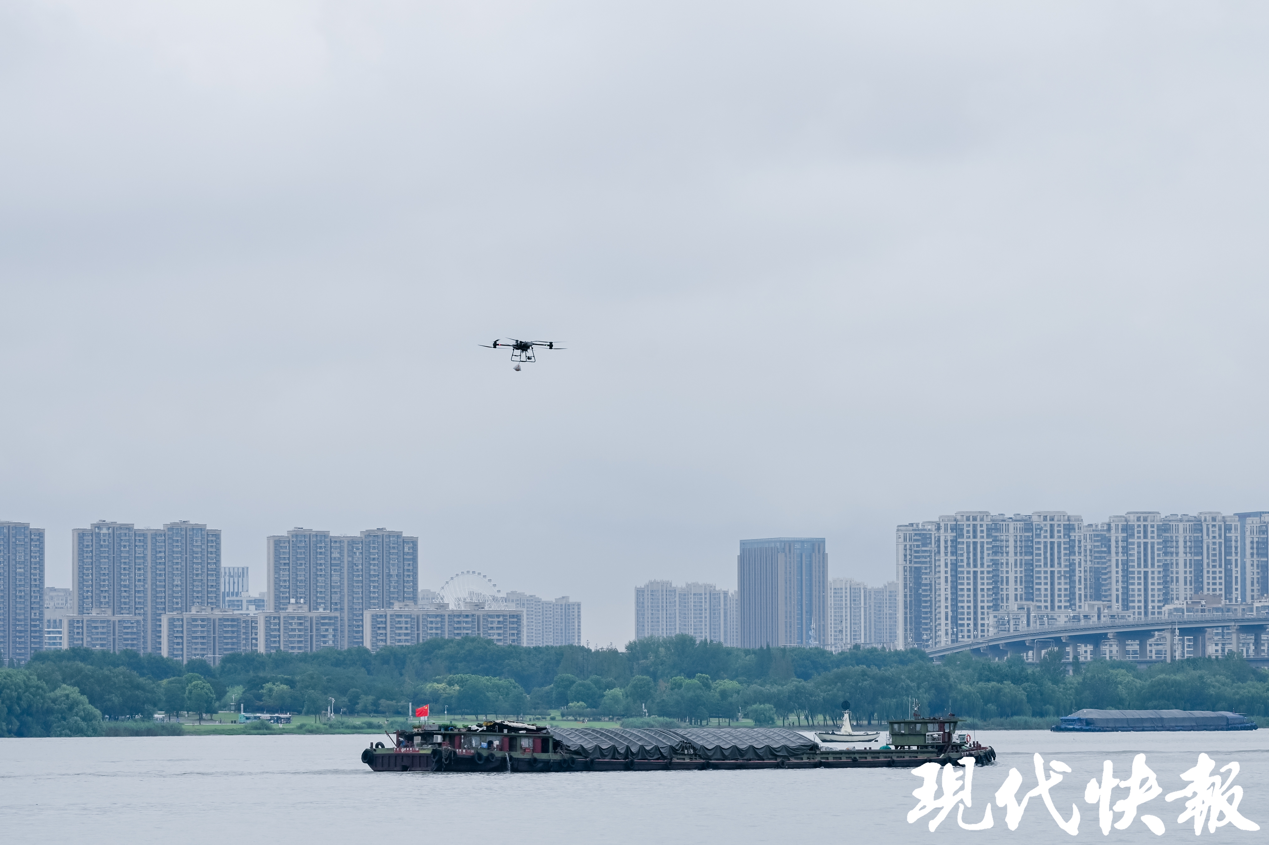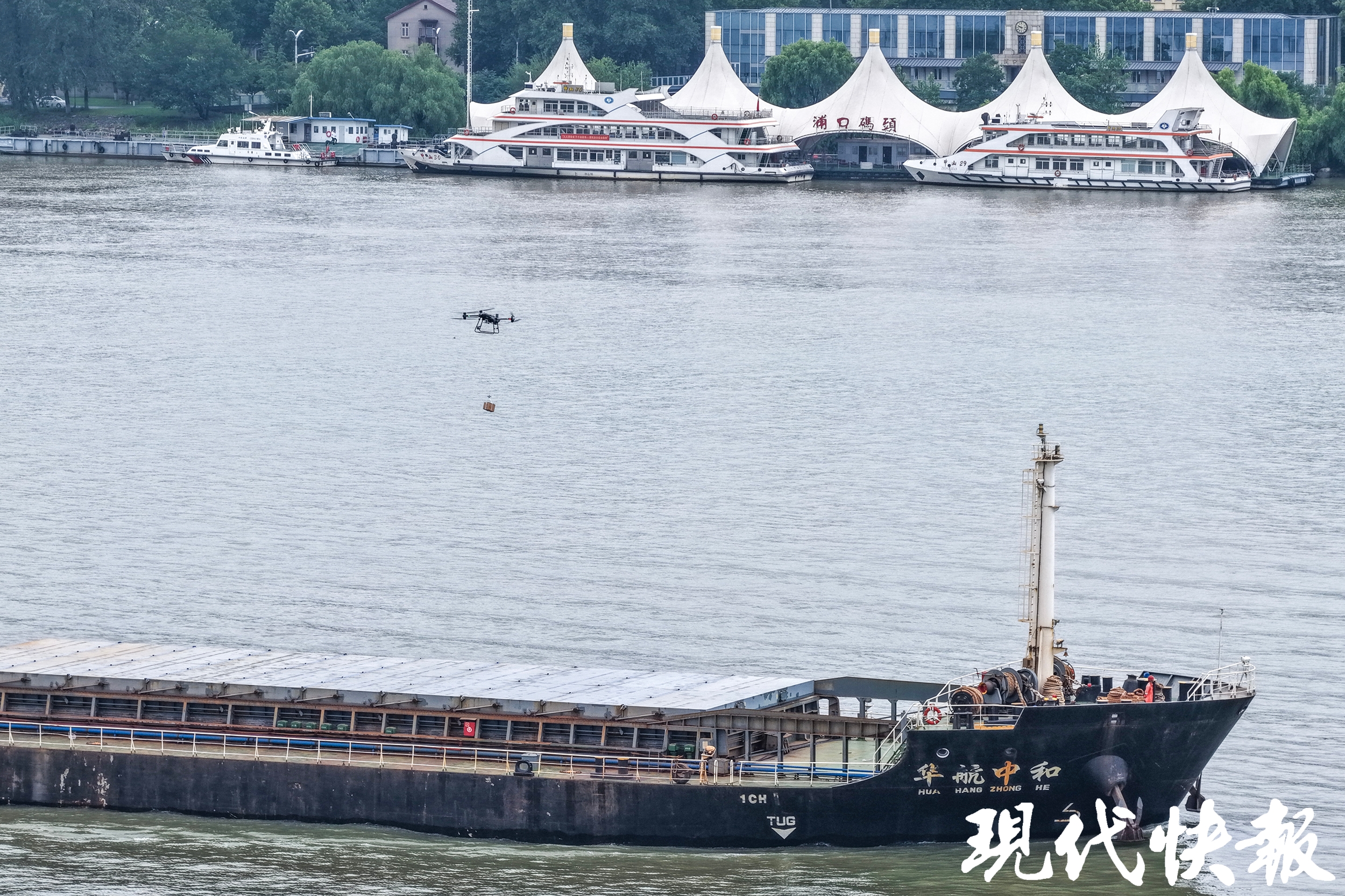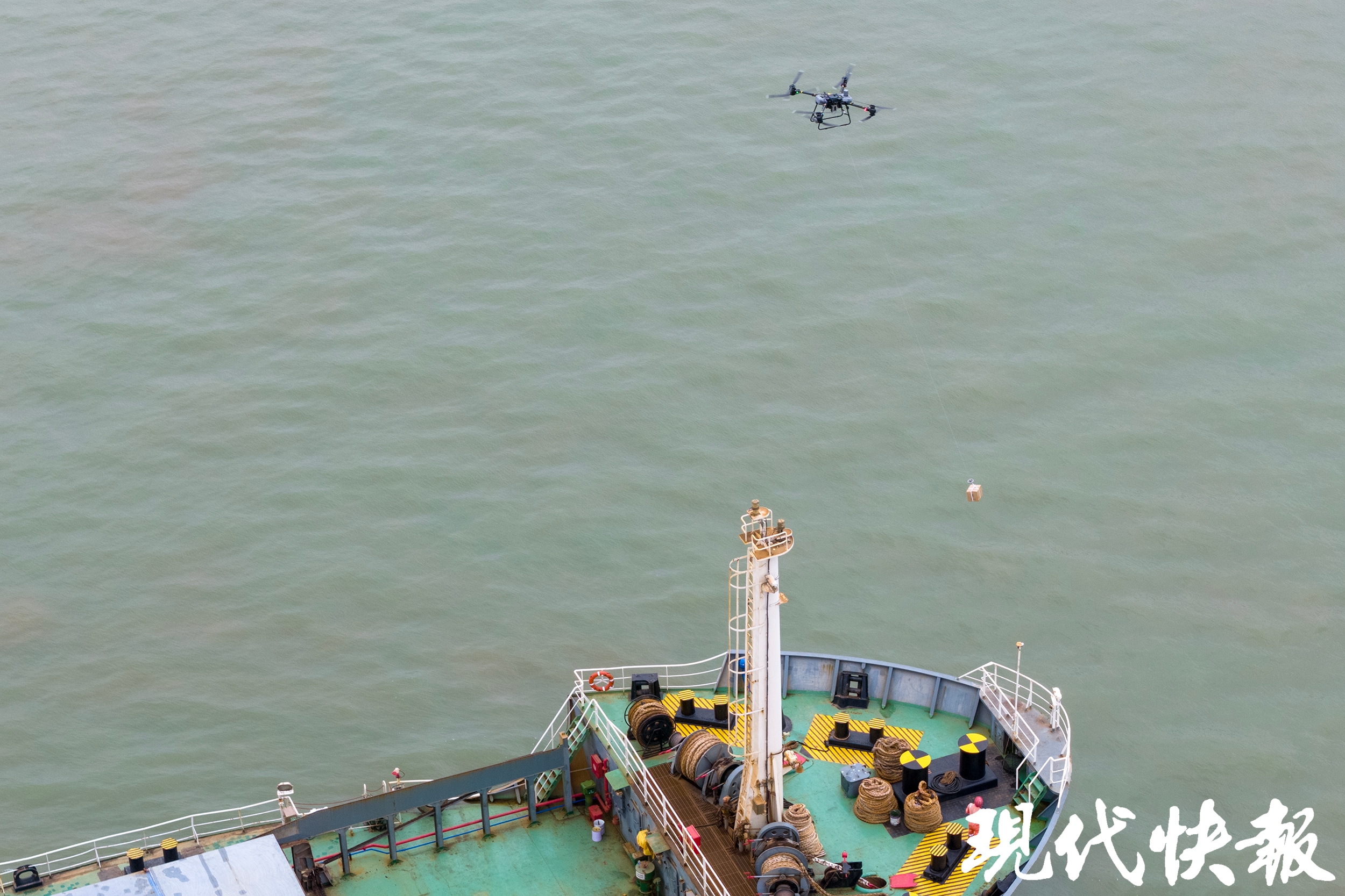 现代快报记者了解到,江翼达飞行基地是江苏长江汇科技有限公司(以下简称“长江汇”)在海事等部门的协助下,利用趸船建设而成。该基地通过水岸联动为过往船舶提供“汇闪送”等服务,从而提高船民的生活质量。