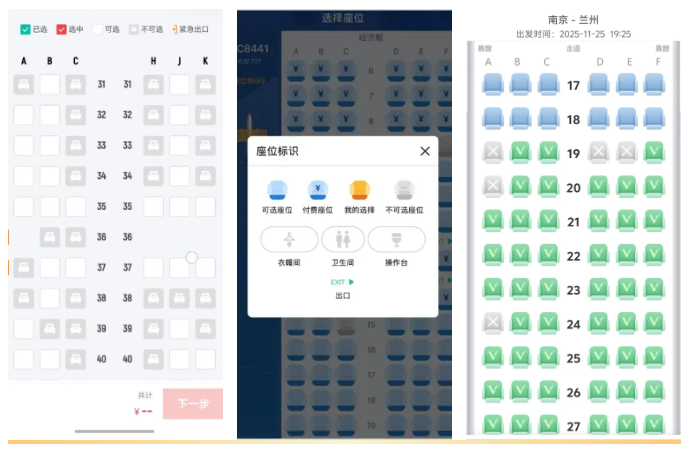 四川航空、山东航空、春秋航空选座页面