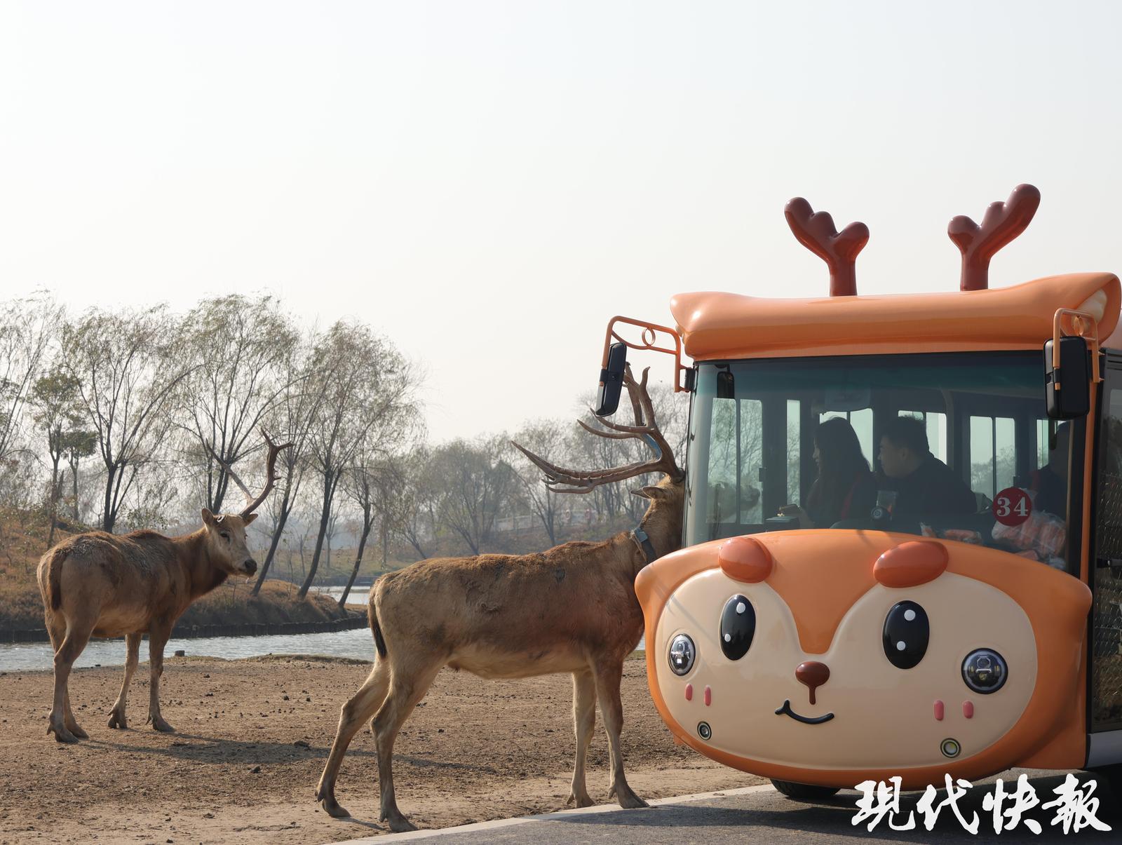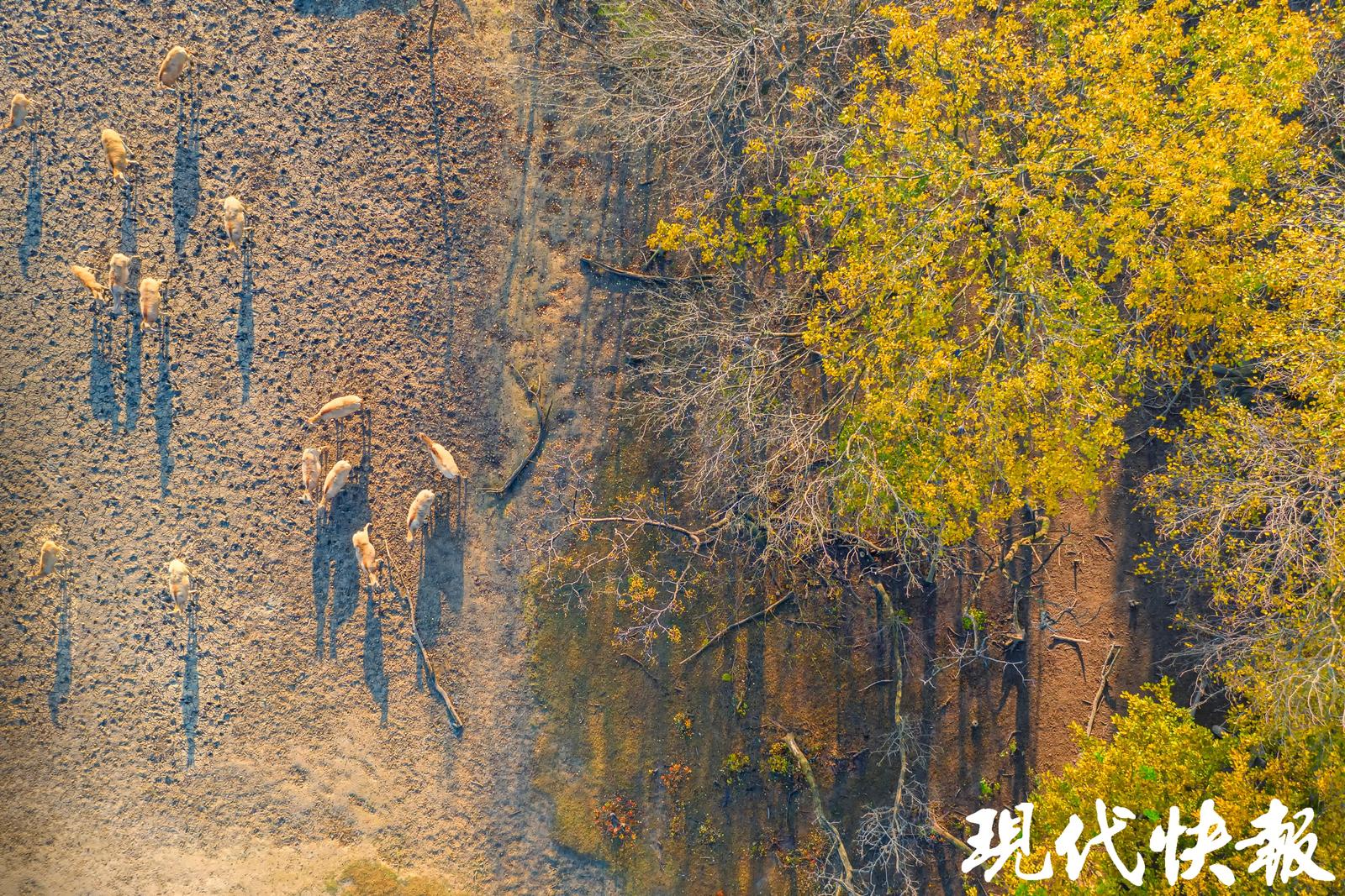 它们慢悠悠地在金滩上散步,吸引着观光车上的游客拍照喂萝卜。还有专心干饭的麋鹿,正与鸟儿们分享着美食。