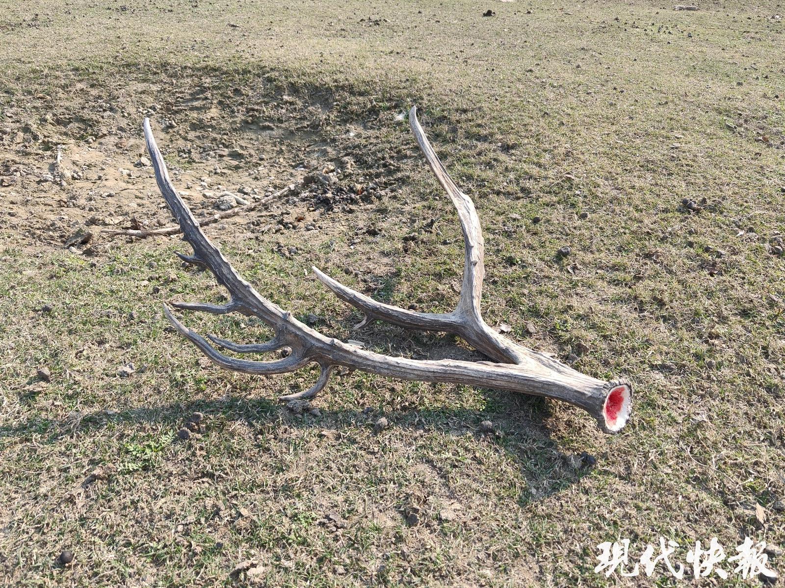 据悉,鹿角是雄鹿争夺繁殖权利和雌鹿选择雄鹿的装饰象征,更是防御天敌的武器。麋鹿脱角的时间会有所不同,受很多因素影响,比如气温、光照、自身年龄、身体状况、种群密度等。
