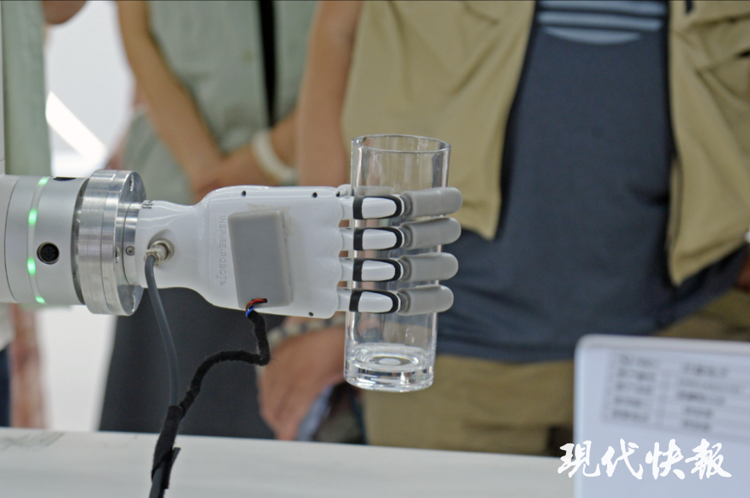 △日盈电子机器人搭载电子皮肤的机械手平稳拿起玻璃杯
