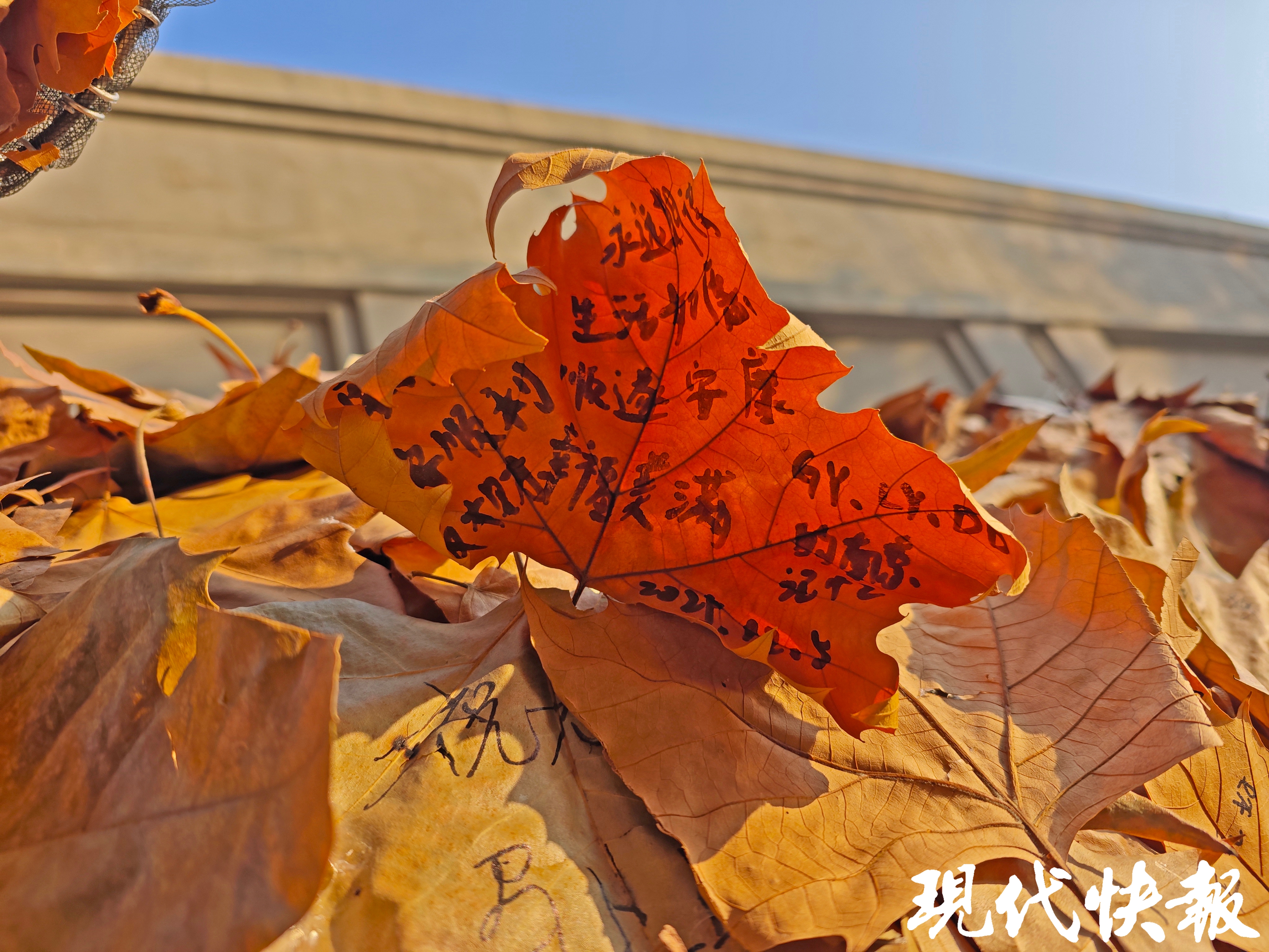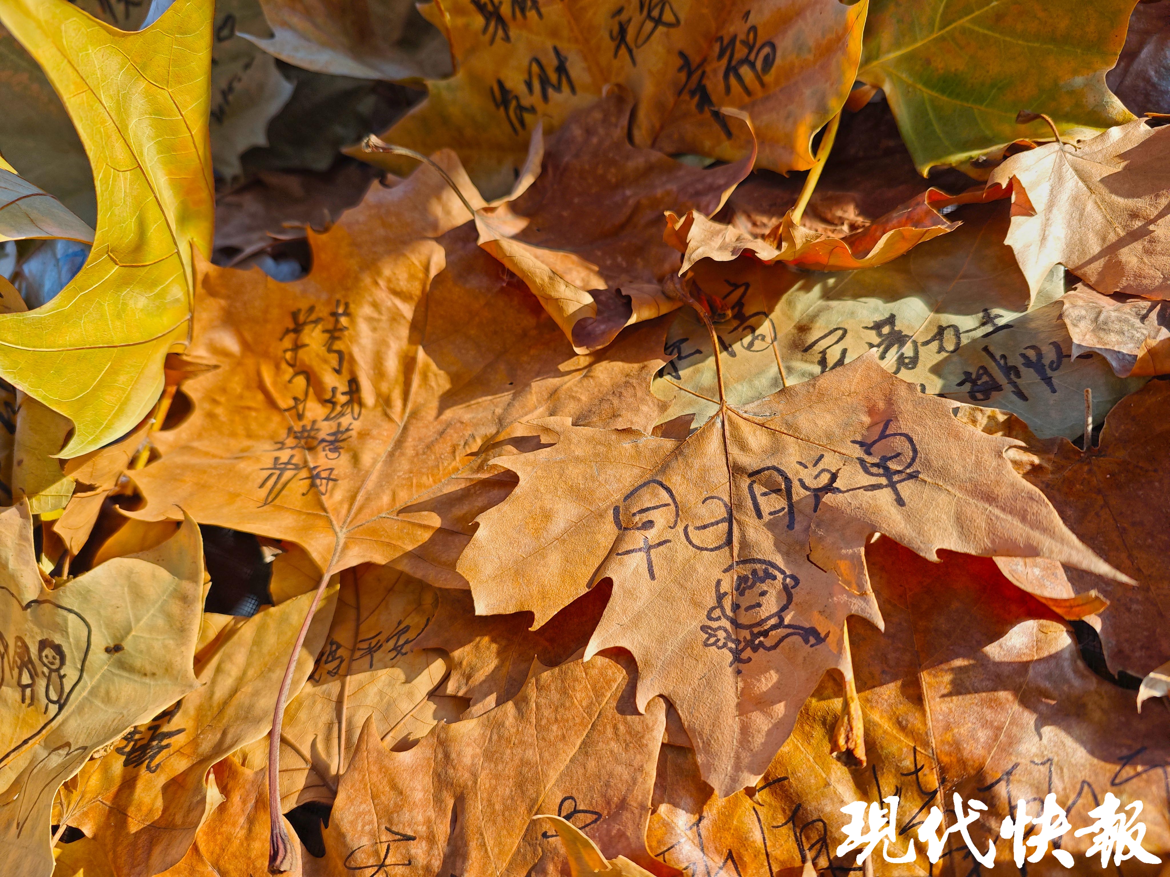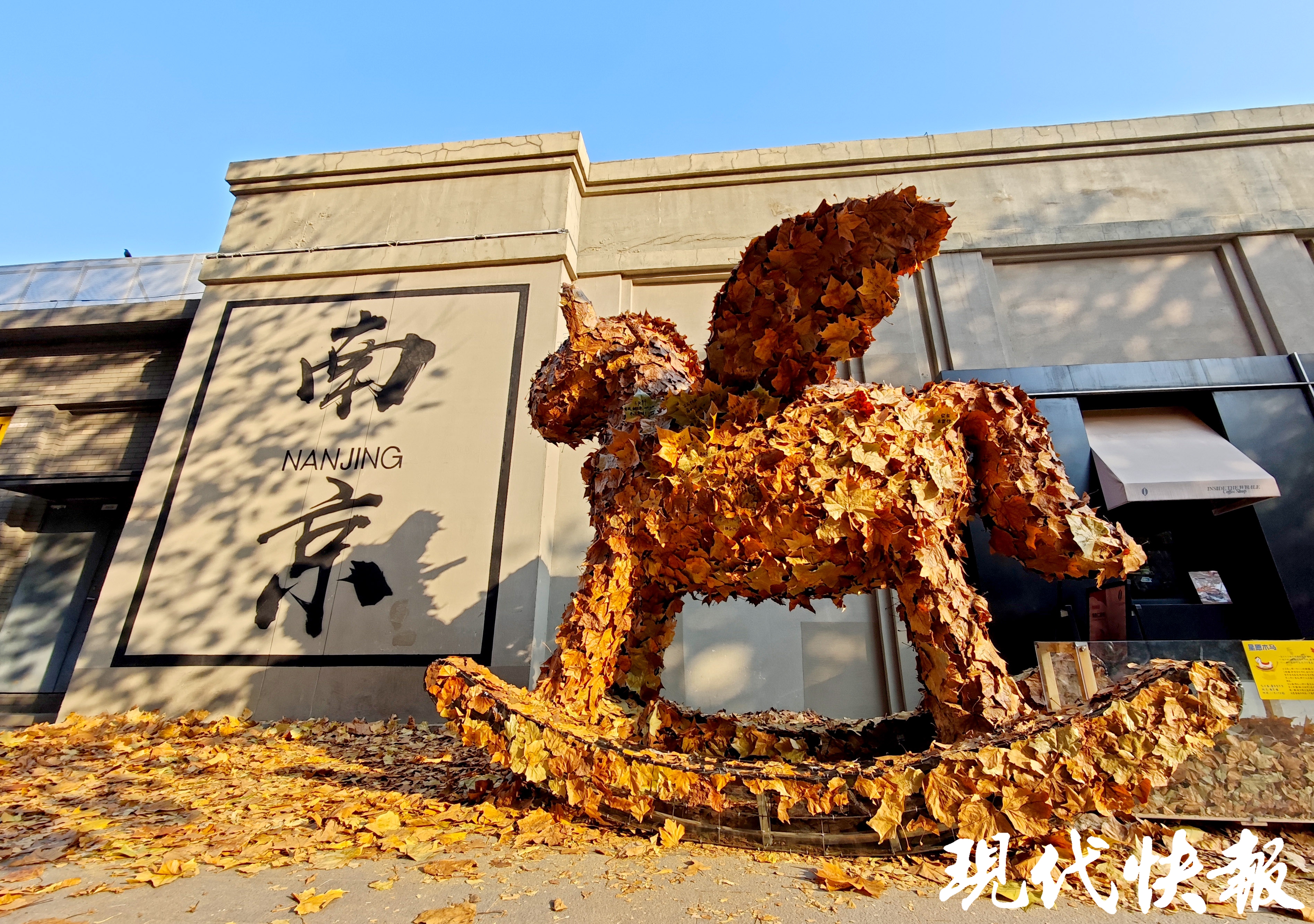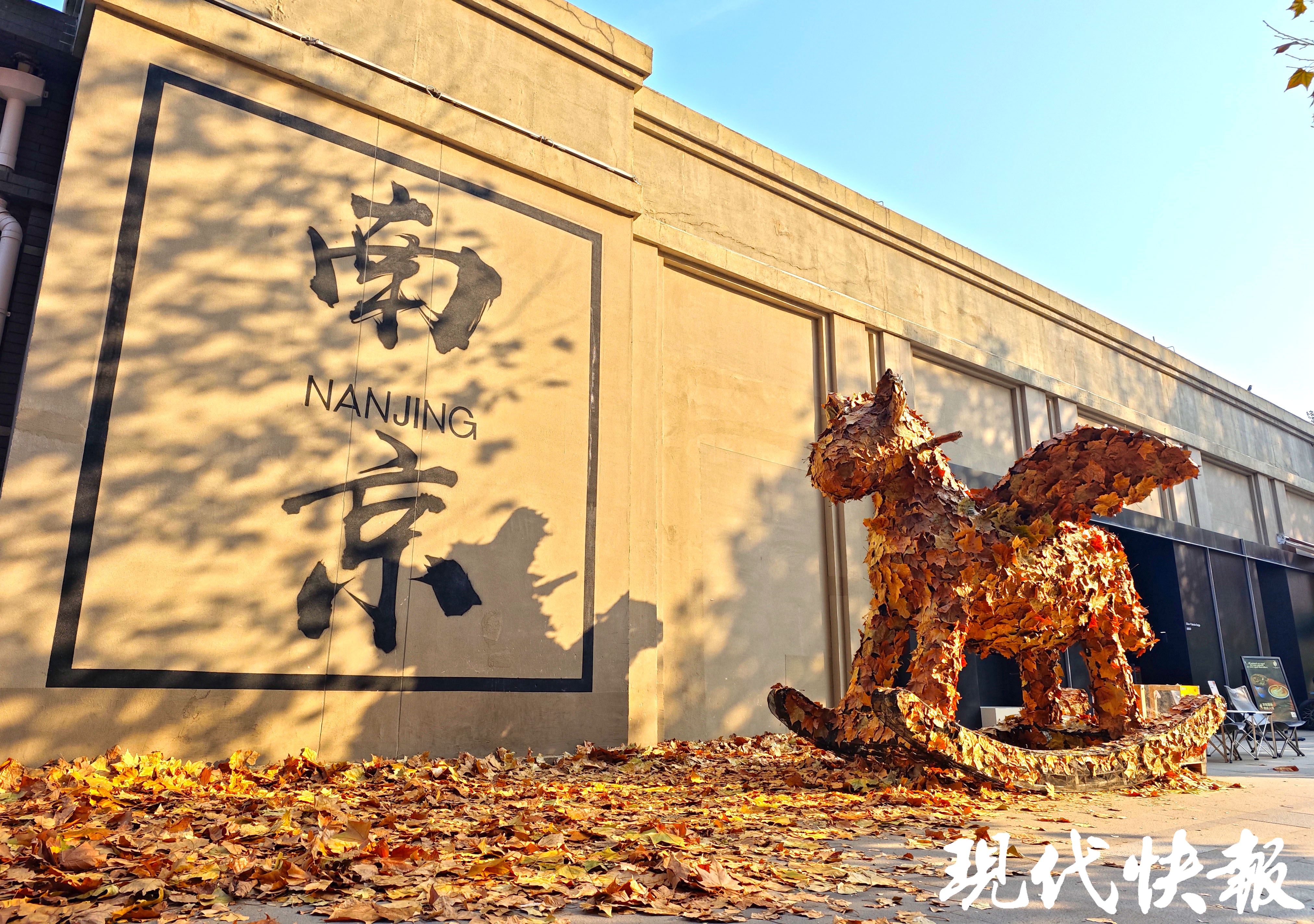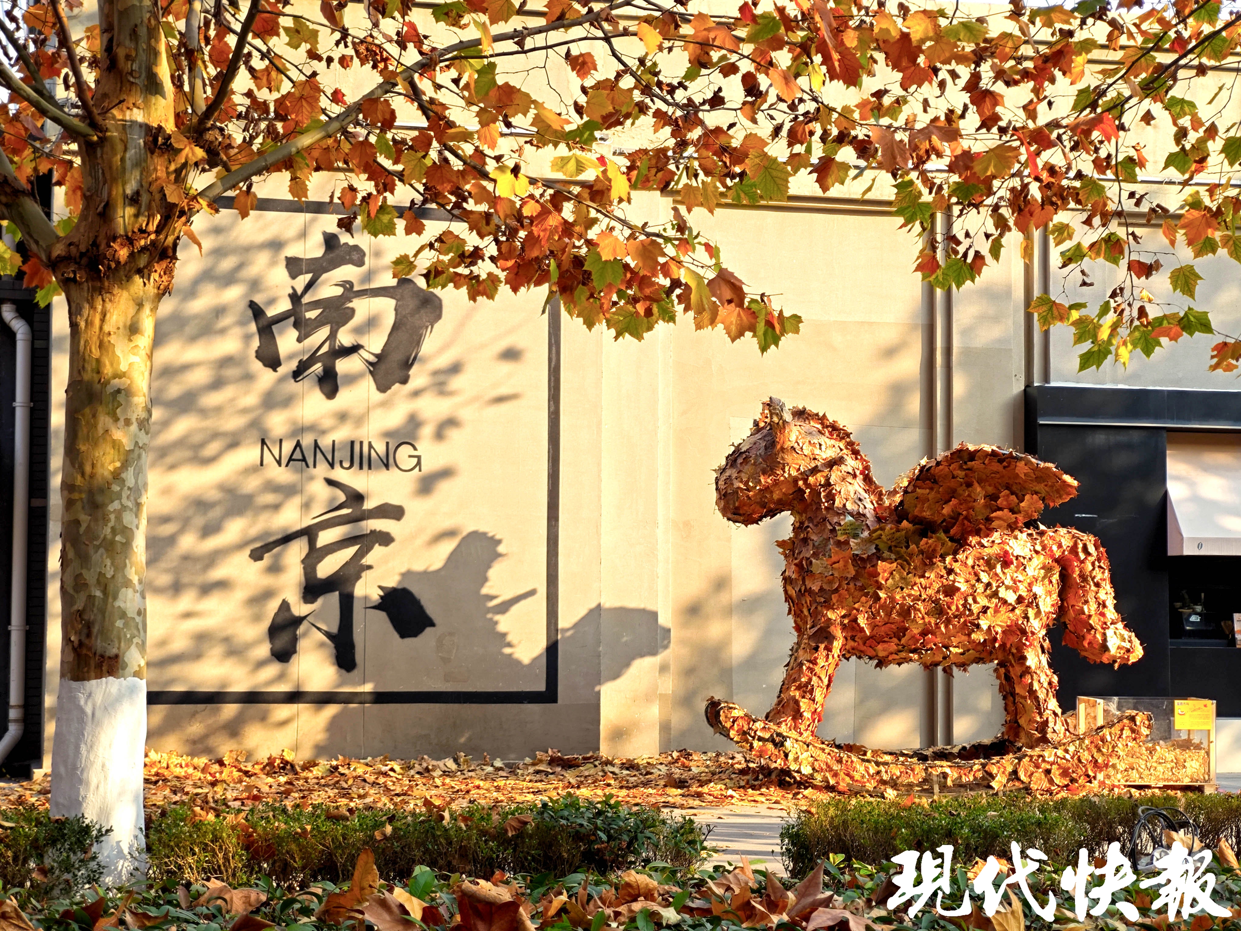 冬日的南京,晴天暖阳,斑驳树影下,苍劲有力的“南京”二字投影在灰色墙面上,意境十足。而一旁的“星愿木马”,却用落叶与心愿织就了一片温柔天地,引得不少市民游客驻足,大家将心底的期许写在落叶上,再贴到木马上。