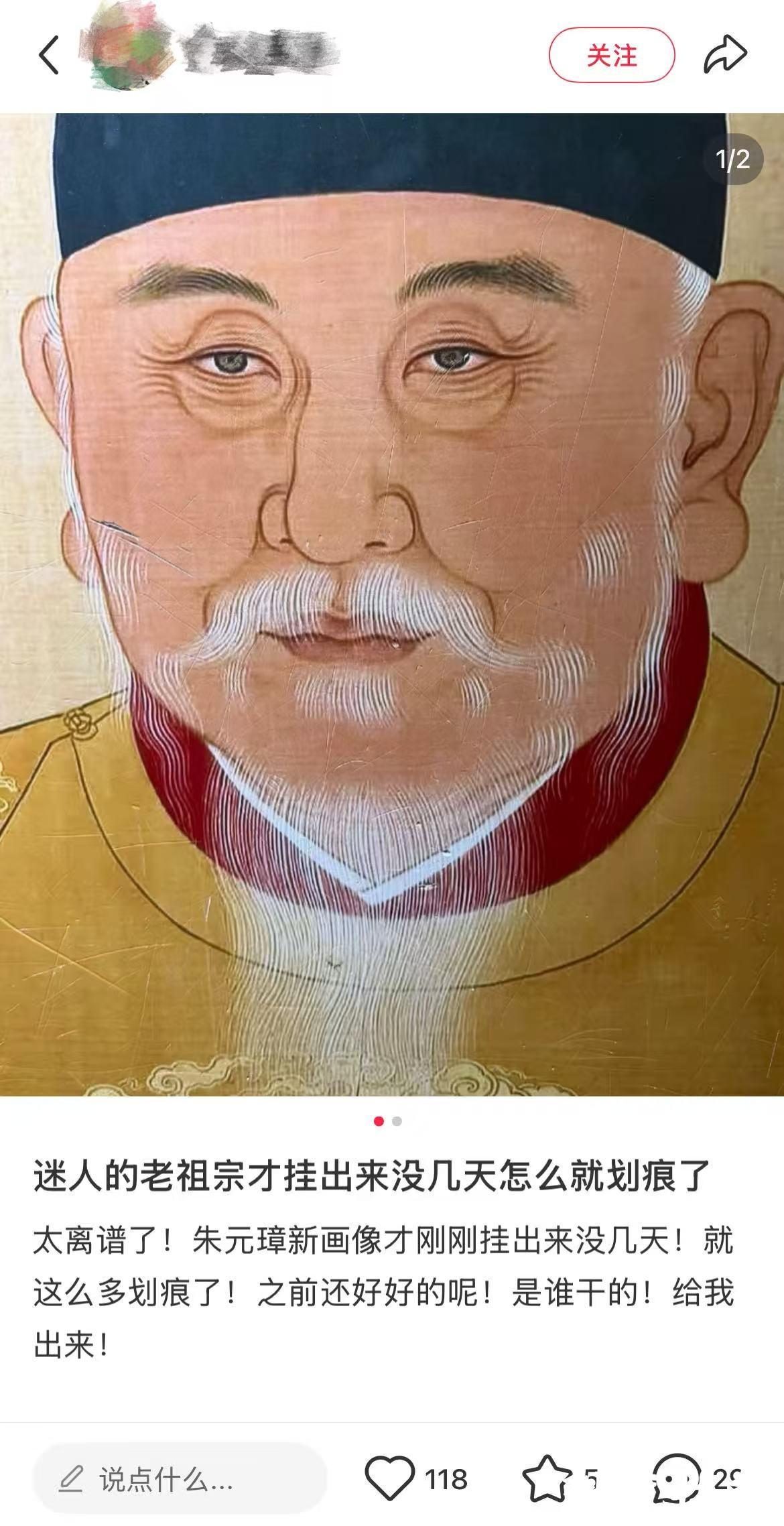 12月15日,现代快报记者实地探访明孝陵景区后发现,受损的不是正规画像,而是介绍景区的展板配图,位于明孝陵景区明楼室内空间,目前已经换上新做的展板。同时,记者注意到,明孝陵景区享殿墙上也挂有一张朱元璋“帅版”画像,该区域画像于2024年上半年更换,至今画像保护完好。