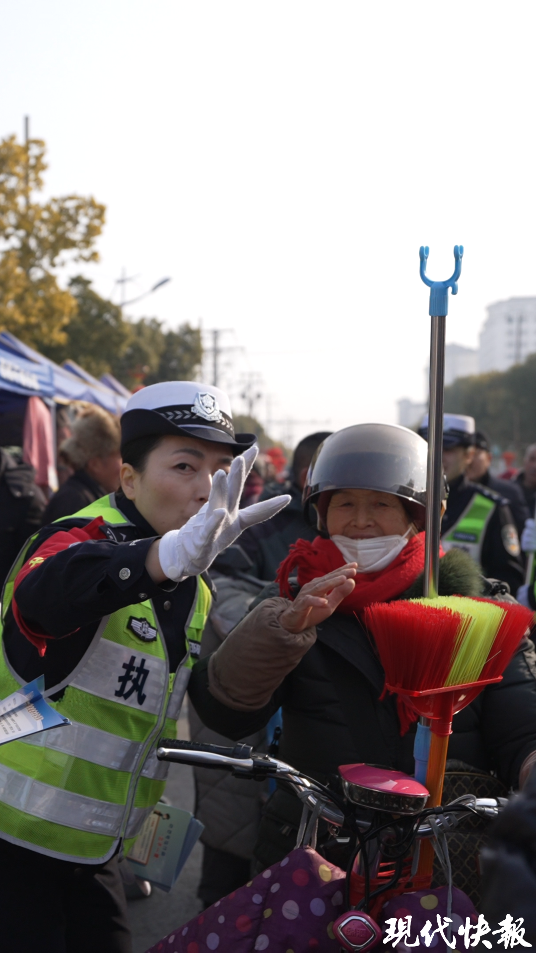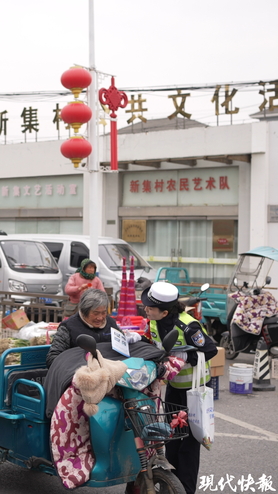农贸市场北门的人流最密,记者看到一名交警正蹲在一辆三轮车旁,帮老人在车上贴上菱形反光贴。这是集市“微治理”的寻常一幕,却藏着最朴素的温情。