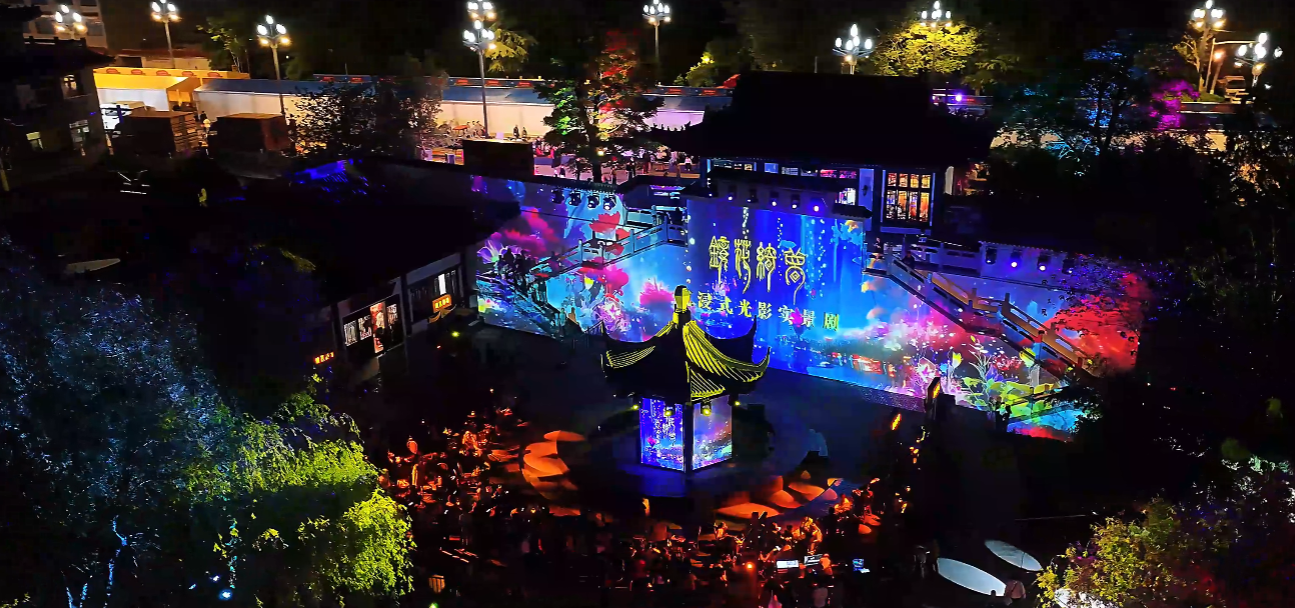 在双龙井文博园的夜空下,《镜花绮梦》以清代名著《镜花缘》为蓝本,将李汝珍笔下的奇幻世界照进现实。这部实景剧依托景区自然景观,运用巨幕投影、全息纱幕、环绕立体声等前沿技术,生动再现“瑶池仙境”的缥缈仙气、“深海战鲛”的震撼场面、“多国奇遇”的人生寓言,让观众瞬间沉浸在虚实交织的奇幻剧情中。