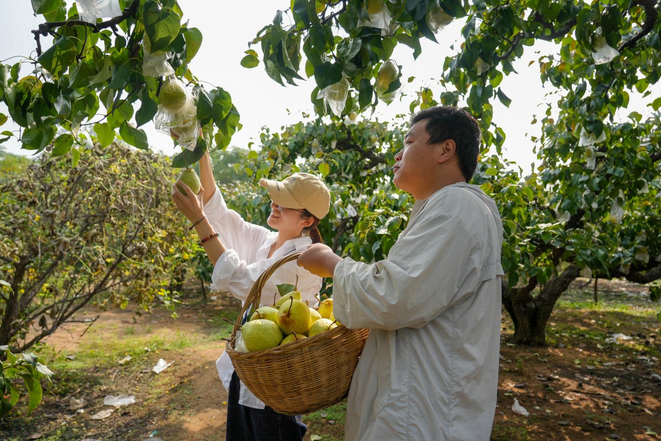 走进梨园,一派热闹景象扑面而来。果农们穿梭林间,熟练地采摘、分拣果实;游客们则手提果篮,或亲手摘梨体验劳作乐趣,或拍照记录金秋景致。“咔嚓一口满是清甜,还带着阳光的味道!”来自市区的游客王先生品尝后连连称赞,不少家庭更是拎着满满一篮果实,还额外订购几箱寄给远方亲友。孩子们在树下奔跑欢呼,情侣们定格甜蜜瞬间,欢声笑语在秋日的梨园中久久回荡。