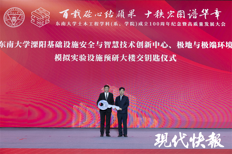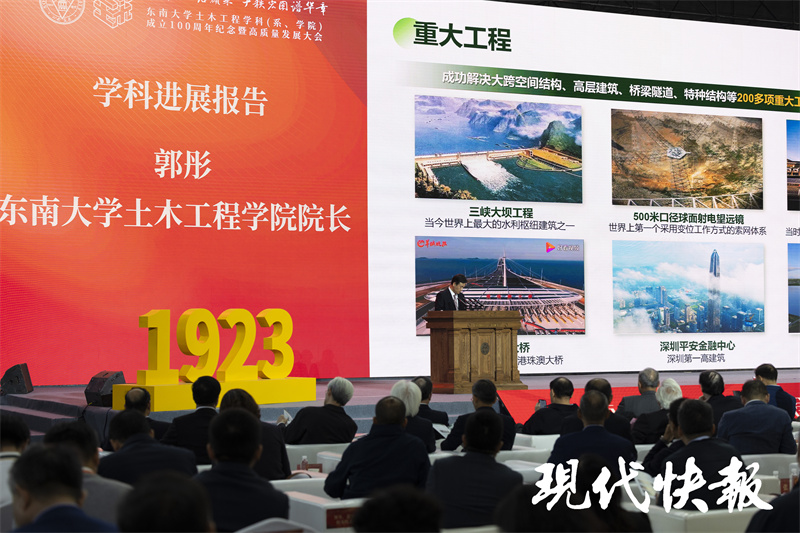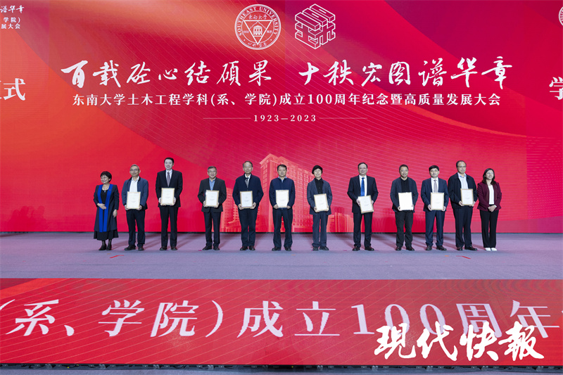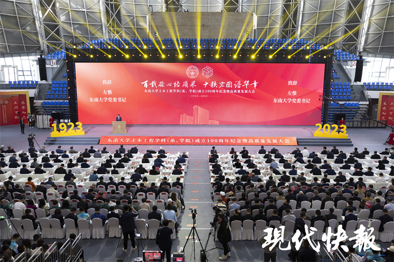 10月22日上午,东南大学土木工程学科(系、学院)成立100周年纪念暨高质量发展大会在九龙湖校区体育馆举行。大会以“百载砼心结硕果,十秩宏图谱华章”为题,以《积淀》《传承》《凝聚》《奋进》四个篇章曲线铺陈,勾勒百年光辉,展示未来伟业。