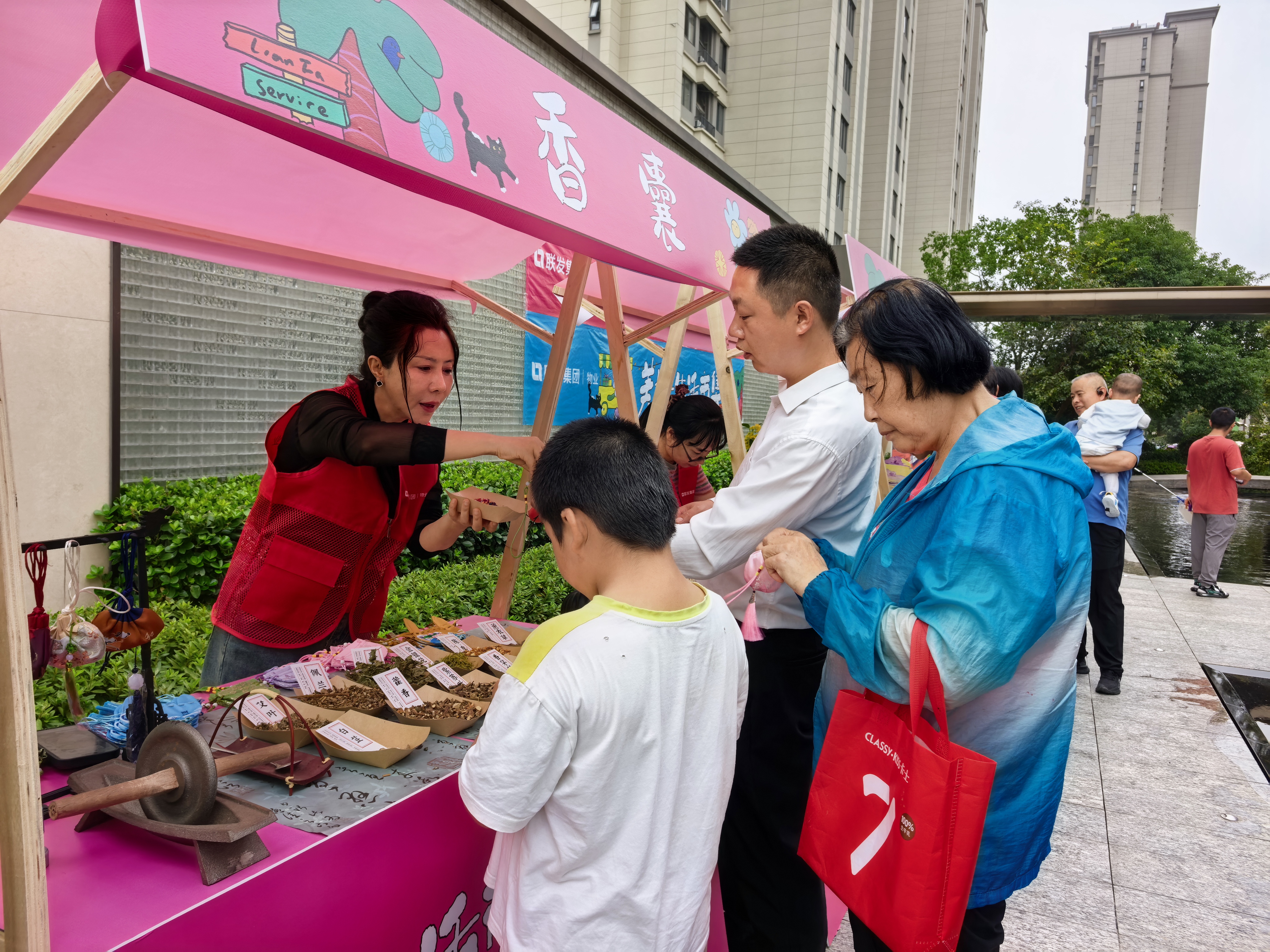 在月饼制作现场,居民在工作人员指导下揉面、包馅、压模,亲手制作的月饼不仅造型精巧,更承载着邻里互助的情谊与节日祝福。香囊手作区同样人气高涨,专业老师现场展示心形、圆形等传统香囊样式,详细讲解中秋制香囊“纳福祈安康”的文化内涵,引导居民在艾草清香中体验传统技艺,深刻感悟中华优秀传统文化的深厚底蕴。