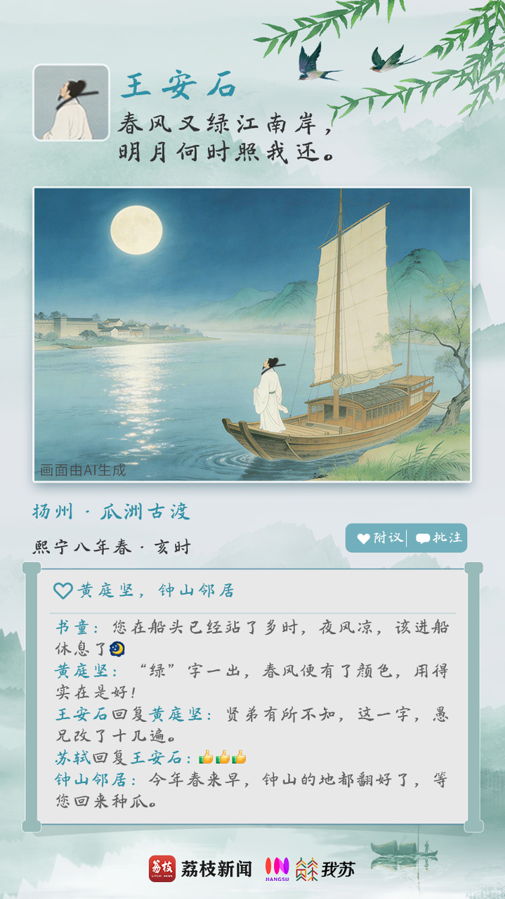 北宋熙宁八年二月,王安石第二次拜相,自江宁(今江苏南京)赴京途中泊船瓜洲。放眼南望,看到对岸的京口(今江苏镇江)、远处居住过的钟山(今南京紫金山),心生感叹,这一去,又不知何时才能回来。“绿”字炼十余次方才定稿,将看不见的春风转换成鲜明的视觉形象。春风拂煦,一片新绿,也暗含他的另一层期许,希望借由这温暖的春风驱散寒流,开创变法的新局面。有对家乡的依恋,有对前路的犹疑,但是春日已至,总要多些信心吧。