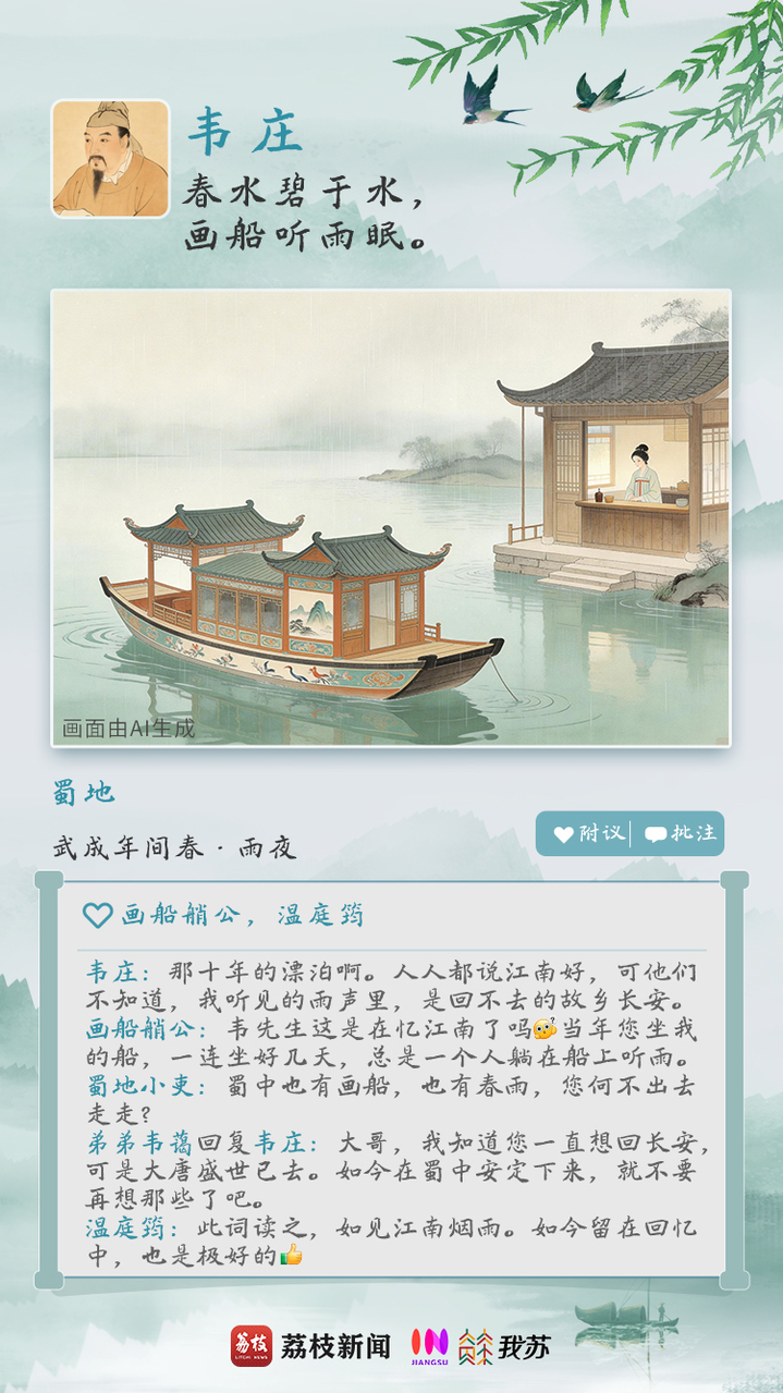 唐末五代词人韦庄晚年寓居蜀地(今四川省一带),回首江南旧游,写下词作《菩萨蛮·人人尽说江南好》。他曾饱经漂泊之苦,在江南流寓整整十年。人人都说江南好——春水碧绿胜过天色,画船卧听潇潇雨声,酒垆女子皓腕如雪。可这景致越美,越反衬出“未老莫还乡”的无奈。“游人只合江南老”,故乡长安,早已回不去了。韦庄的“朋友圈”,字字写江南之美,行行是故园之思,抒发出断肠之哀。