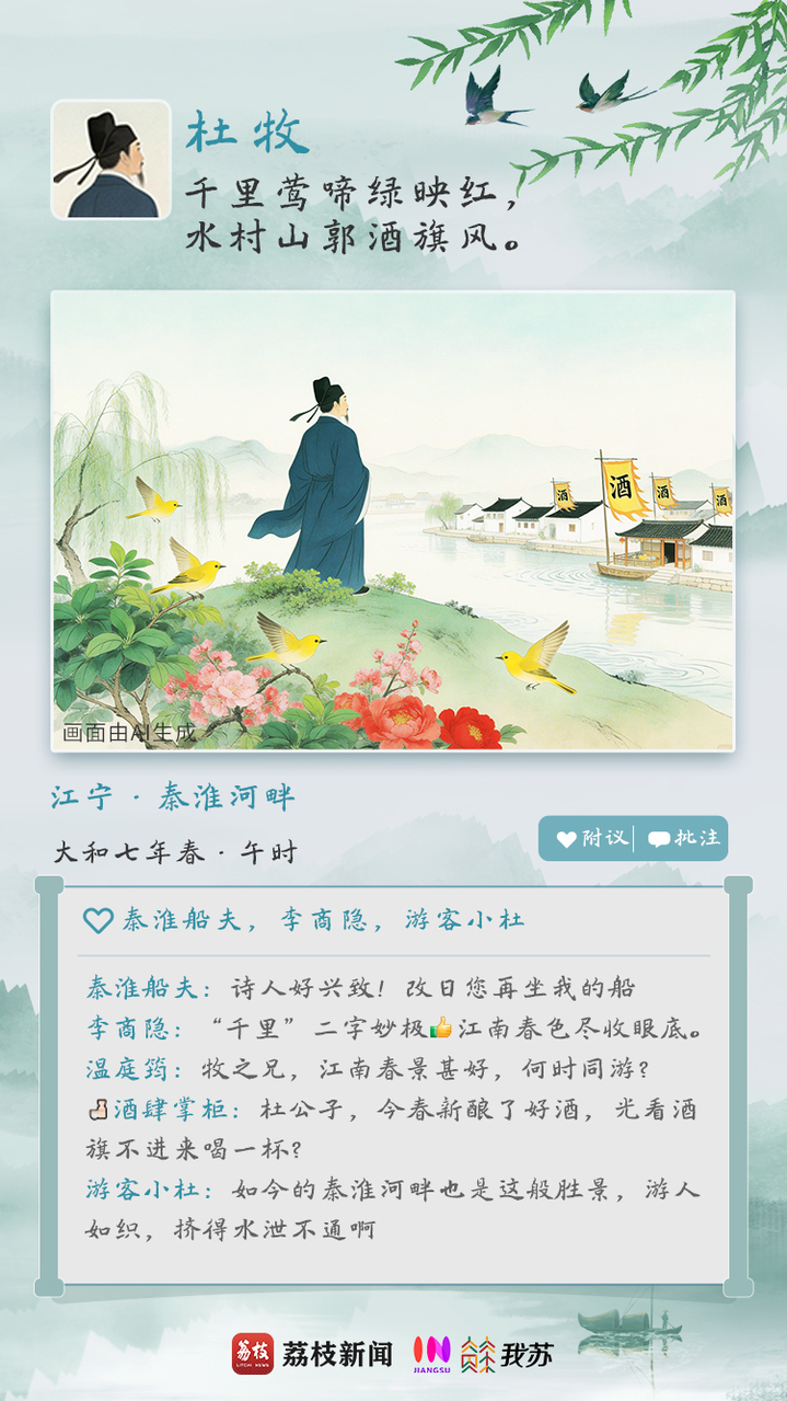 晚唐大和七年春,杜牧由宣州(今安徽宣城)经江宁(今江苏南京)往扬州途中,写下这首《江南春》。“千里莺啼”的广袤,“绿映红”的绚烂,山郭水村的酒旗招展,勾勒出江南春景的明丽画卷。杜牧时任幕府幕僚,生活于藩镇割据、宦官专权的晚唐时代,诗中既表达了对江南风物的审美观照,更寄寓“南朝四百八十寺,多少楼台烟雨中”的历史感慨。杜牧的“朋友圈”,即景写生,也是对南朝兴亡的委婉讽喻。