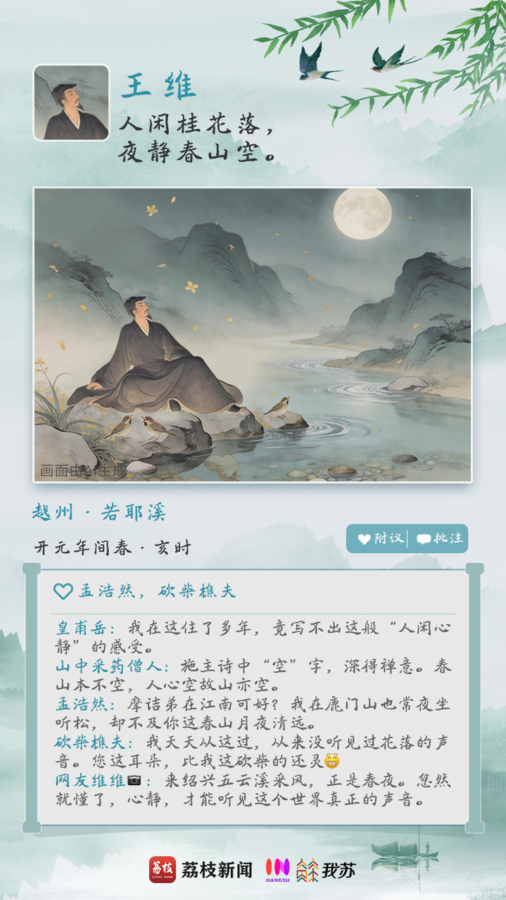开元年间,在盛唐安定的社会气氛中,王维游历江南,访友人皇甫岳于云溪别墅。夜来无事,独步山林,春山空寂,万籁俱静,他以一颗禅心感受春夜的静谧,写下《鸟鸣涧》。春花悄然飘落,这是只有内心真正“空”下来的人,才能察觉的细微之美。月出东山,清辉洒落,春涧中不时传来啼鸣几声。这鸟鸣,反倒让夜更静了。王维的“朋友圈”,以动衬静,留下清远空灵的春夜。