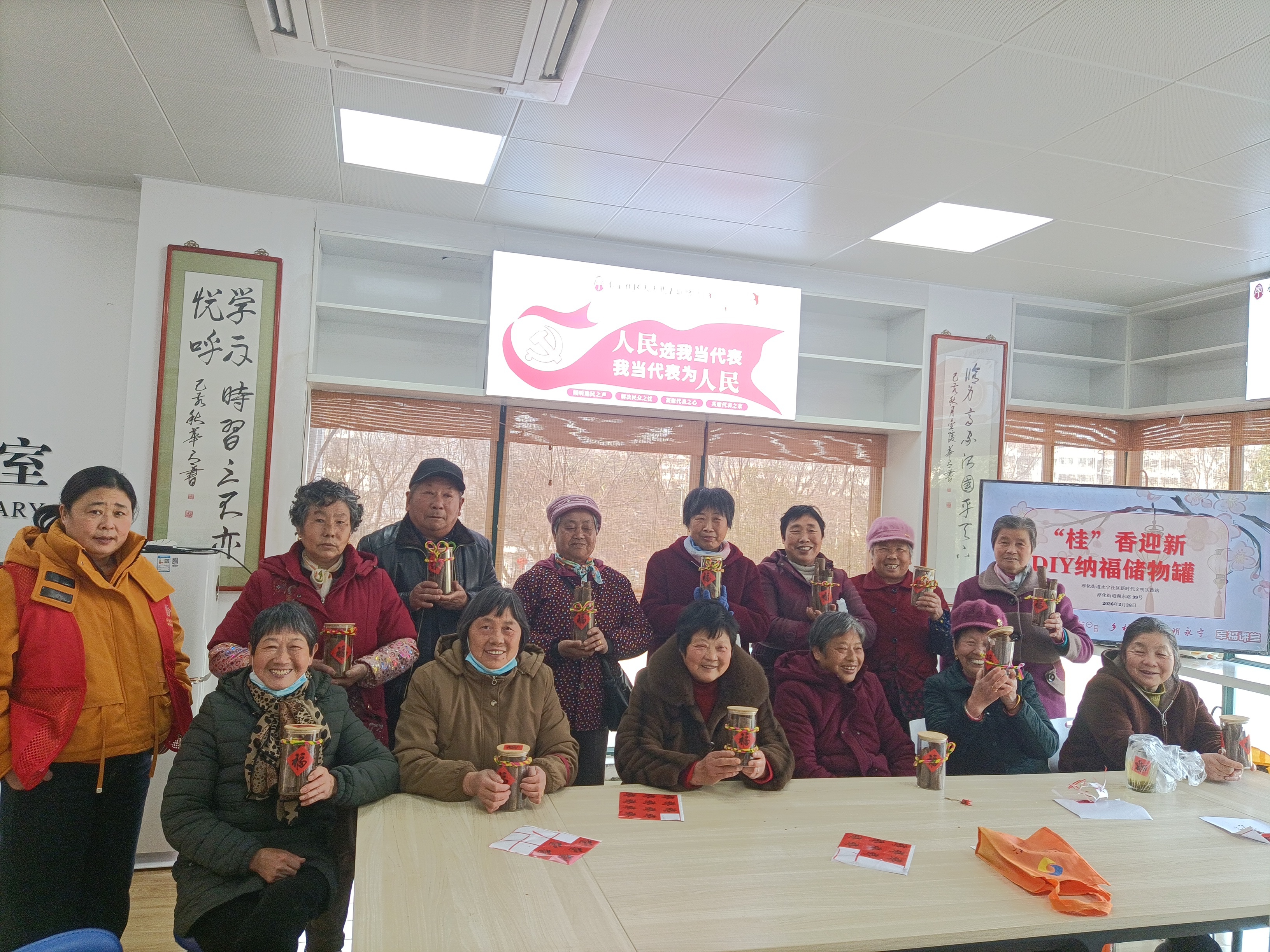 最受欢迎的环节当属DIY纳福储物罐制作。志愿者提前准备好透明玻璃罐、桂皮、麻绳、贴纸等材料,并示范制作步骤:先在罐身装饰“福”字,再将桂皮铺入罐中,最后用彩色麻绳缠绕罐口并系上装饰,一个兼具实用与装饰功能的纳福储物罐便完成了。居民们热情高涨,李奶奶举着自己制作的储物罐笑着说:“这罐子既能装桂圆、红枣,摆在家里又喜庆,真是实用又好看!”