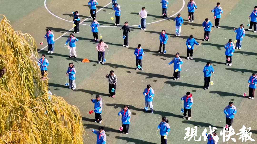 与此同时,操场的另一侧,学生们正在练习抖空竹。随着双手的灵巧操作,空竹在线绳间轻盈翻飞。一套《快乐空竹操》动作流畅,富有趣味。