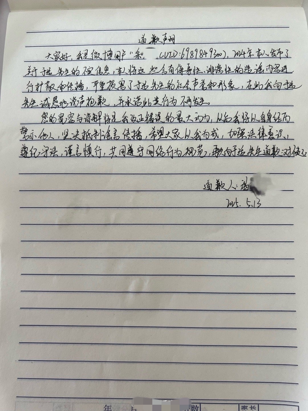 2025年2月21日,于适工作室在微博发布“关于于适先生名誉维权案件进展的说明”,其中包含“采呱*”。对于黑粉手写道歉声明这件事,网友表示,“网络绝非法外之地,在网上发言还是要注意真实性及尺度。”