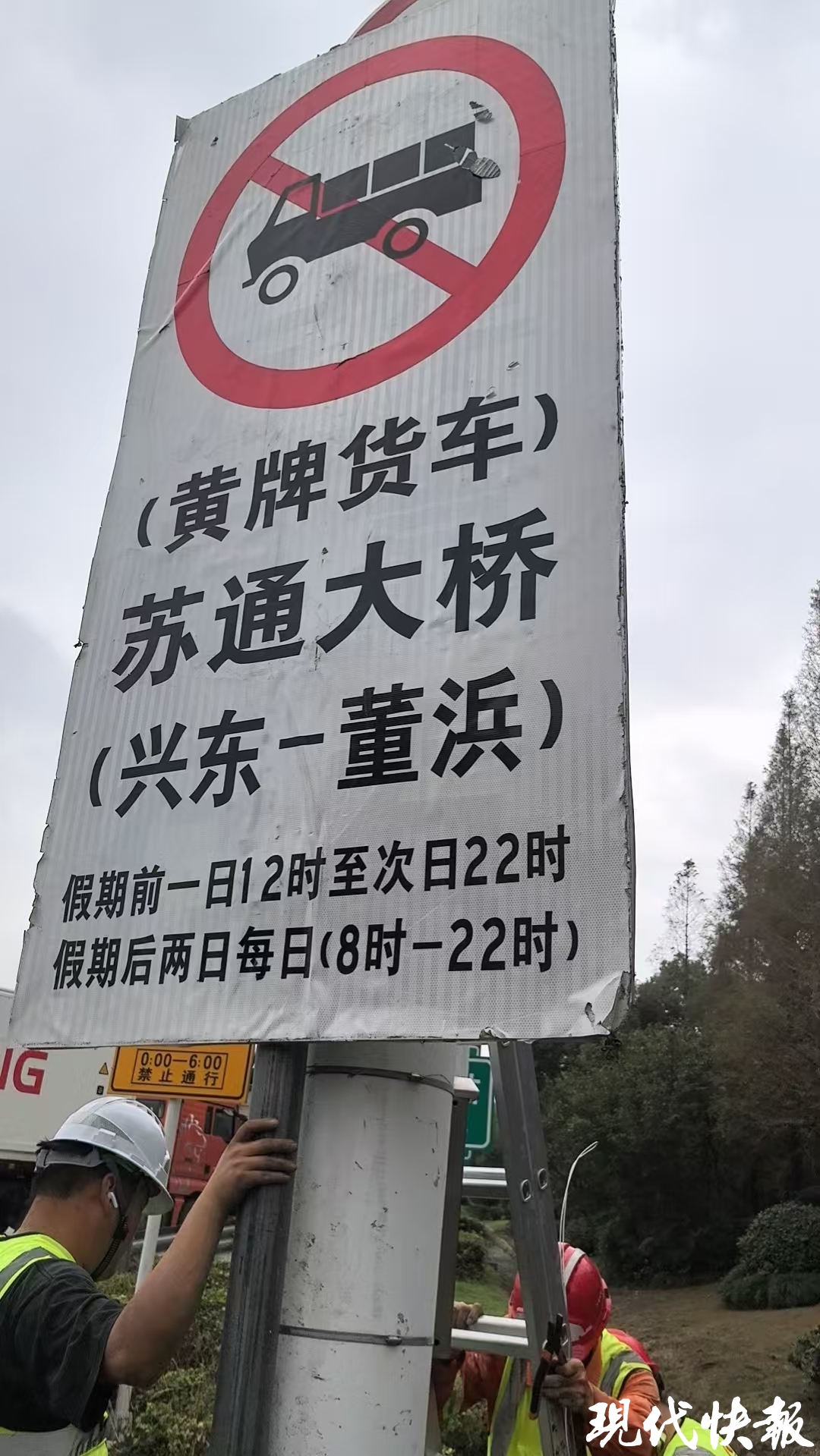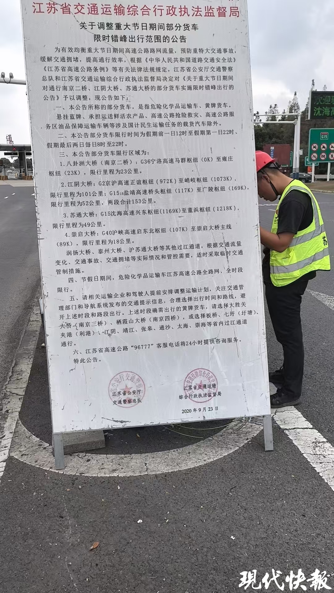 现代快报讯(记者 李娜 通讯员 耿焱)9月30日12:00,国庆节苏通大桥货车限时错峰出行政策开始实行。苏通大桥常熟开发区、南通开发区、竹行三个收费站中午12时准点开始,对行驶苏通大桥过江的货车进行分流引导,落实落地江苏省公安厅交警总队、江苏省交通运输综合行政执法监督局《关于调整重大节日期间部分货车限时错峰出行范围的公告》要求,有效均衡高速公路路网流量,预防重大交通事故,缓解交通拥堵,提升通行效率。
