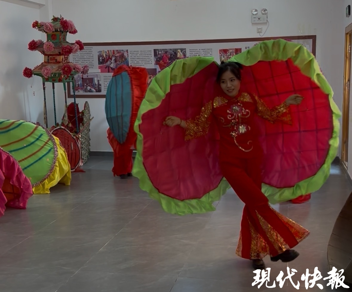 在天王镇唐陵村,传承百年的传统民俗文化蚌蚌精,也吸引到了很多年轻人前来学习。这本是当地娱乐活动中的一种传统舞蹈形式,大红大绿的蚌壳在年轻演员的操控下欢乐舞动,乡土气息扑面而来,也从古老艺术中生出青春气息。唐陵村以文化人,将唐妃墓、戴九成墓等人文历史遗迹与舞龙、玩花船、打年糕等民俗活动融为一体,传播当地优秀传统文化。