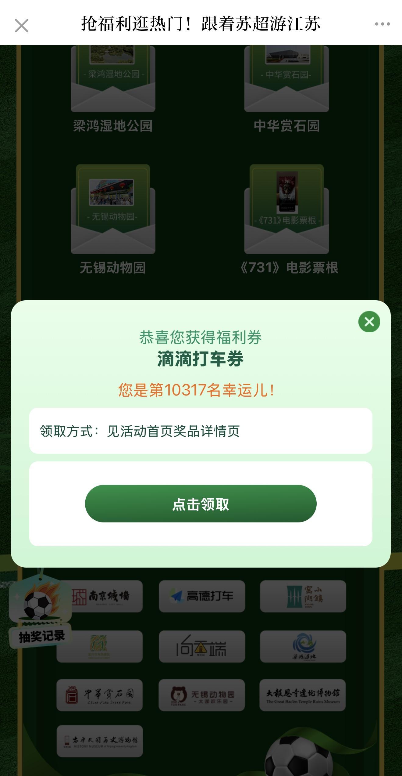 为了方便读者参与抽奖,现代快报在现代+APP上开设了“抢福利逛热门 跟着苏超游江苏”特别专区。该专区一经上线,便成为读者们关注的焦点。在这里,读者不仅能感受到苏超联赛的热血沸腾,更能享受到实实在在的福利回馈。活动首日,专区内热闹非凡,读者们纷纷点击参与。“哇,我抽中了滴滴打车券,系统提示我是第10317名幸运儿,还真是100%中奖啊!”南京市民刘女士称,自己是现代快报的老读者了,一看到这个活动就立马参加了,还在家庭群里,通知了亲友参加。