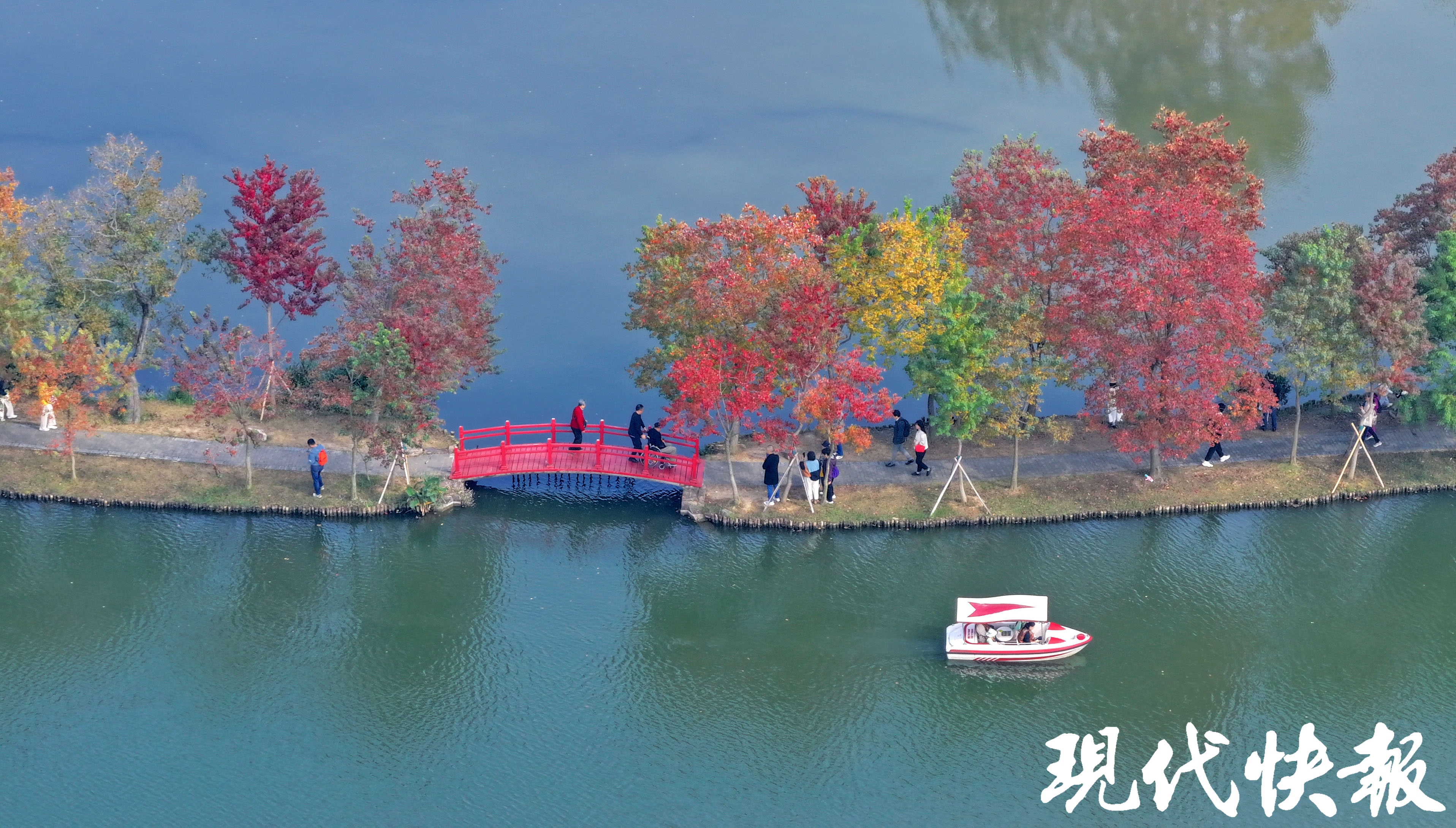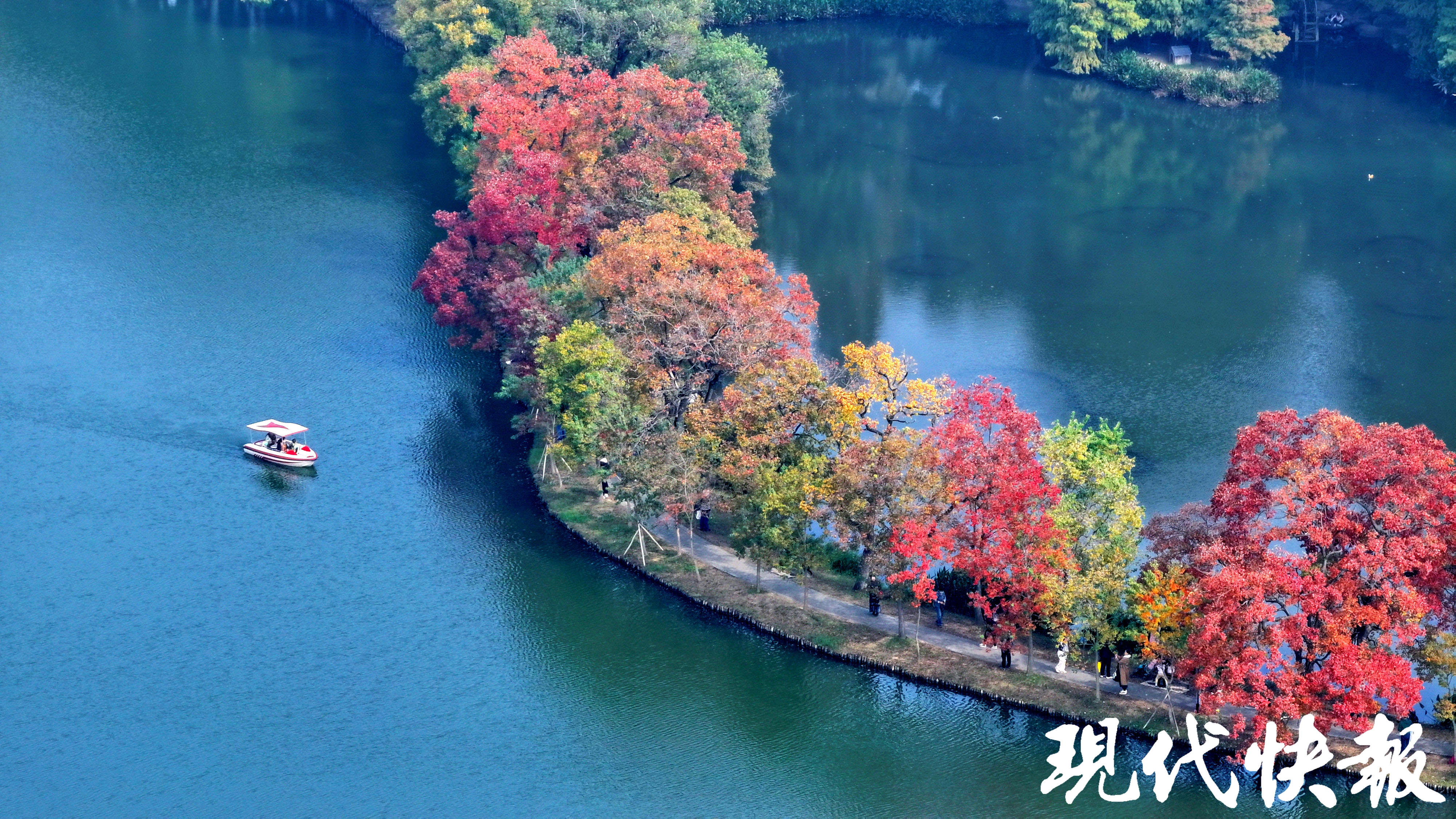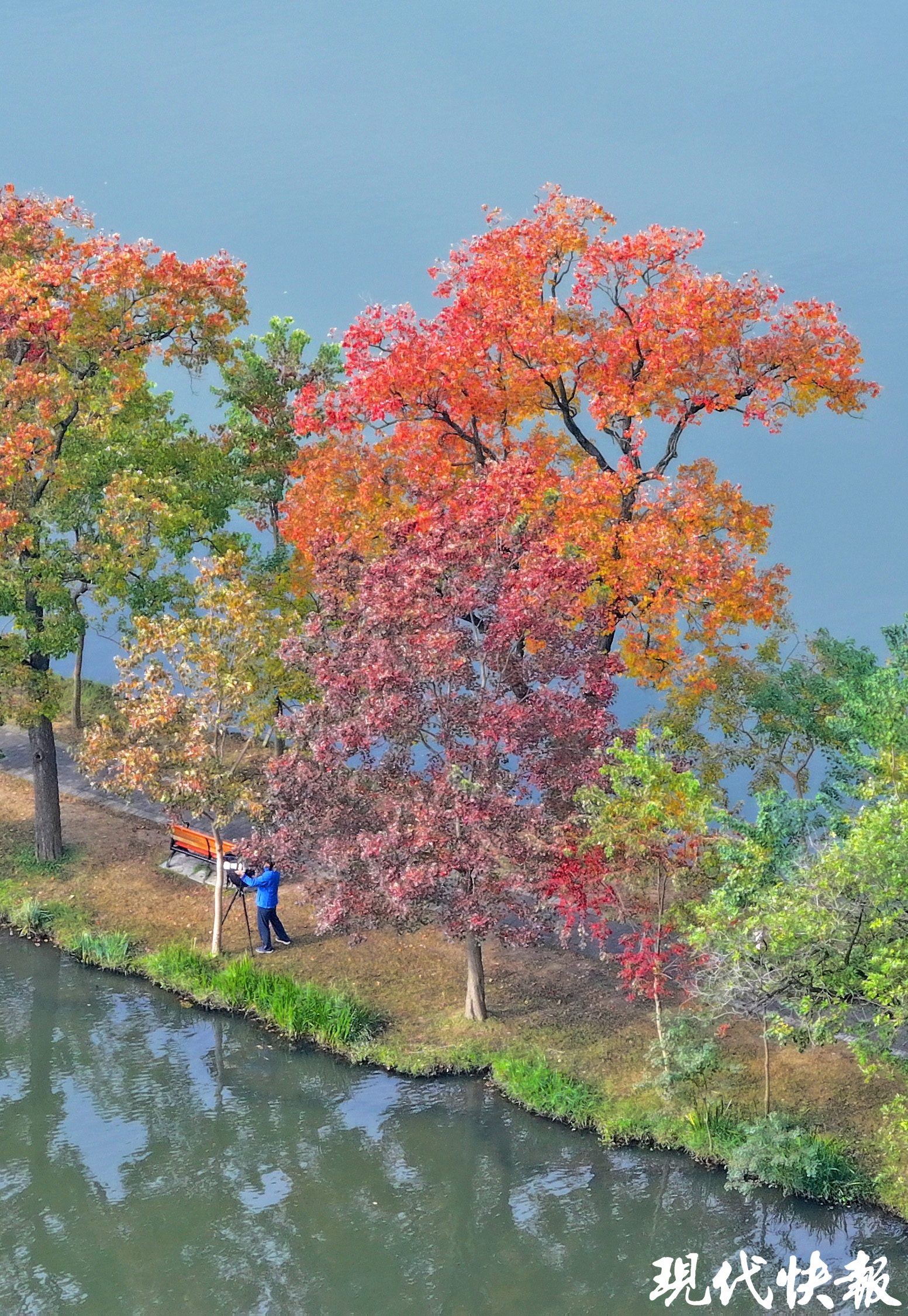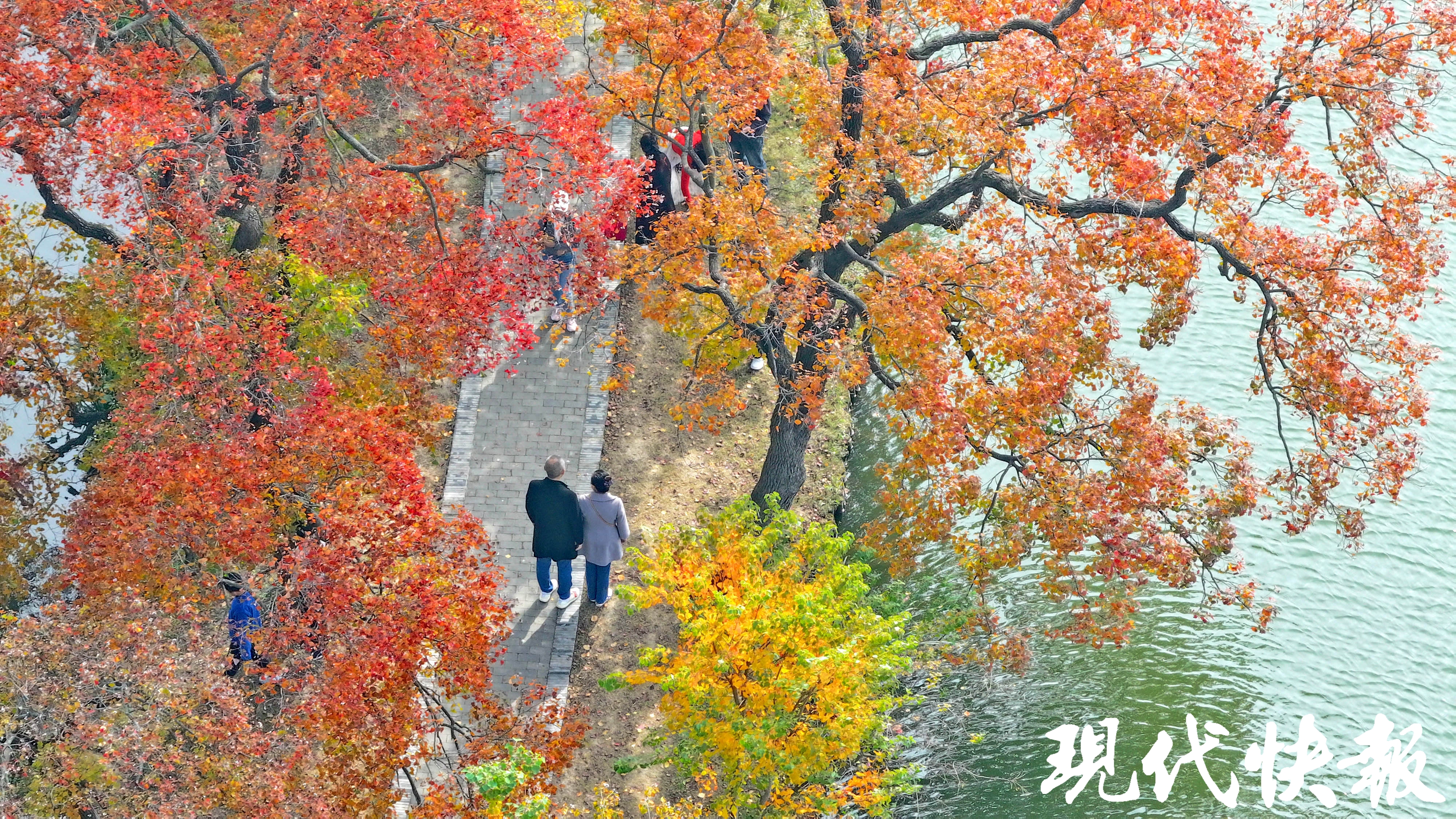 现代快报讯(记者 卢河燕/文 赵杰/摄)一湾浅水环抱中,一条月牙形湖堤蜿蜒舒展,堤岸两侧的乌桕、银杏渐次换上盛装。11月初,当乌桕叶染上深浅不一的绯红,银杏缀满金黄,南京月牙堤便迎来了惊艳时光。