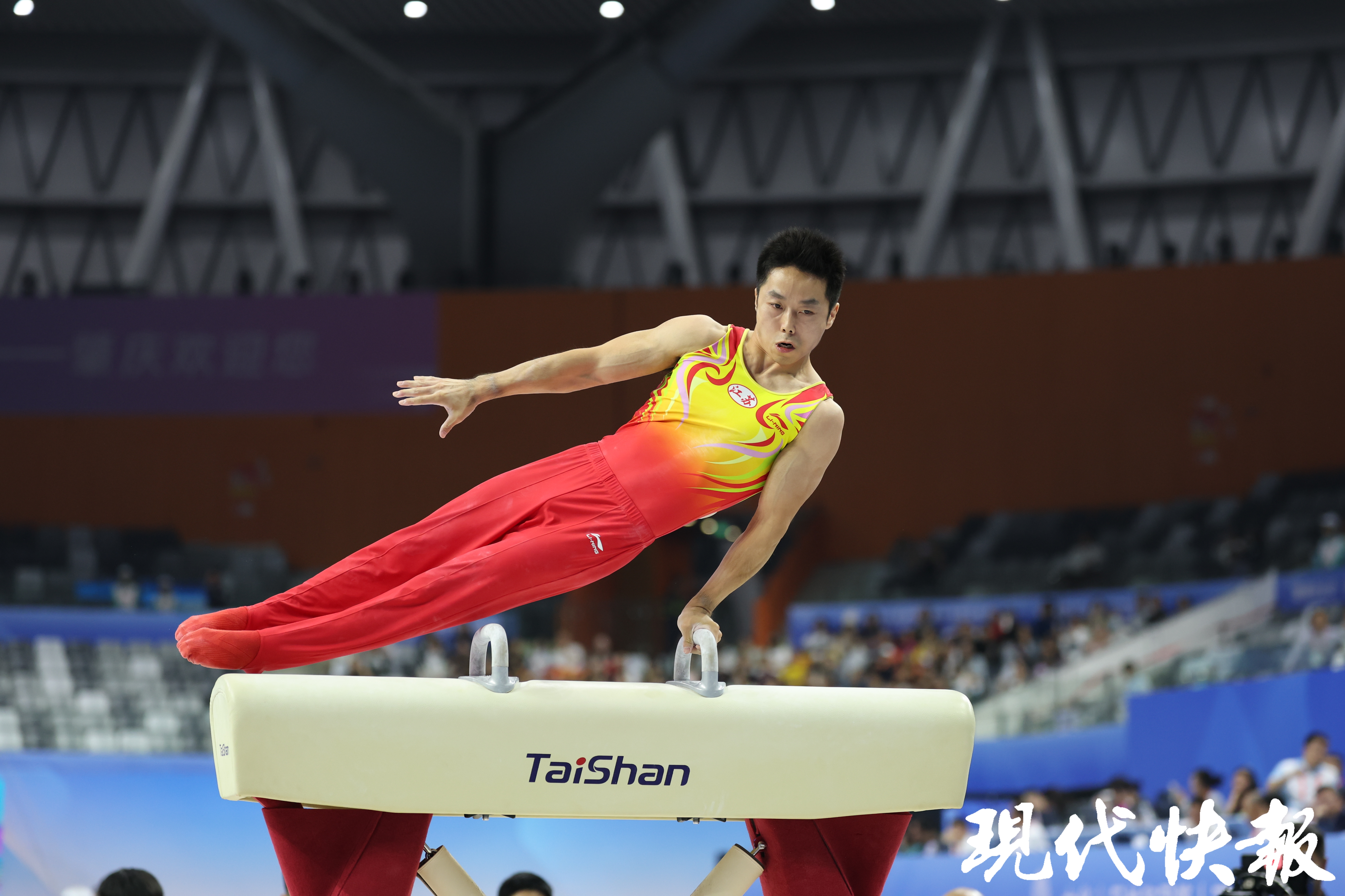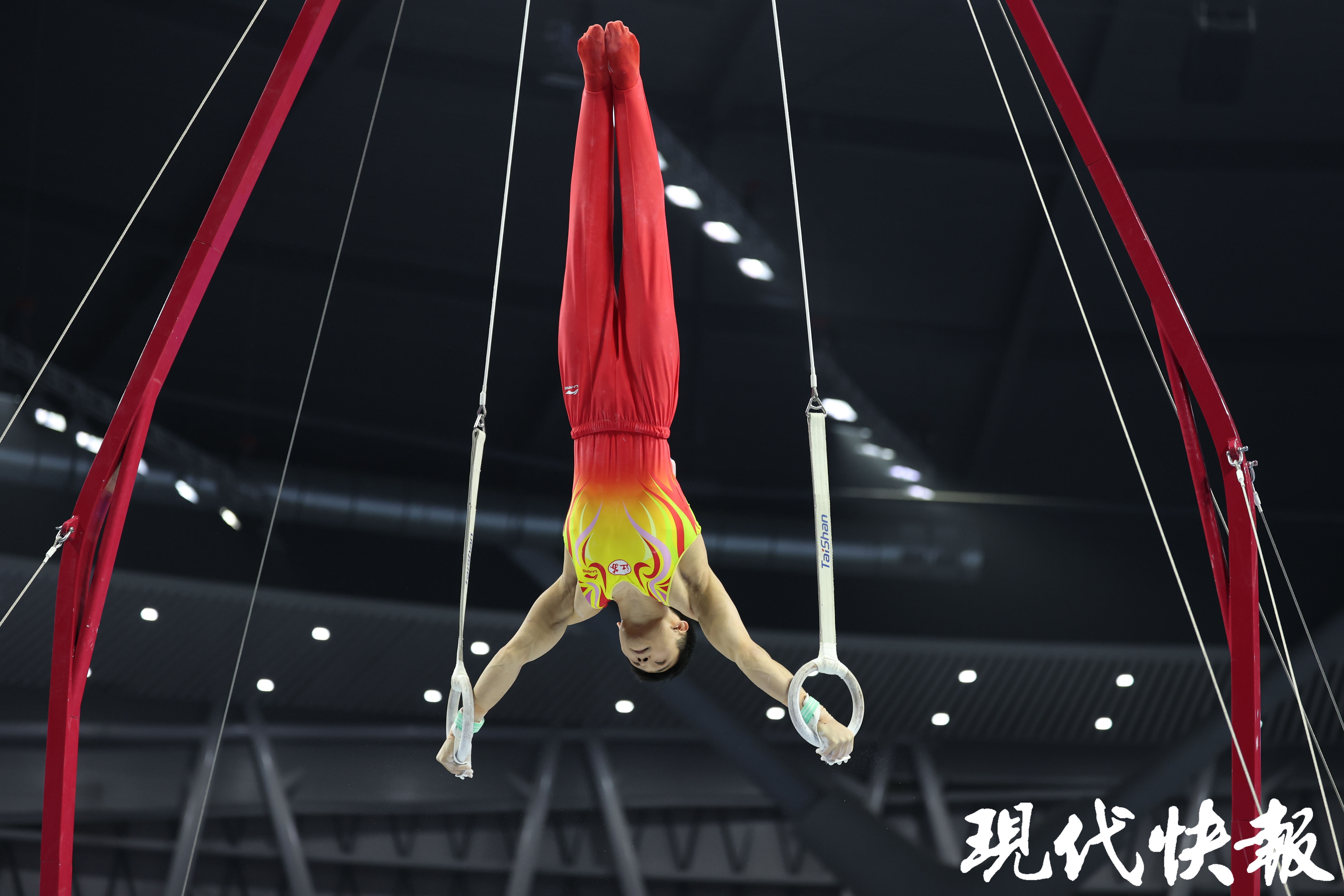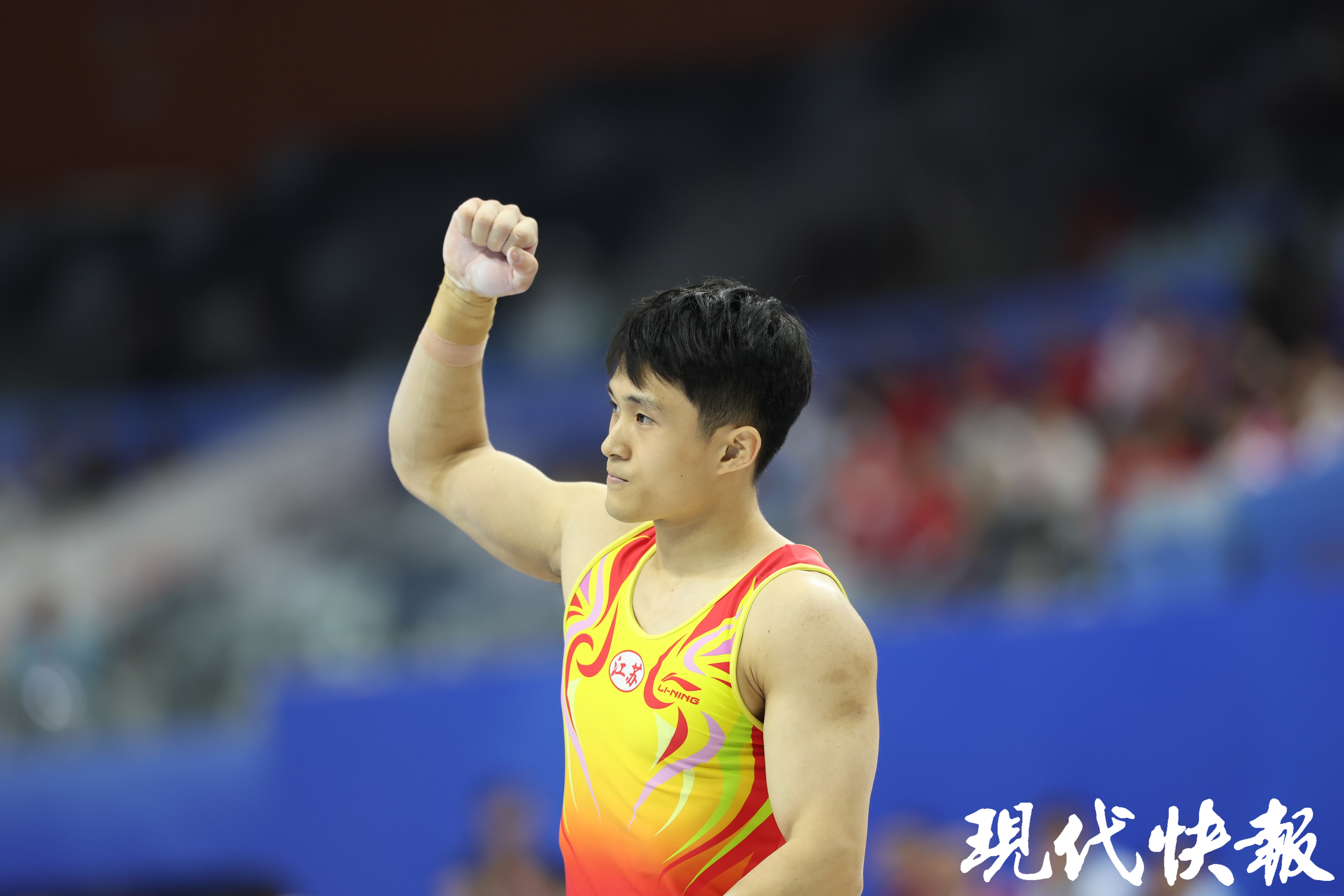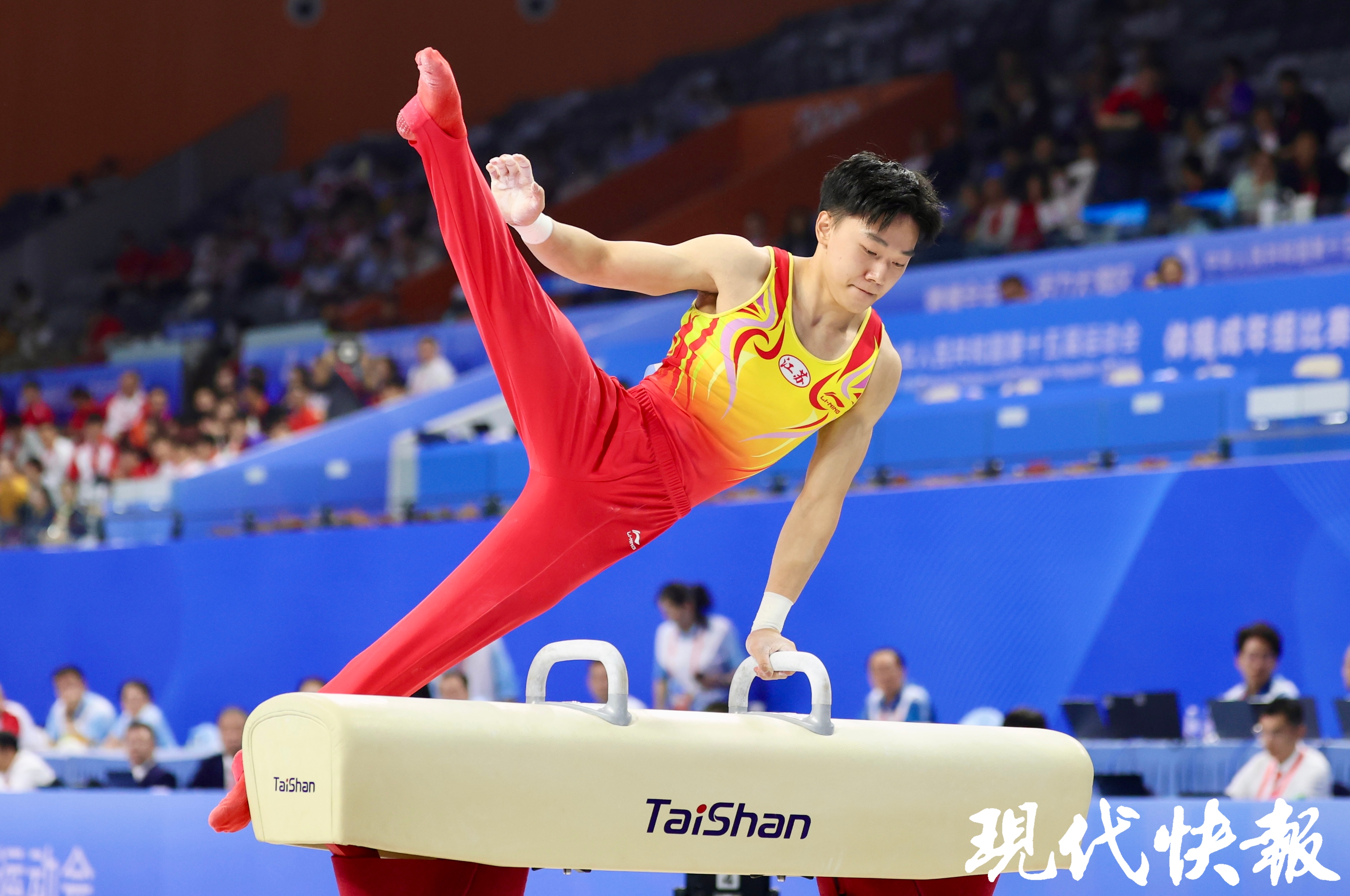 本届全运会,江苏体操男团的卫冕之路并非一帆风顺。预赛中,张博恒领衔的湖南队排名第一,晋级决赛,江苏队位列第二。决赛中,江苏队与湖南队首先在自由体操项目上展开争夺,比分相同。第二轮鞍马项目,新科世锦赛鞍马冠军、江苏队洪延明以14.466分帮助江苏队取得领先优势。第三轮吊环,东京奥运会吊环亚军尤浩斩获14.400分。此轮战罢,江苏队已领先湖南队2.634分。湖南队奋起直追,但江苏队稳定发挥,最后一项单杠主动降低难度。最终,江苏队以总分328.957分获得金牌。