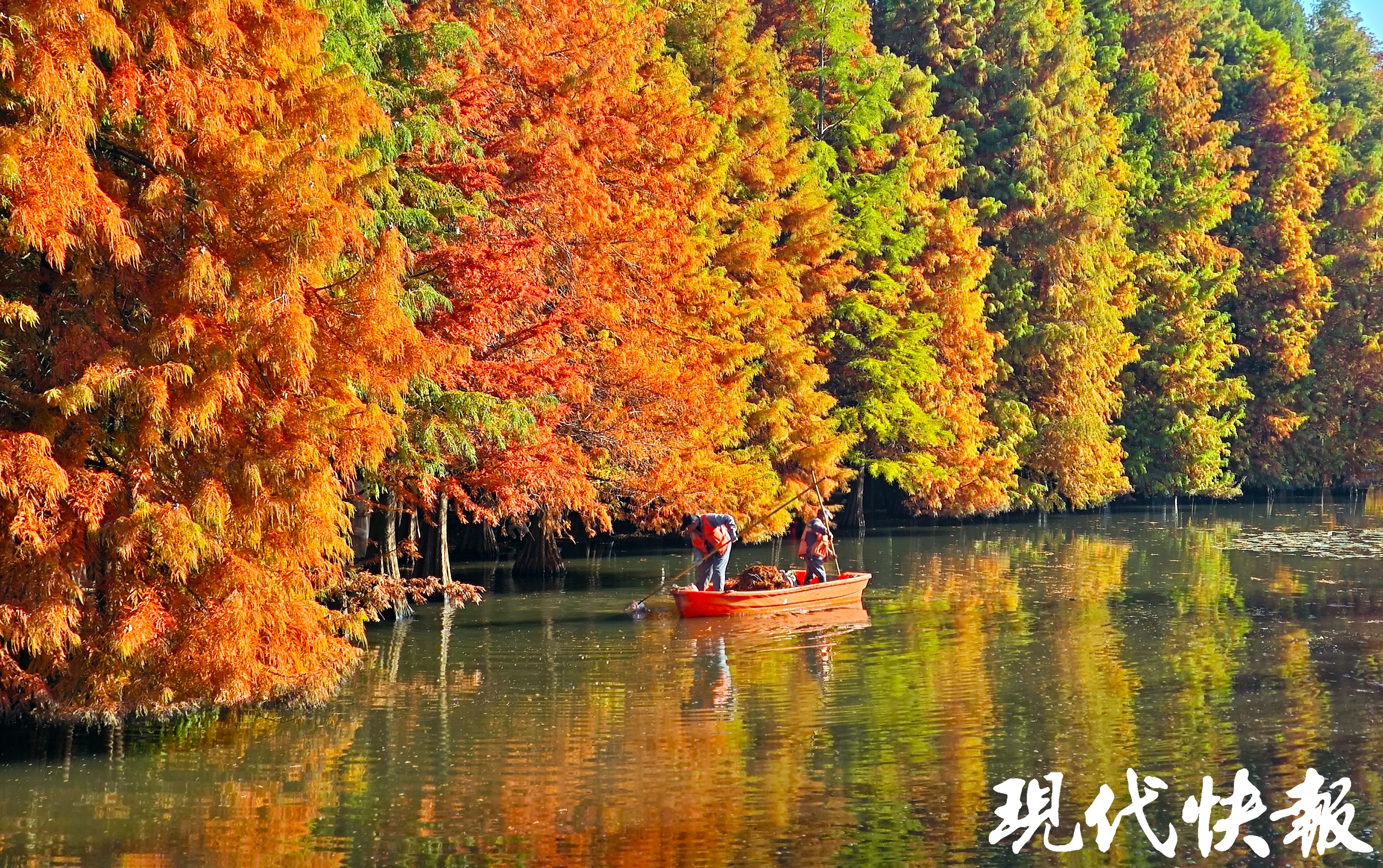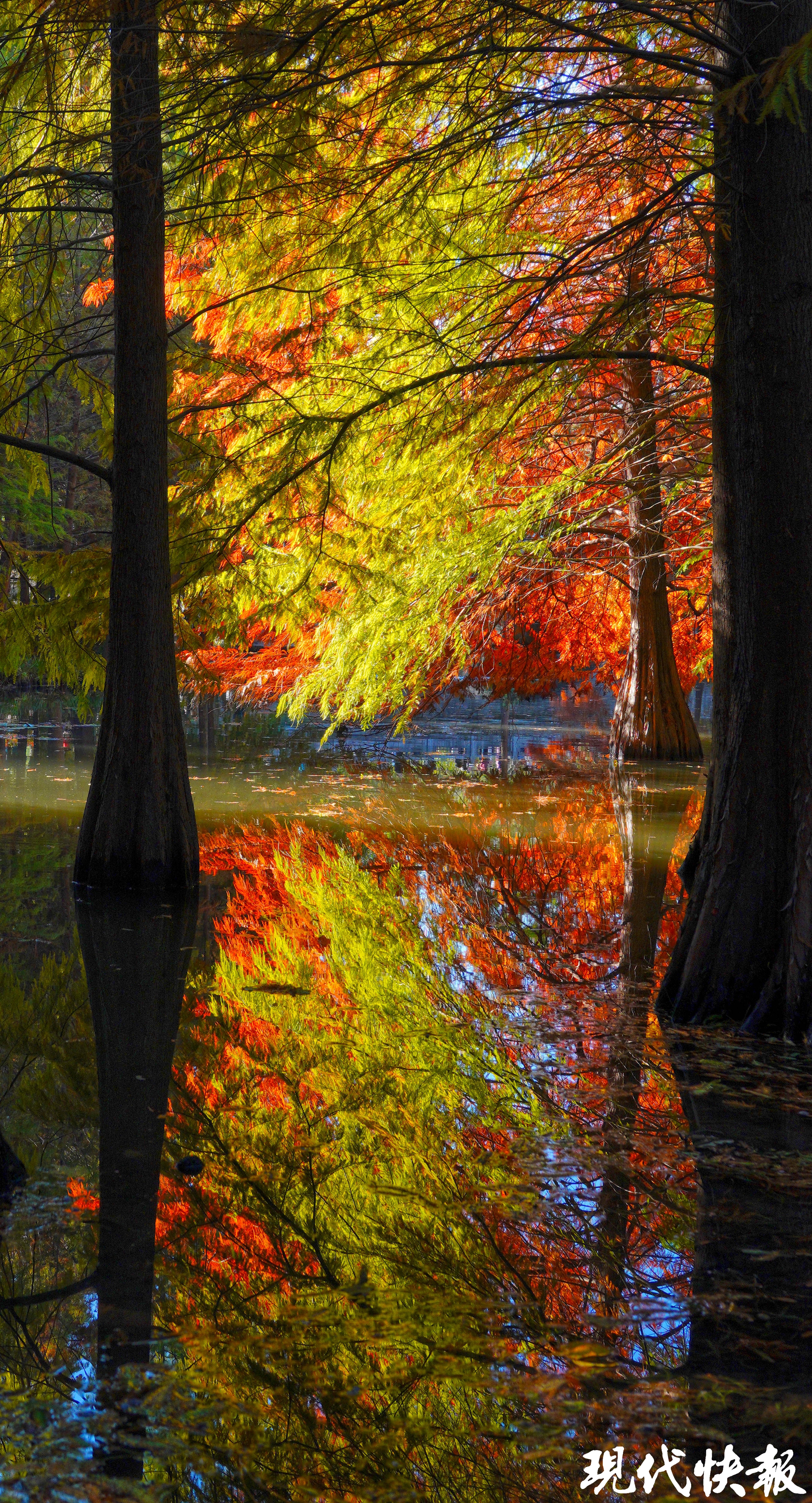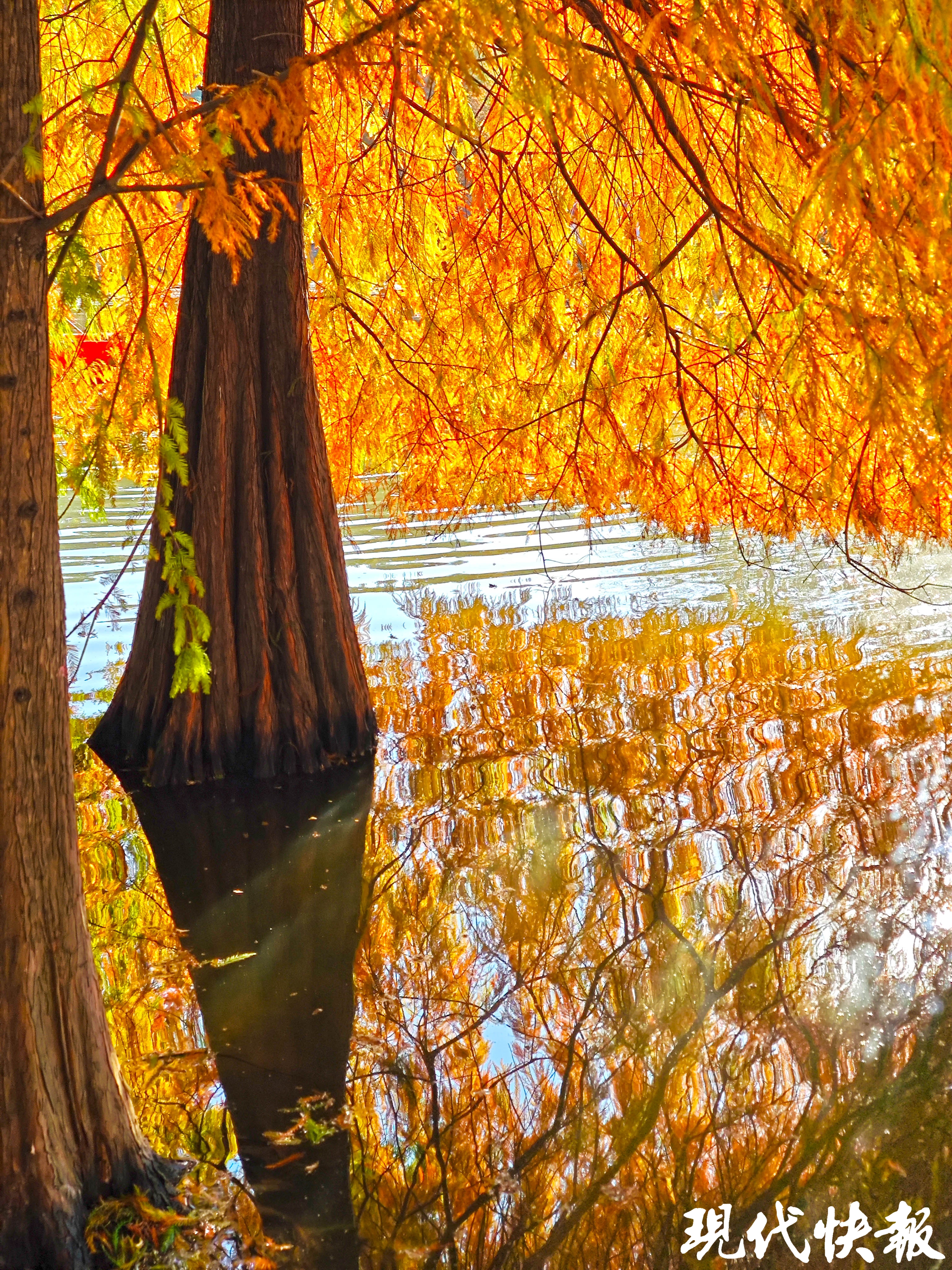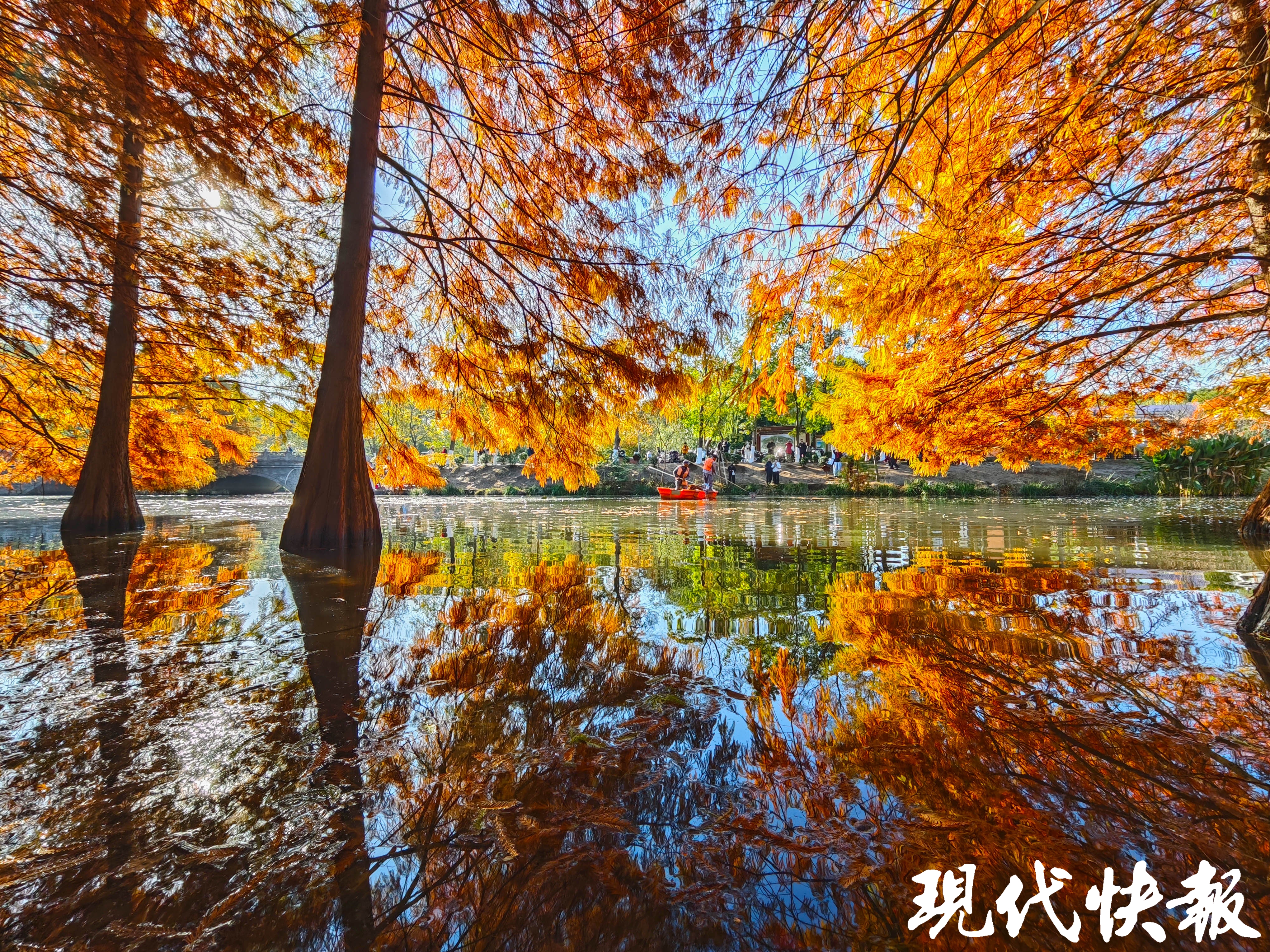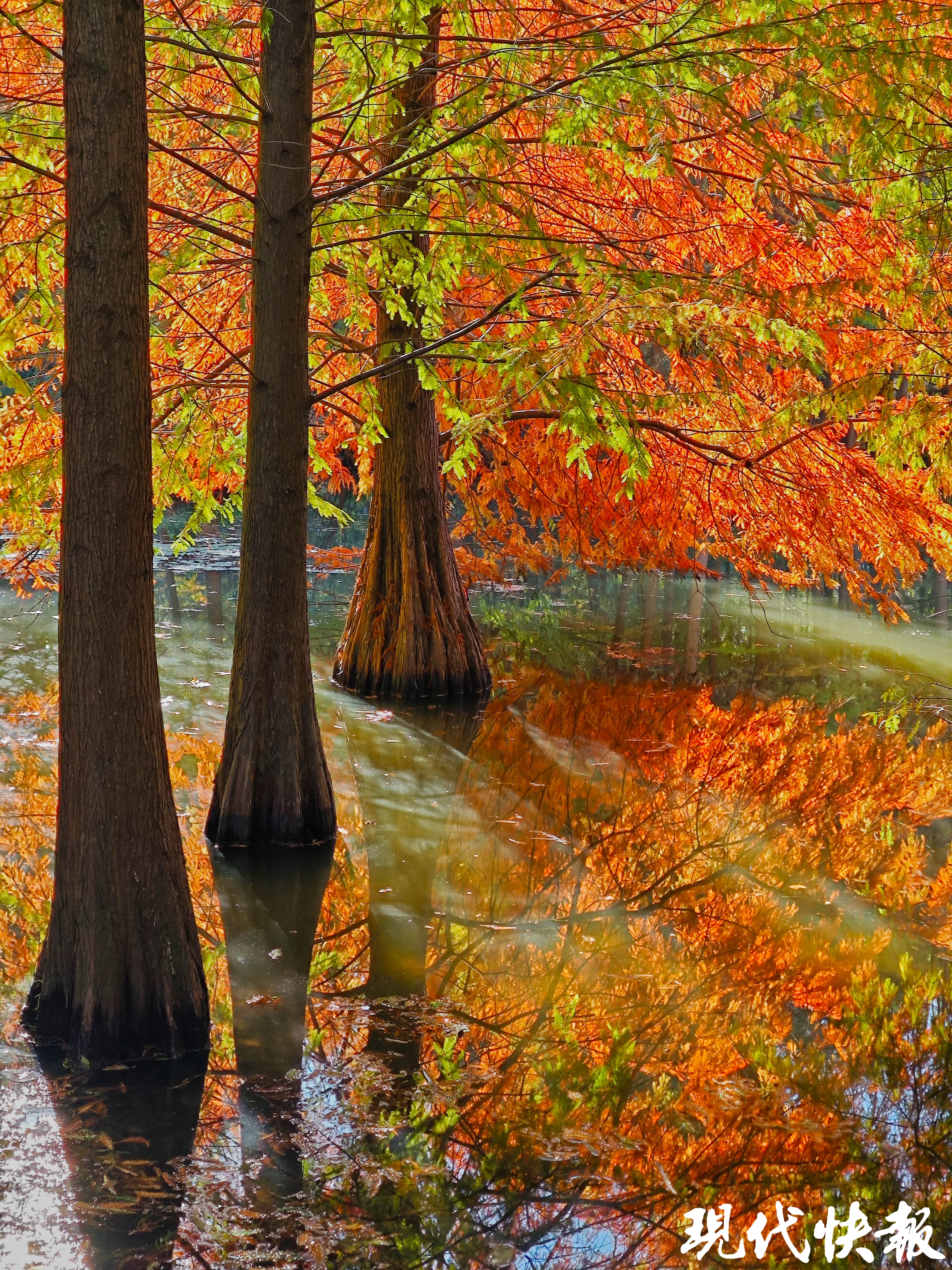 现代快报讯(记者 裴诗语/文 赵杰/摄)近日,南京燕雀湖的落羽杉已切换“秋日盛装”。枝叶褪尽葱茏,叠染出朱砂红、琥珀黄与金棕渐变,阳光穿透树冠洒下碎金。湖面倒映着层叠树影,风过枝叶簌簌作响,每帧都像蘸满秋意的笔触晕染开来,随手一拍都是氛围感大片。