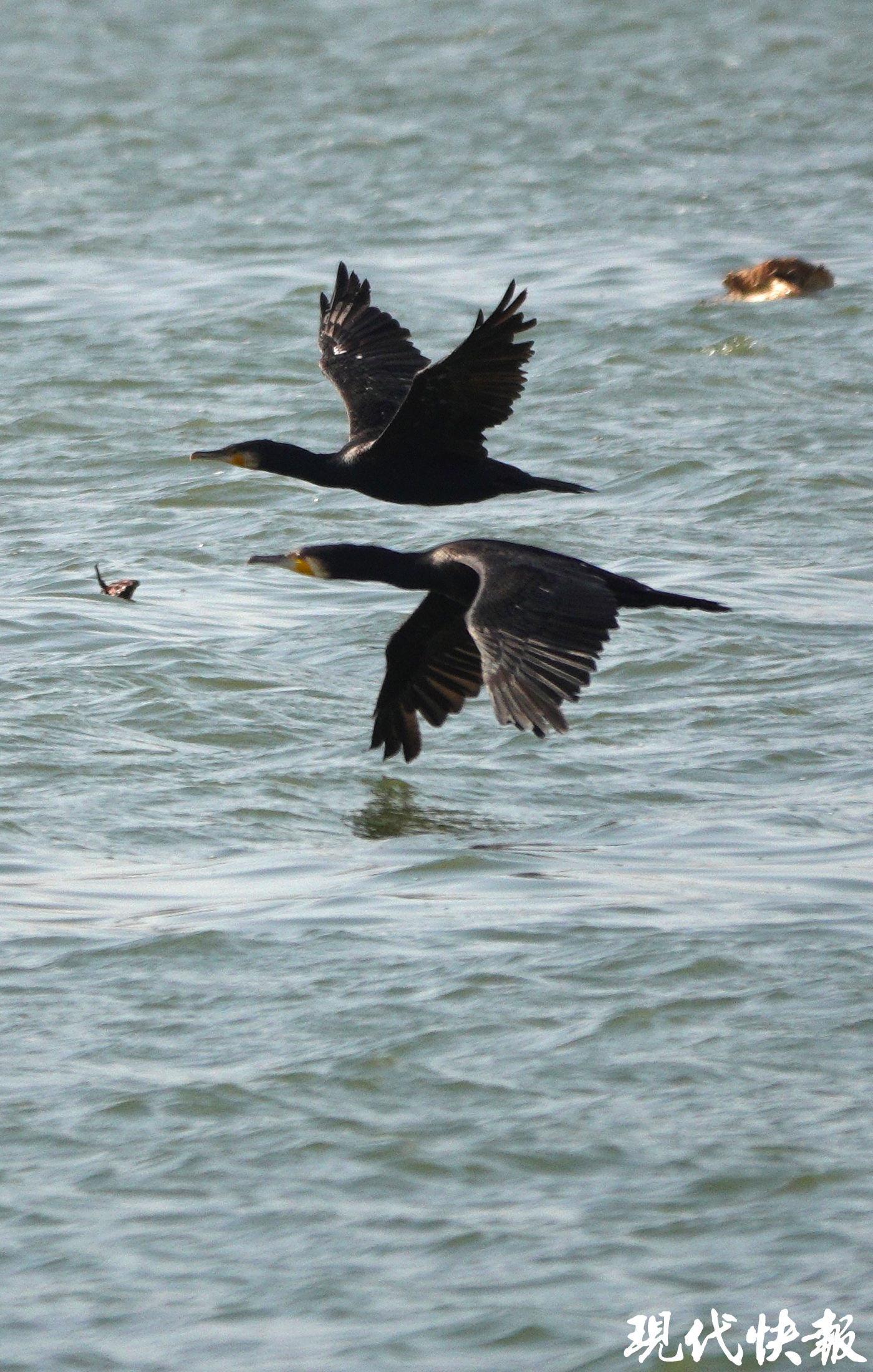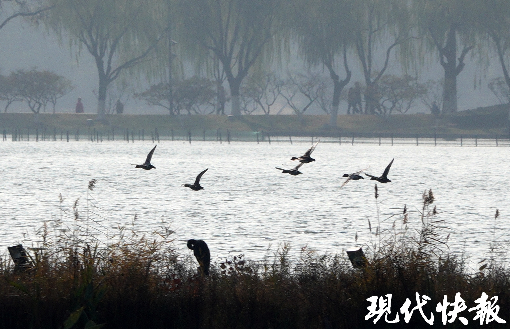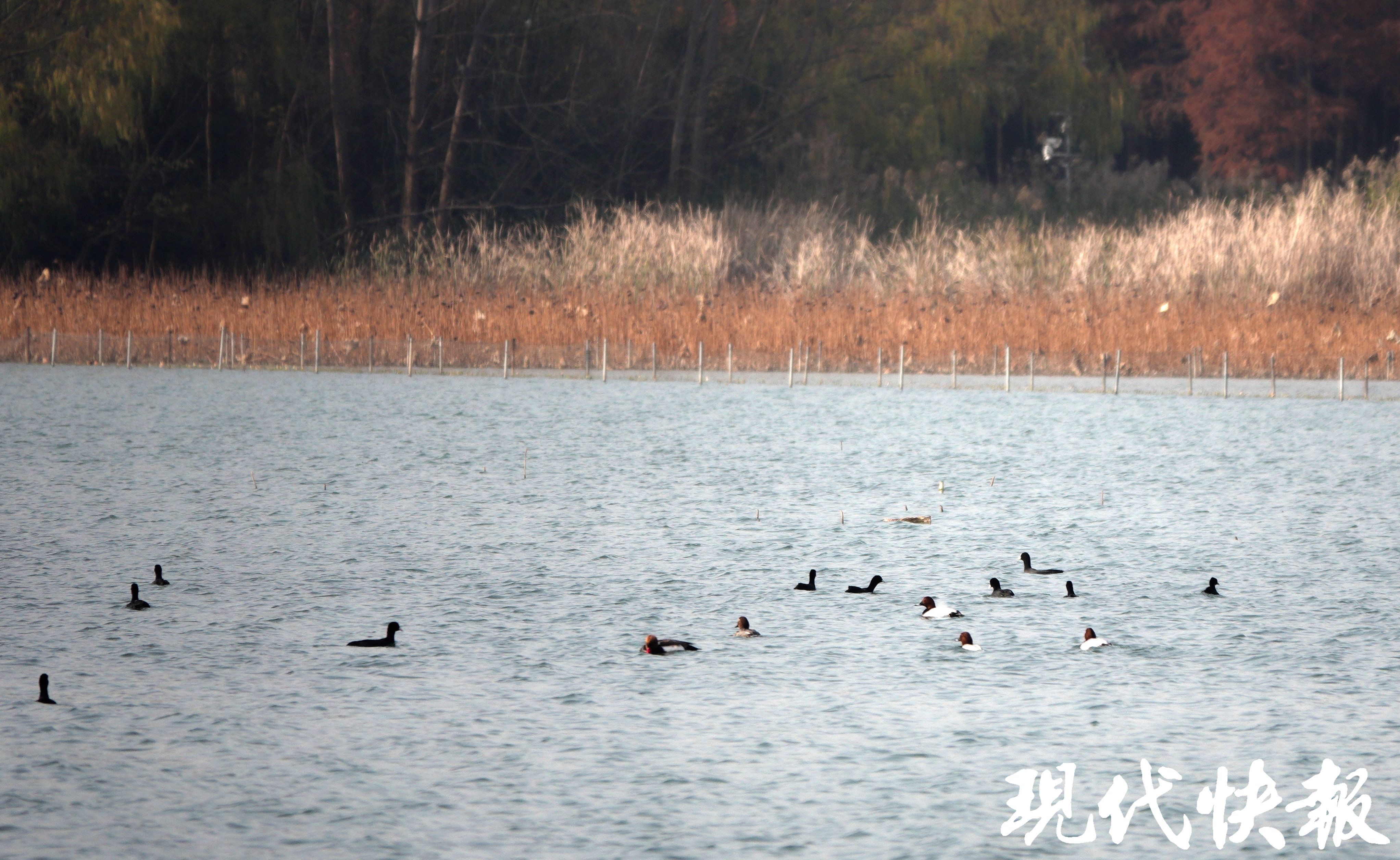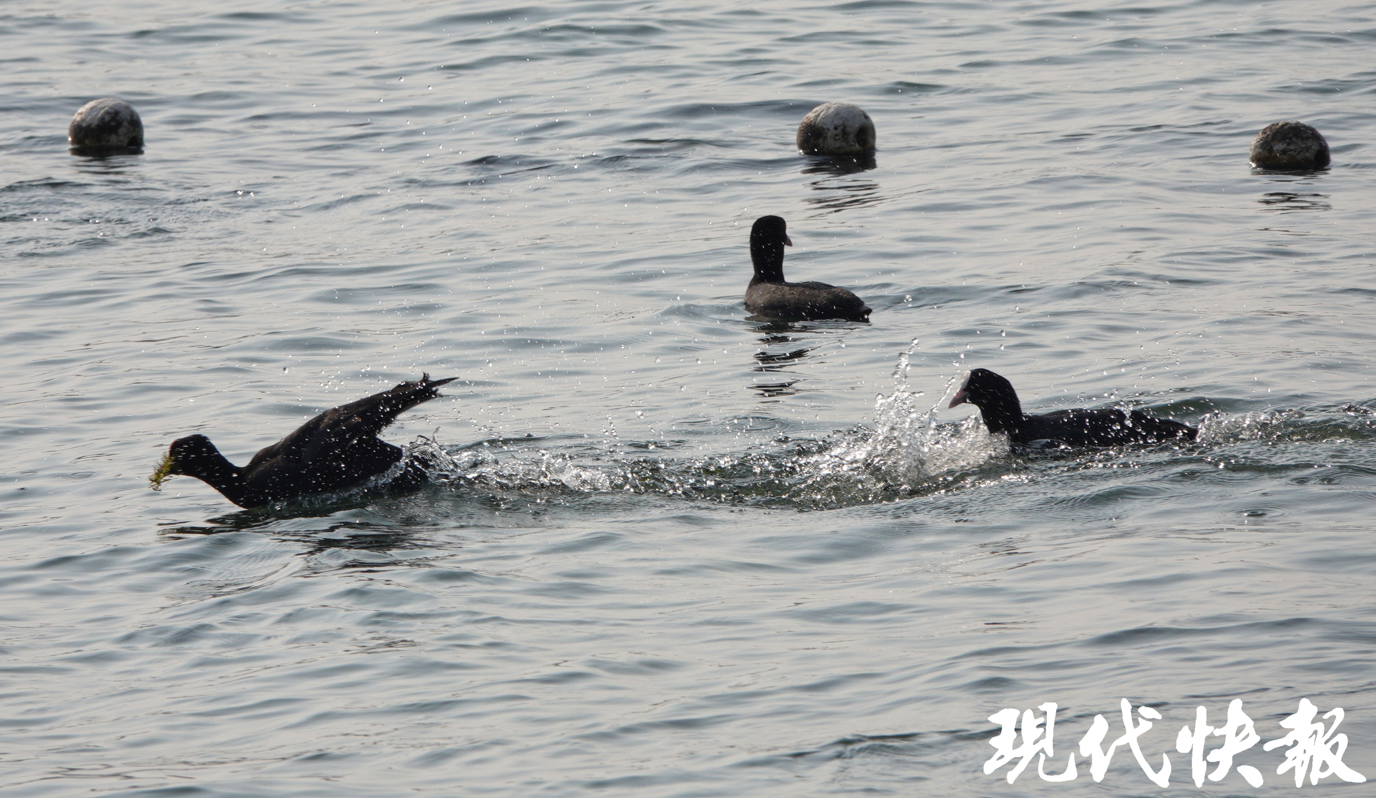 现代快报讯(记者 裴诗语/文 赵杰/摄)洁白的白鹭翩翩起舞,成群的野鸭在水中嬉戏觅食,偶尔还有鸬鹚扎入水中捕鱼……近日,南京站南广场附近的玄武湖水面热闹非凡,成群水鸟在此栖息、嬉戏,成为冬日里一道灵动的生态风景线。