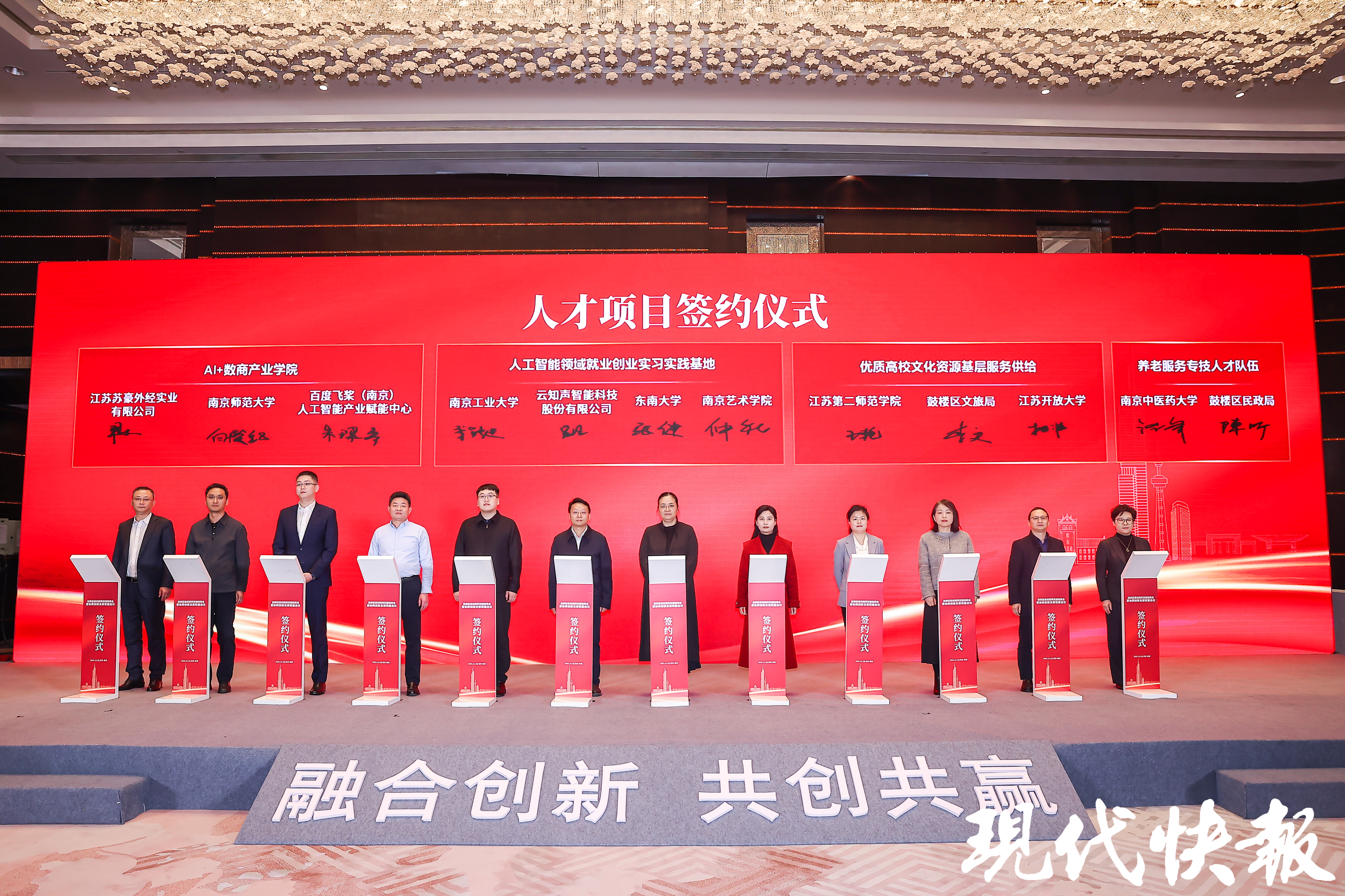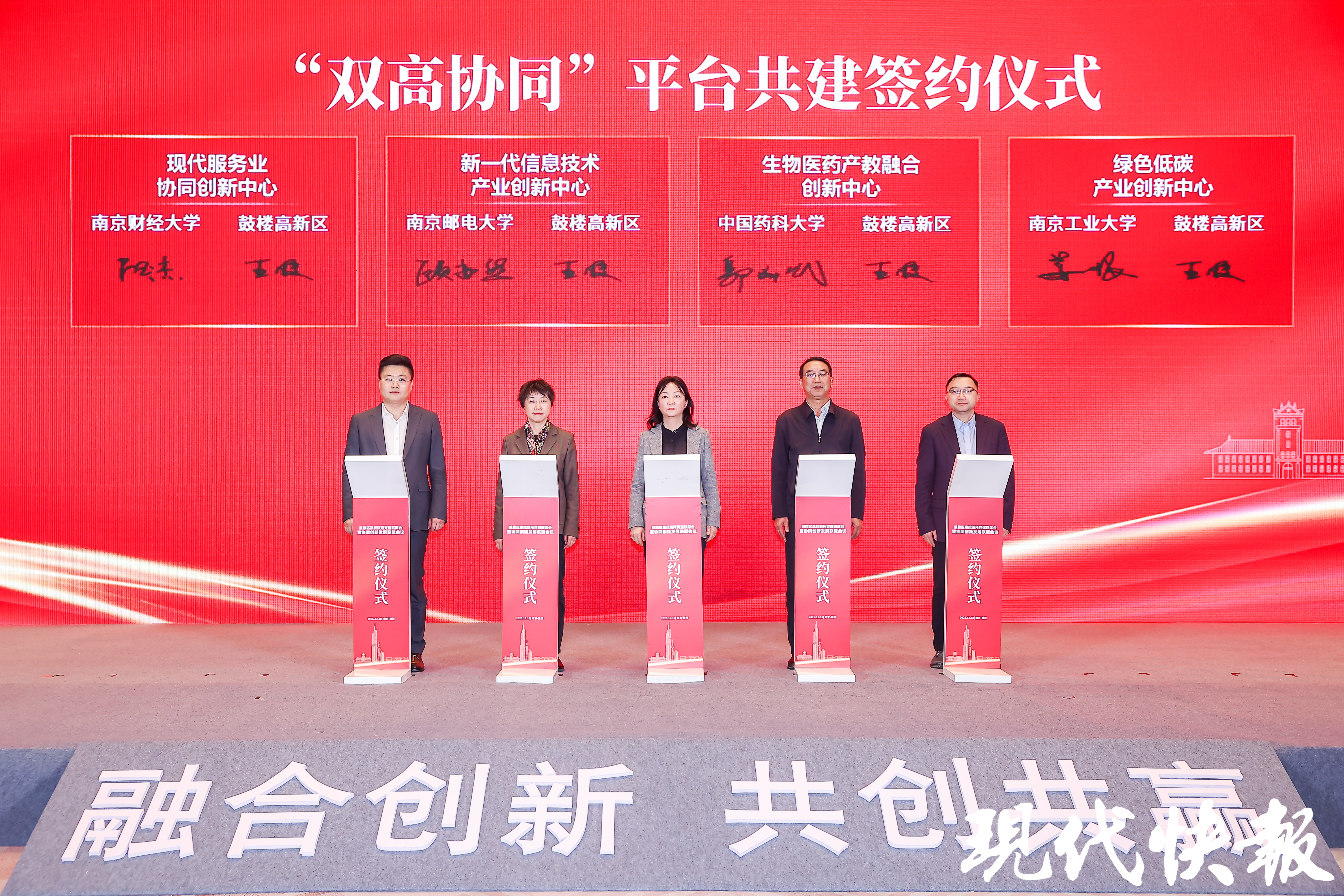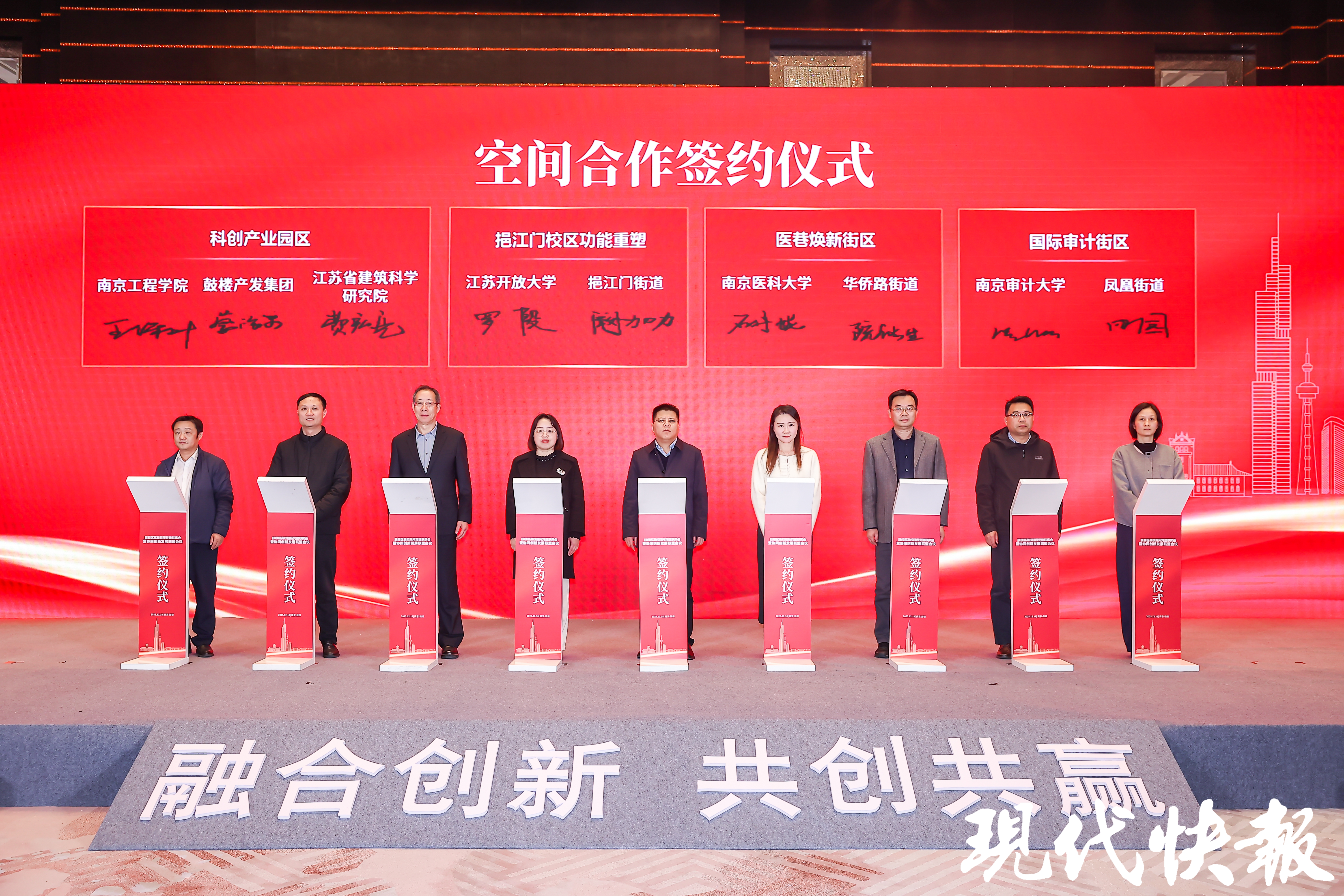 现场,环南大知识经济圈、“双高协同”校企地联合创新社区、江苏省青少年科创中心鼓楼基地依次揭牌。17个项目从平台、空间、项目、人才等维度开展集中签约,全面展示一年来党建引领产业科技融合创新的成果。