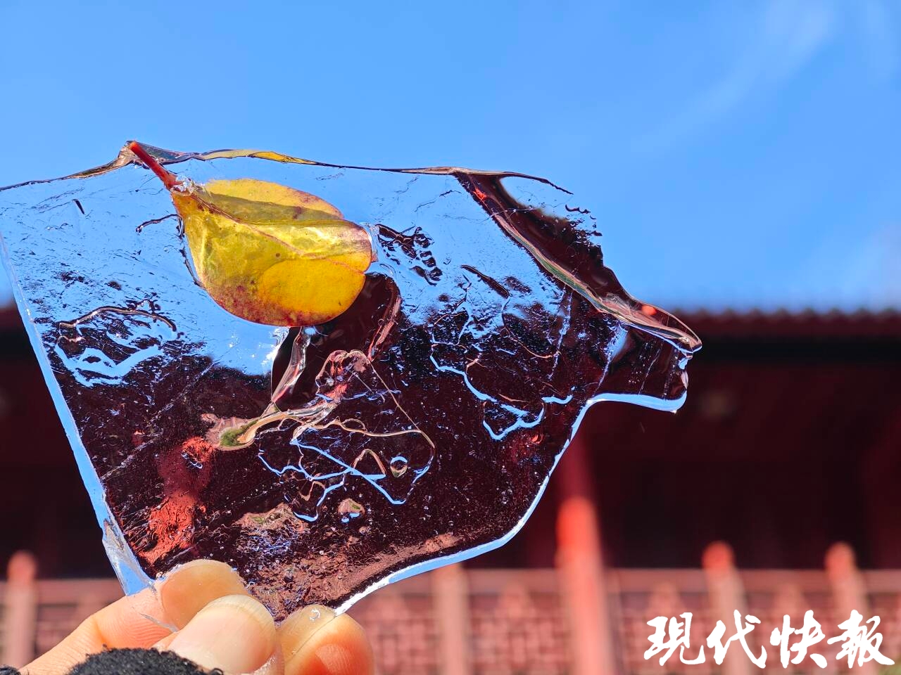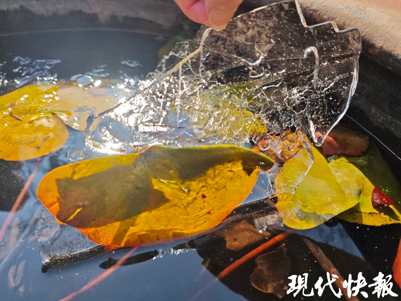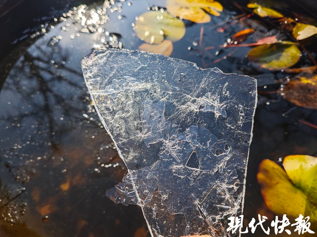 往日碧波荡漾的水面,此刻凝结成了大自然的艺术品。气泡、水纹、冰花,阳光一照,冰面倒映着澄澈的蓝天白云,仿佛将整个童话世界嵌在了水面上。这般景象,引得不少市民游客驻足观赏、拍照打卡,感受这份冬日“冰趣”。