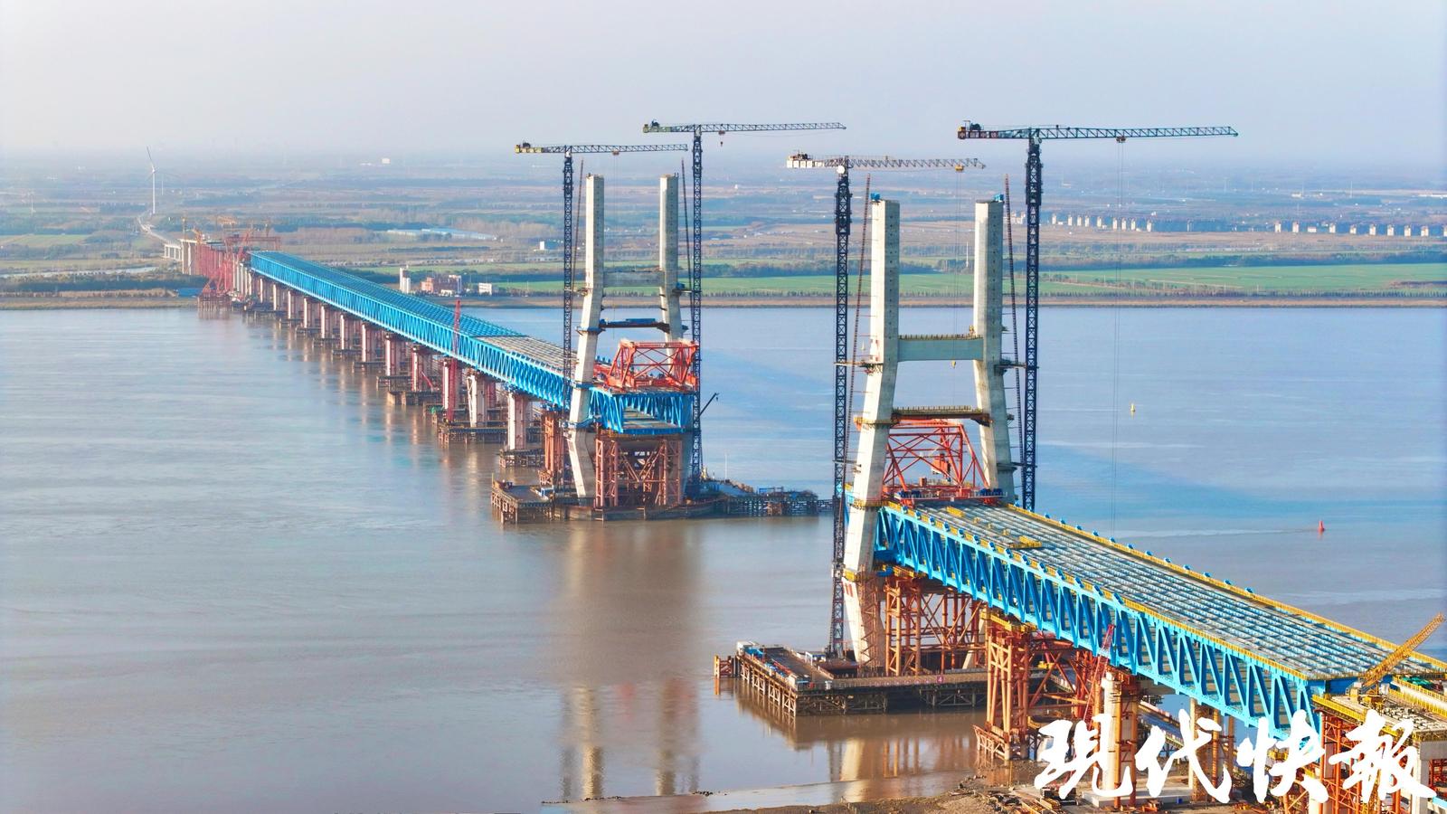 这是2026年元旦前夕拍摄于崇启公铁长江大桥,目前正在进行公路桥面板架设安装工作,大桥预计5月底前合龙 李梦竹摄
