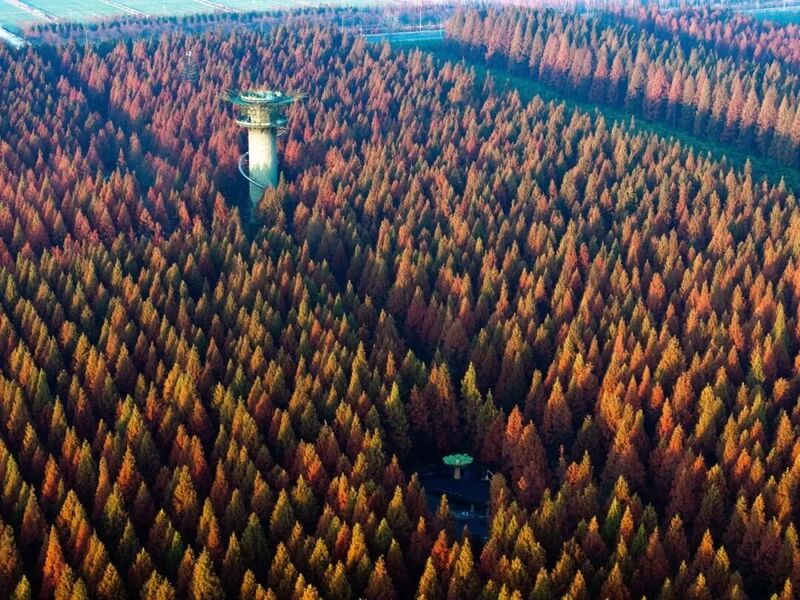 走进6.8万亩森林,水杉撑起金色穹顶,林涛奏响秋日交响曲。