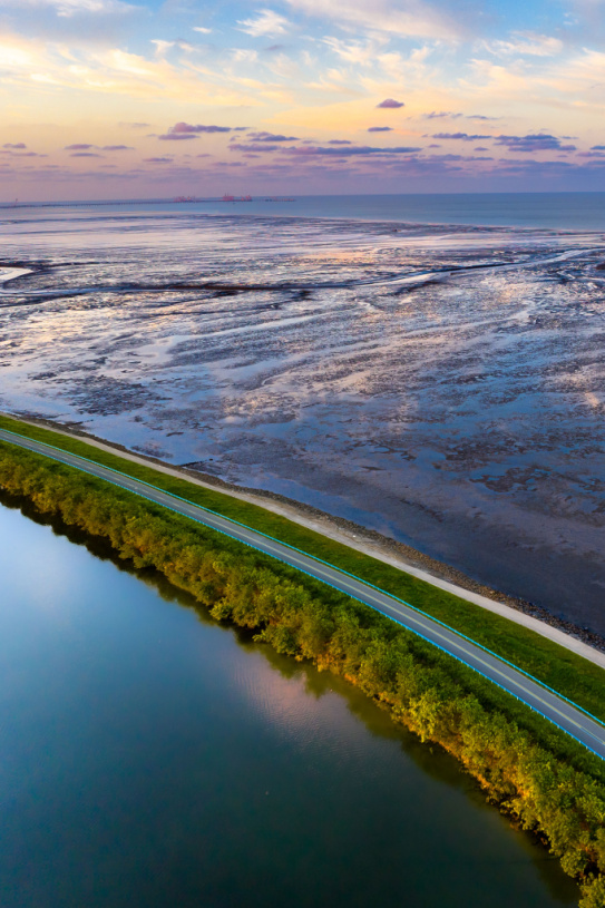 黄海1号公路完美融合了湿地生态、候鸟奇观、海洋文化,绘就出一幅连接自然遗产与人文风情的滨海景观长廊。