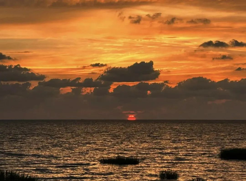 破晓时分,看红日从海平面奋力跃出,霞光染红整片湿地,万丈光芒点亮秋日苍穹。