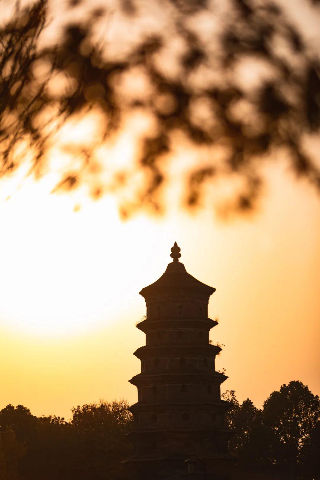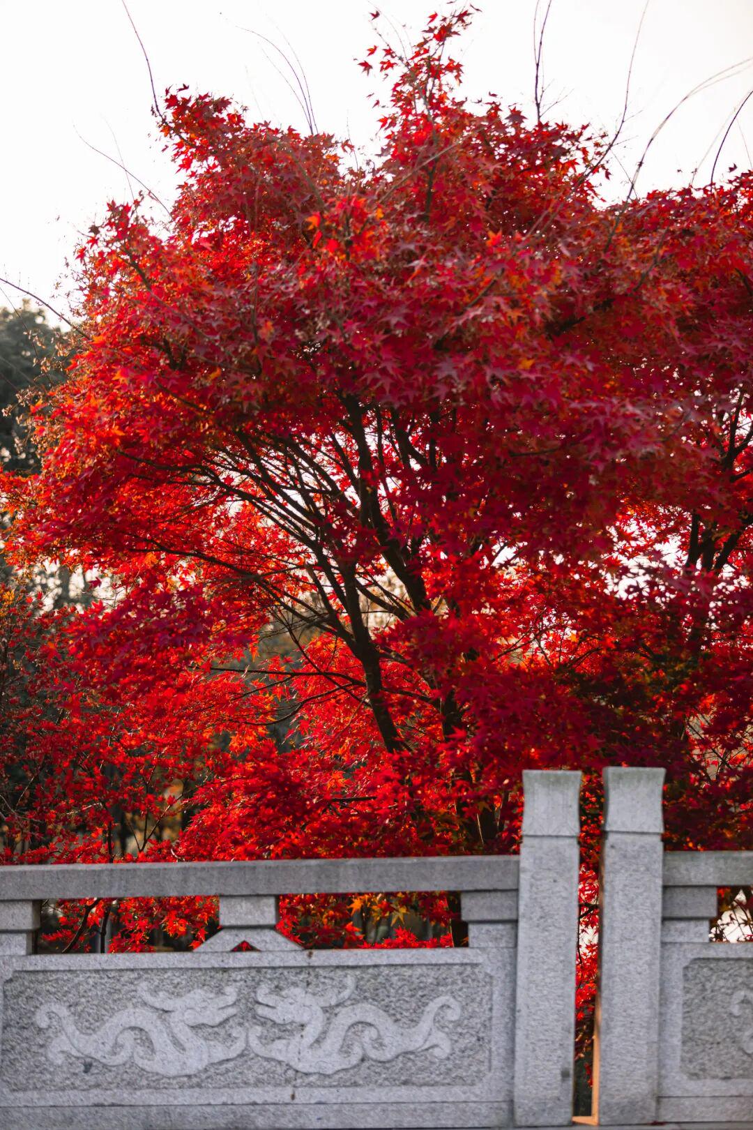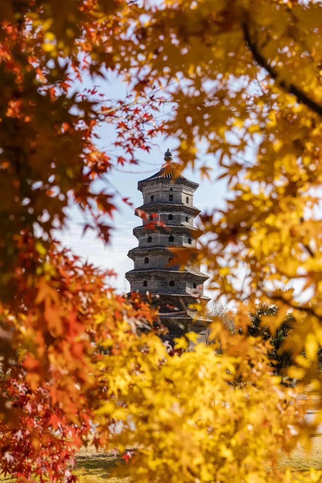 斑驳的塔身、青灰的塔砖,海春轩塔静静矗立,承载着千年岁月沧桑。火红的枫叶环绕塔身,古老的宝塔便多了几分冬日的热情与活力,诗韵与惊艳在此刻完美相融。