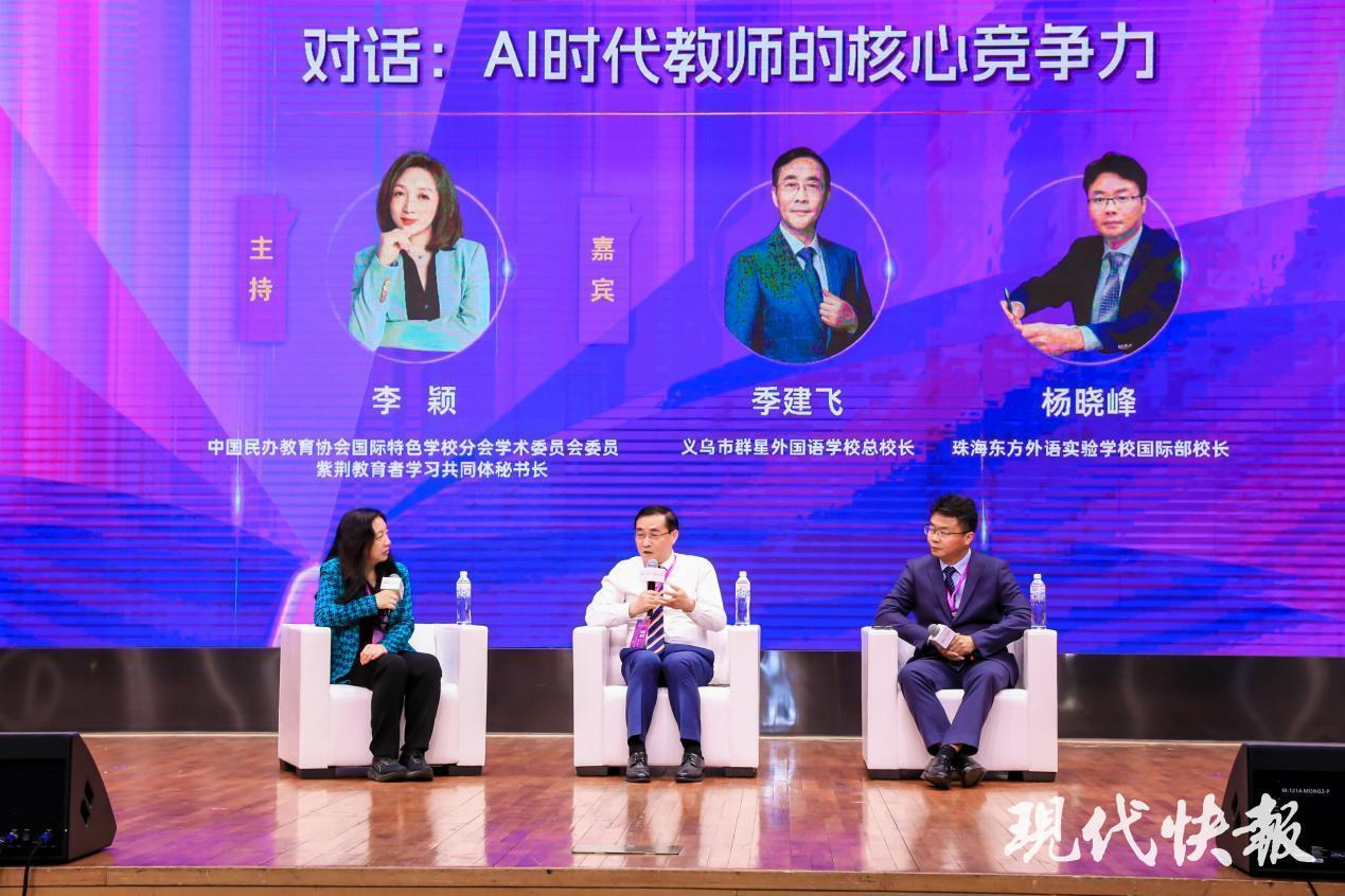 此外,大会还设计了多场对话活动。在“创新能力培养:学校教育的困境与突破”圆桌对话中,上海市平和双语学校校长万玮、南京师范大学附属中学校长朱焱、南京江北新区浦口外国语学校党总支书记陈桂萍、杭州云谷学校科创副校长卢晓飞等嘉宾,在中国民办教育协会国际特色学校分会副理事长范晓虹的主持下,探讨了学校在创新人才培养过程中面临的困境及解决策略。“AI时代教师的核心竞争力”的对话则聚焦教师发展,中国民办教育协会国际特色学校分会学术委员会委员、紫荆教育者学习共同体秘书长李颖与义乌市群星外国语学校总校长季建飞、珠海东方外语实验学校国际部校长杨晓峰深入交流了教师在AI时代应如何提升自身能力,更好地适应教育教学变革。