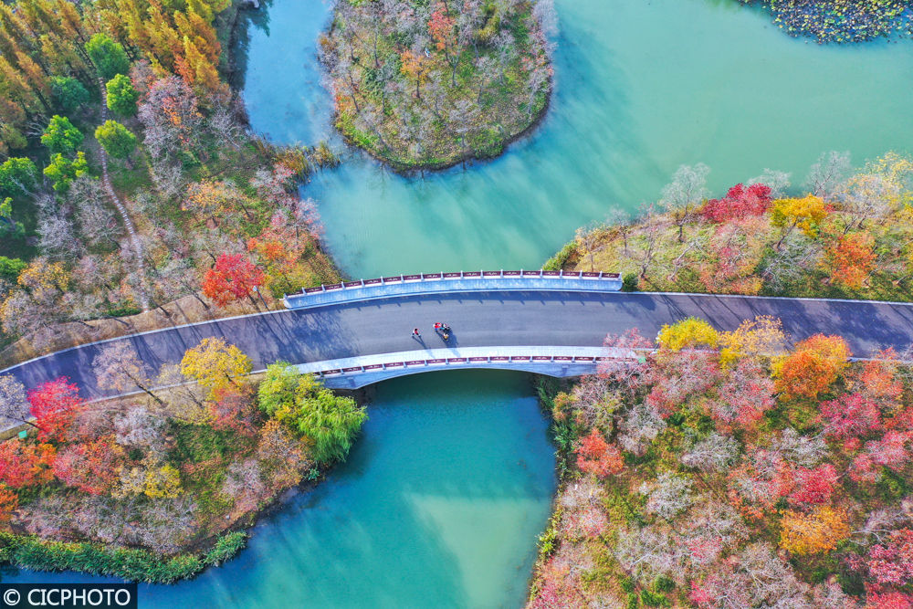↑2022年11月15日,江苏省张家港市黄泗浦文化生态园的植被五彩缤纷,景色如画。(无人机照片)CICPHOTO/施柏荣 摄