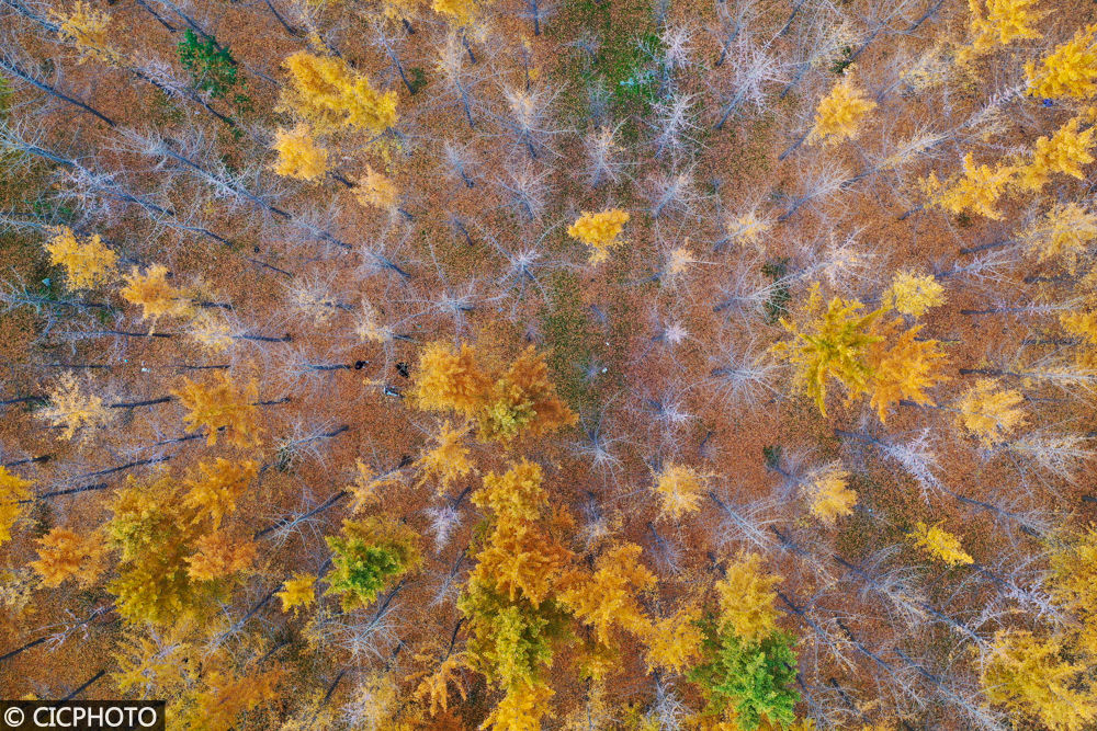↑2022年11月15日,河南省孟州市西岭生态园内色彩斑斓,美如画卷。(无人机照片)CICPHOTO/白水平 摄