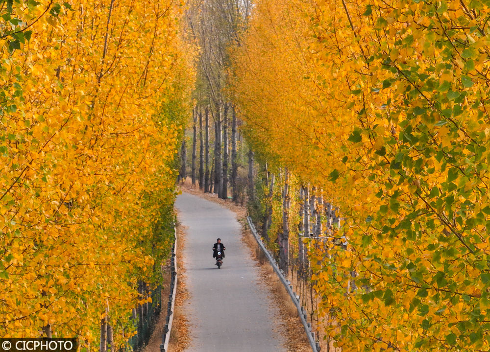 ↑2022年11月11日,山东省枣庄市薛城区乡村公路色彩斑斓,风景如画。(无人机拍摄)CICPHOTO/洪晓东 摄