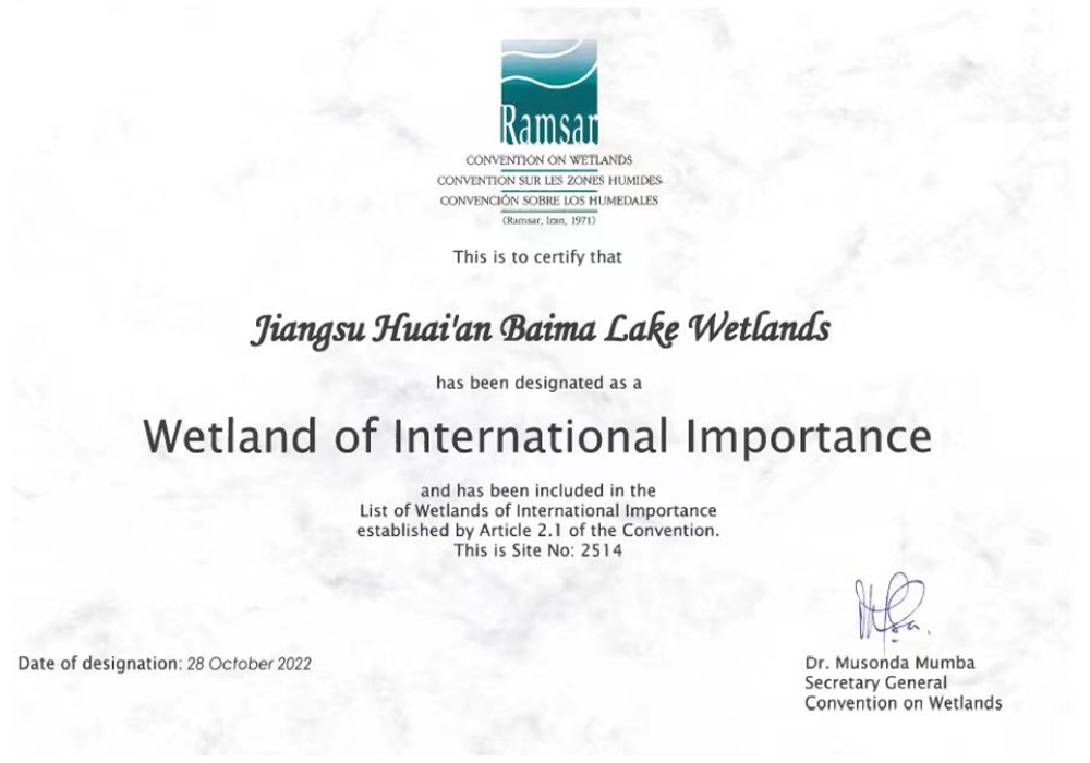 扬子晚报网5月10日讯(通讯员 张弢 记者 朱鼎兆)日前,《国际湿地公约》秘书长穆桑达·蒙巴(Musonda Mumba)博士正式签署文件,颁布淮安白马湖湿地国际重要湿地名录证书,编号2514。截至目前,我国国际重要湿地总数达82处。