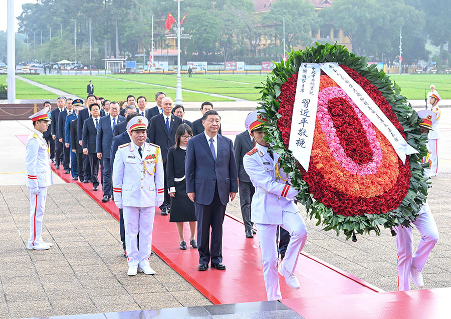 2023年,习近平总书记在访越期间来到巴亭广场,沿着载有无数历史印记的石板路,前往胡志明陵敬献花圈,追思缅怀。