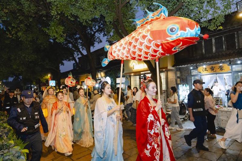 当夜色更浓,一场名为“千灯夜游”的仪式将活动推向最高潮。刹那间,定制鱼灯、绢灯同时亮起,光芒流转,灿若星河。表演者们身着华美服饰,手持传统灯具,列队巡游于古街之上,再现了“夜市千灯照碧云”的古典盛景。