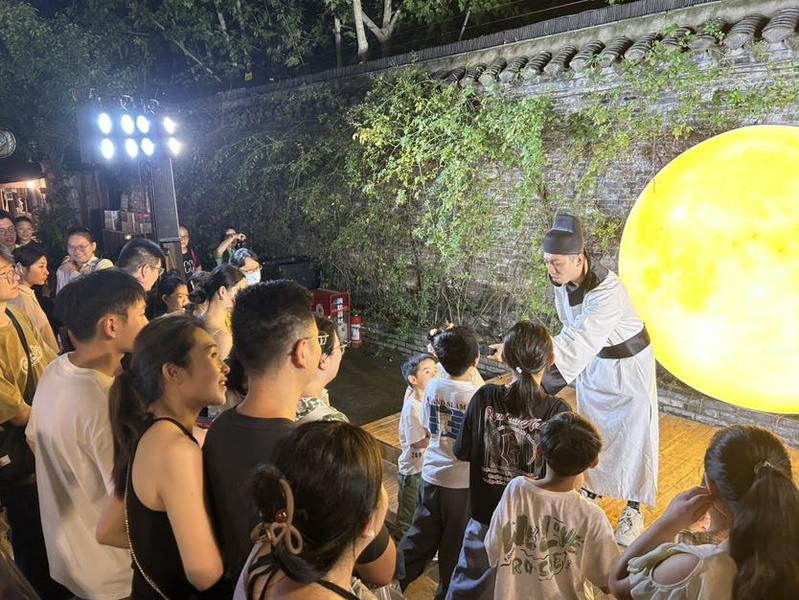人流顺着街道向北涌动,皮市街北段的小舞台区域已是欢声雷动。一位衣袂飘飘的“诗仙李白”正与台下观众激情对诗。“君不见黄河之水天上来”“奔流到海不复回!”对答声、喝彩声此起彼伏。成功接上诗句的幸运游客,不仅能收获满堂彩,还能从“李白”手中获得一份沁凉的冰淇淋作为奖品,古今交融的趣味互动,让诗词文化变得可亲可感,也将现场气氛一次次推向高潮。
